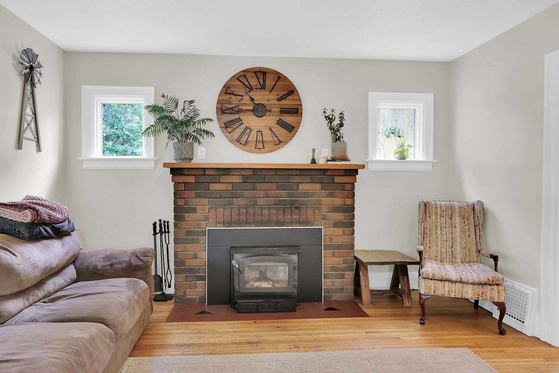 • Spacious living room with a cozy wood burning fireplace for winter nights.