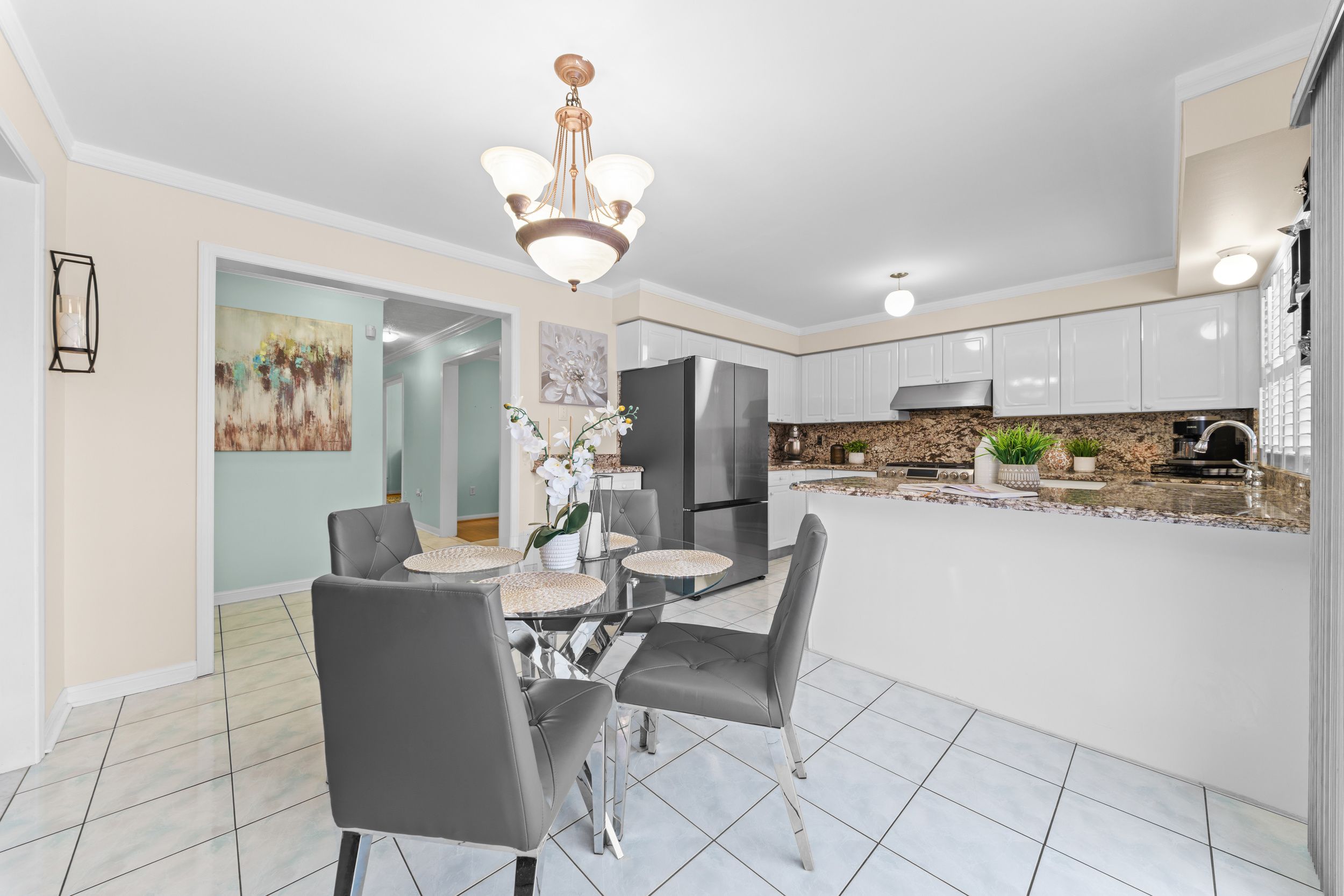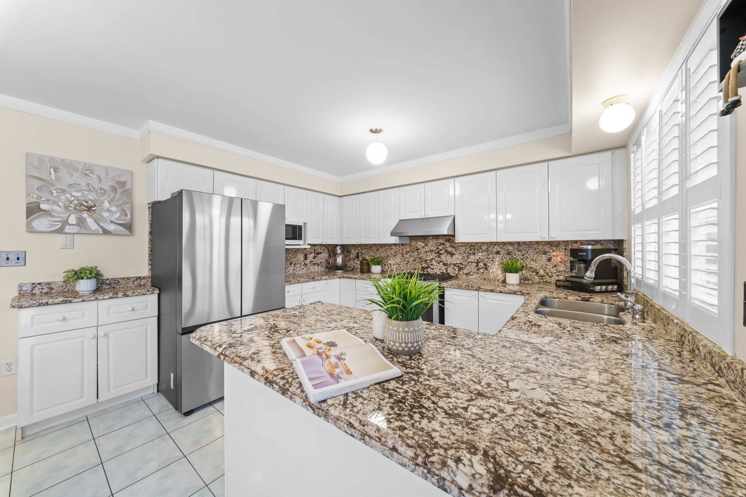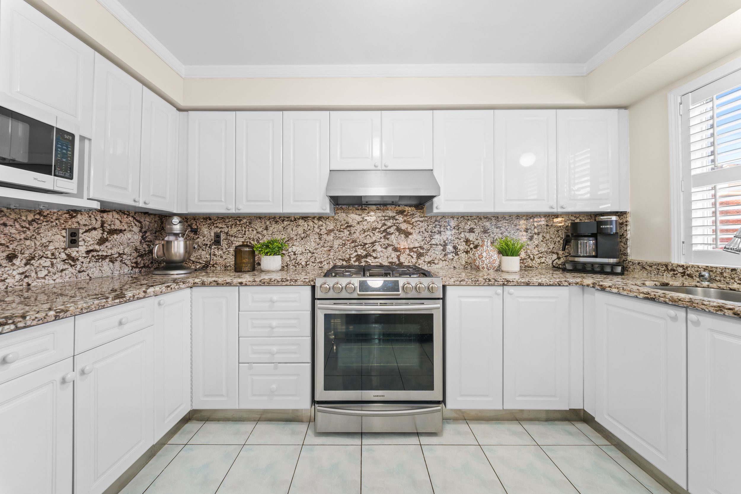 • Custom bright white kitchen with stainless steel appliances and granite countertops.