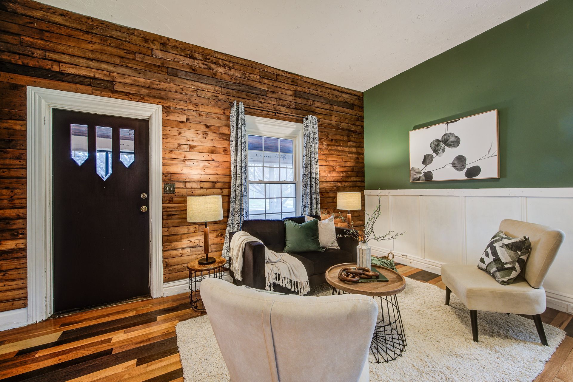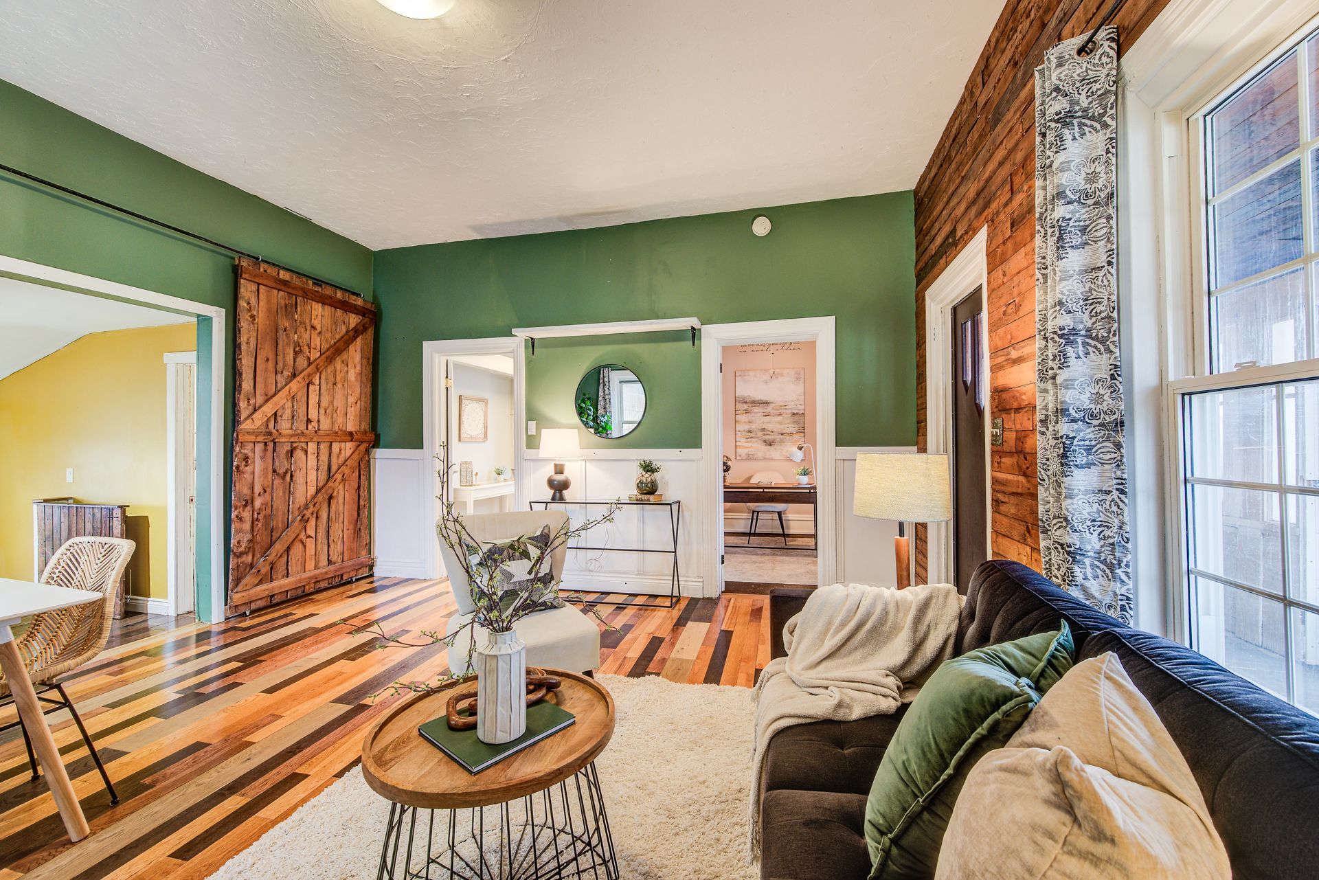 • Bright living room with high ceilings and a cozy atmosphere.