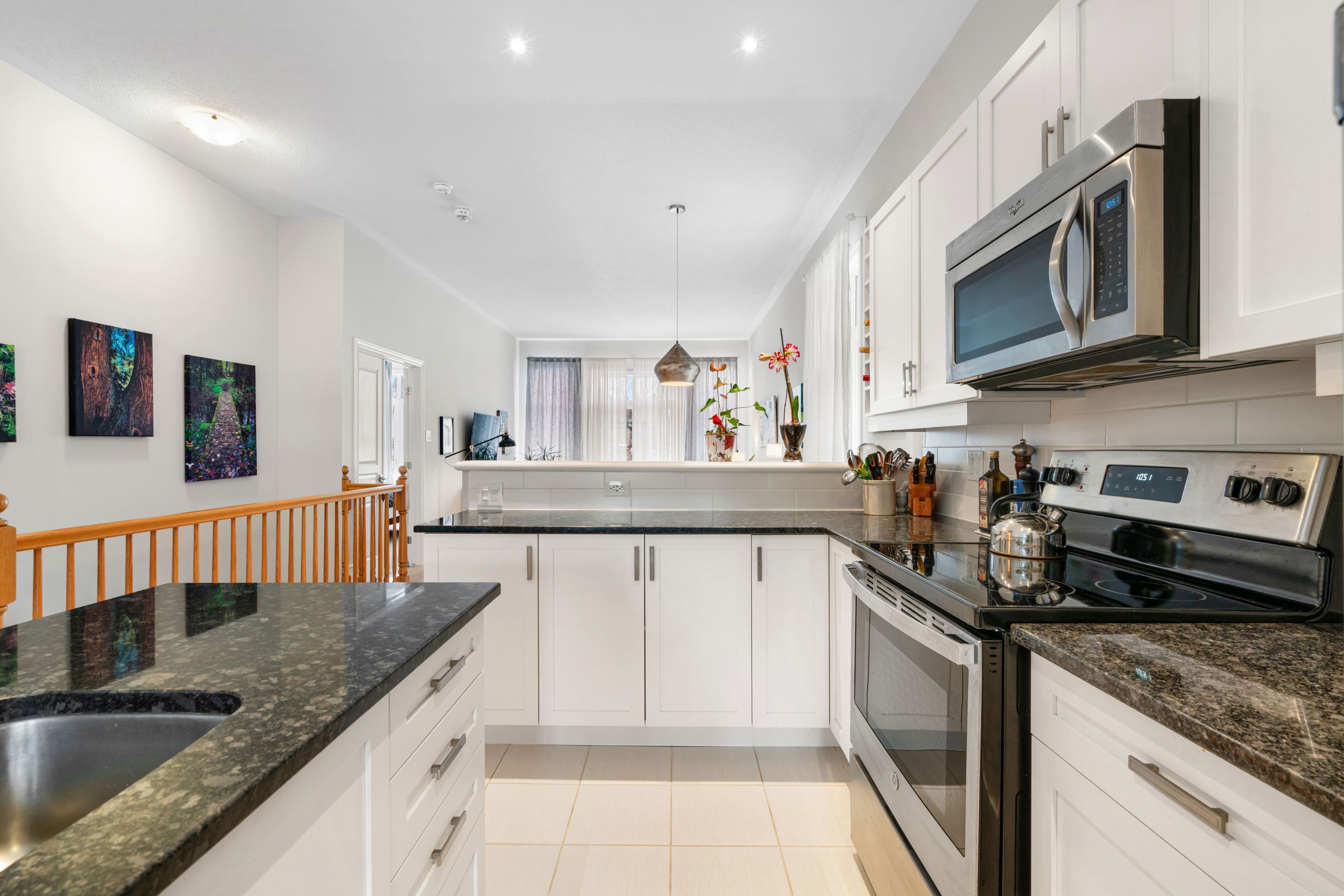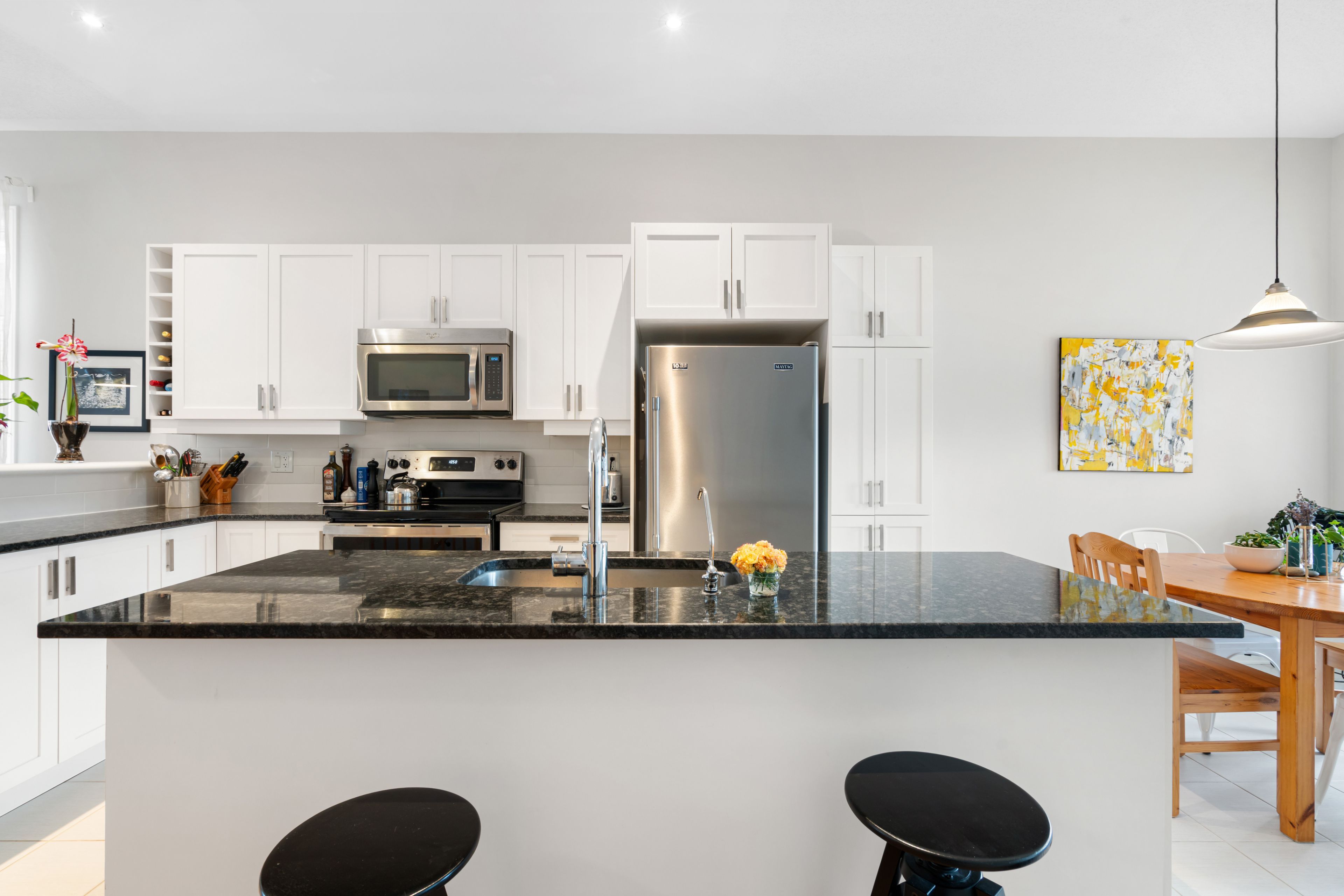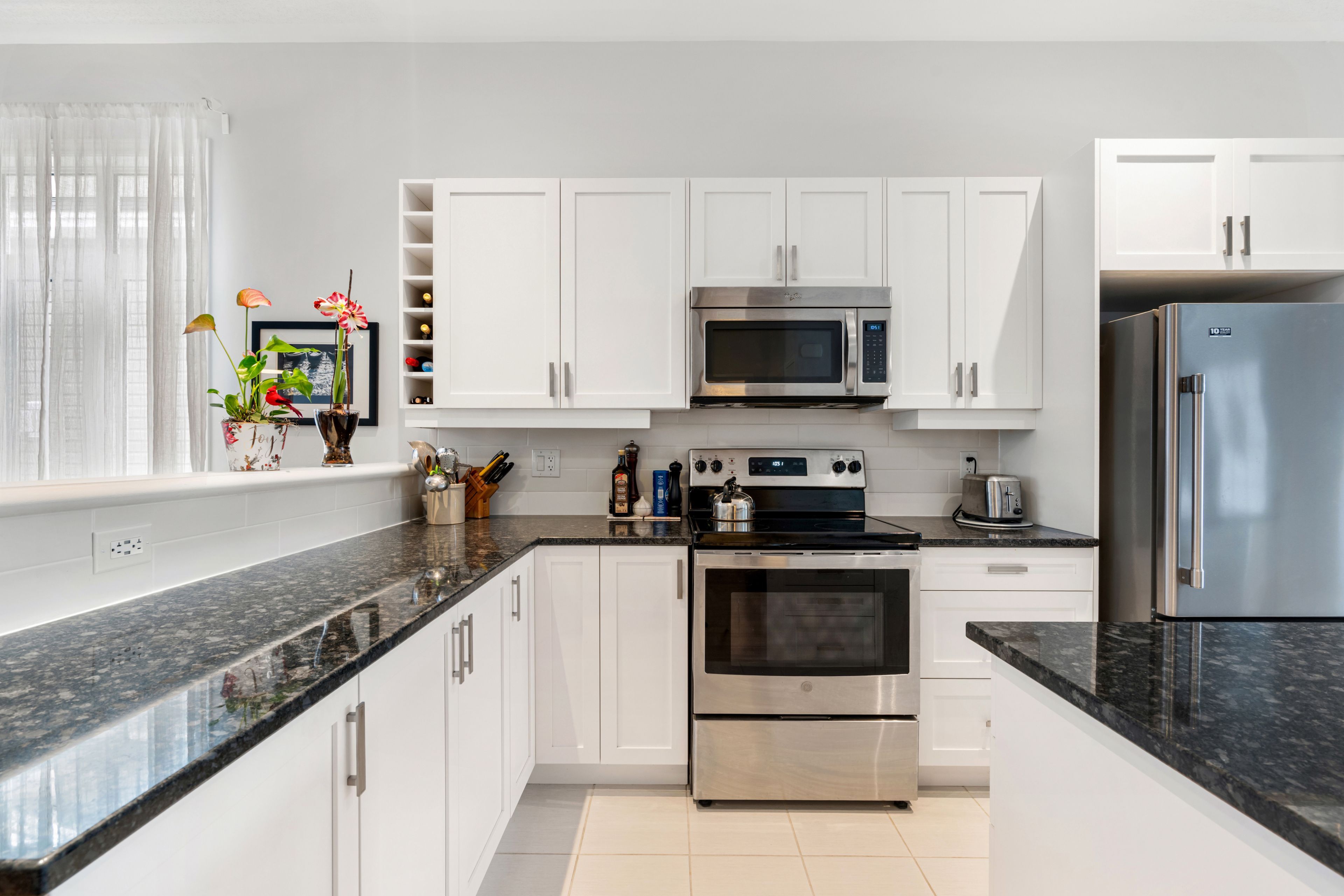 • Kitchen features white cabinetry, dark granite countertops, and stainless appliances.