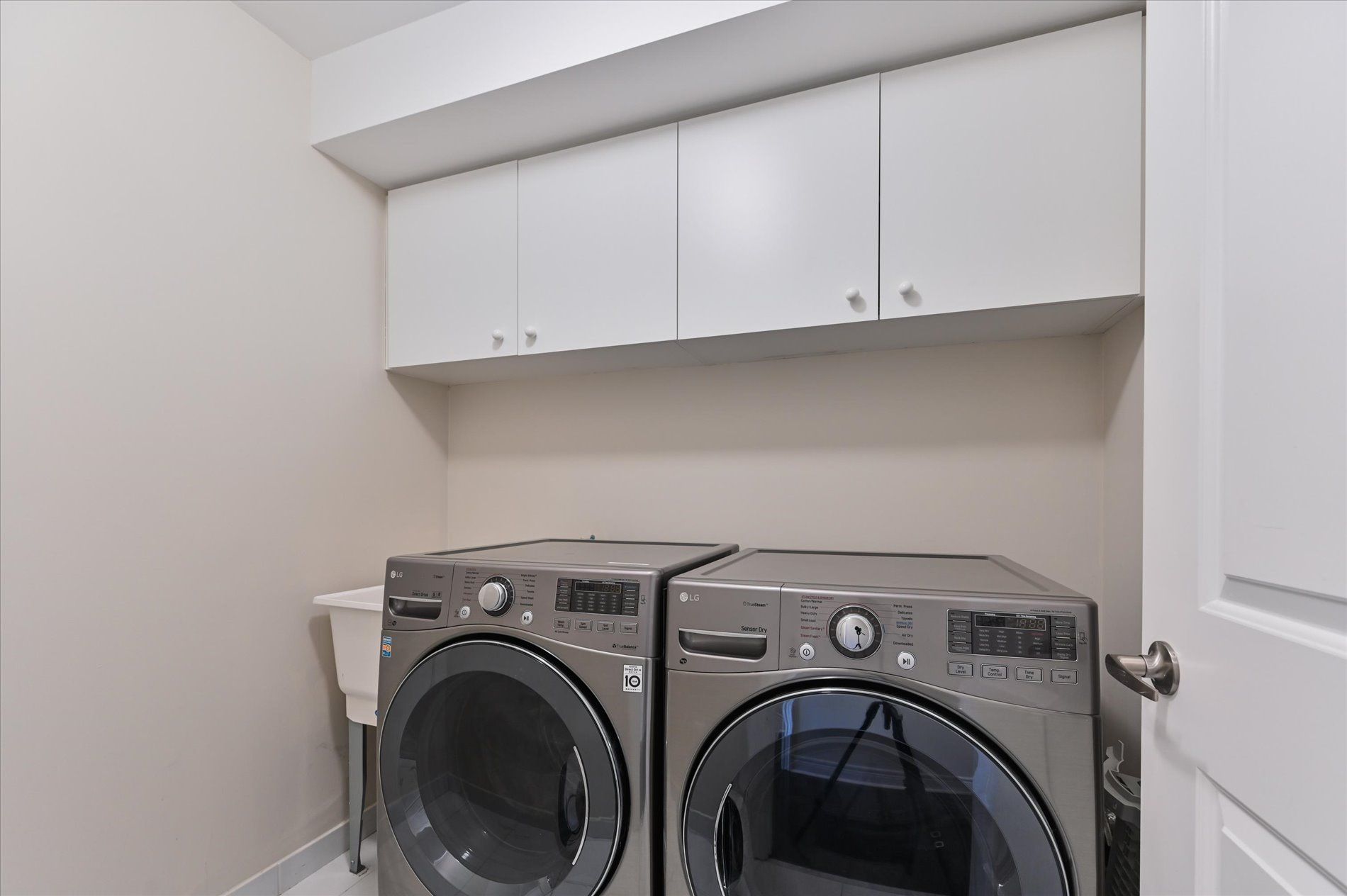 • Convenient upper-level laundry and tandem two-car garage with fresh paint.
