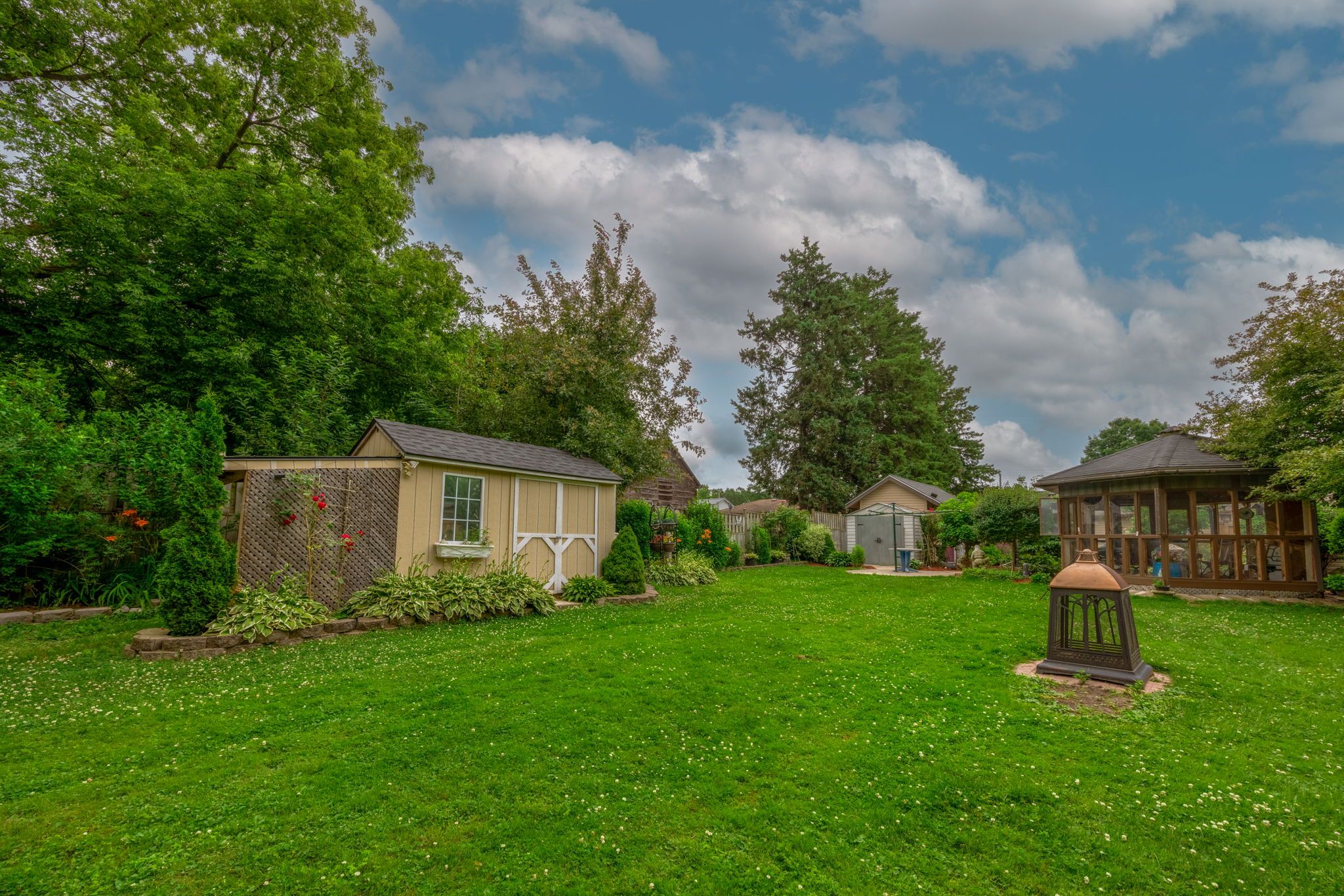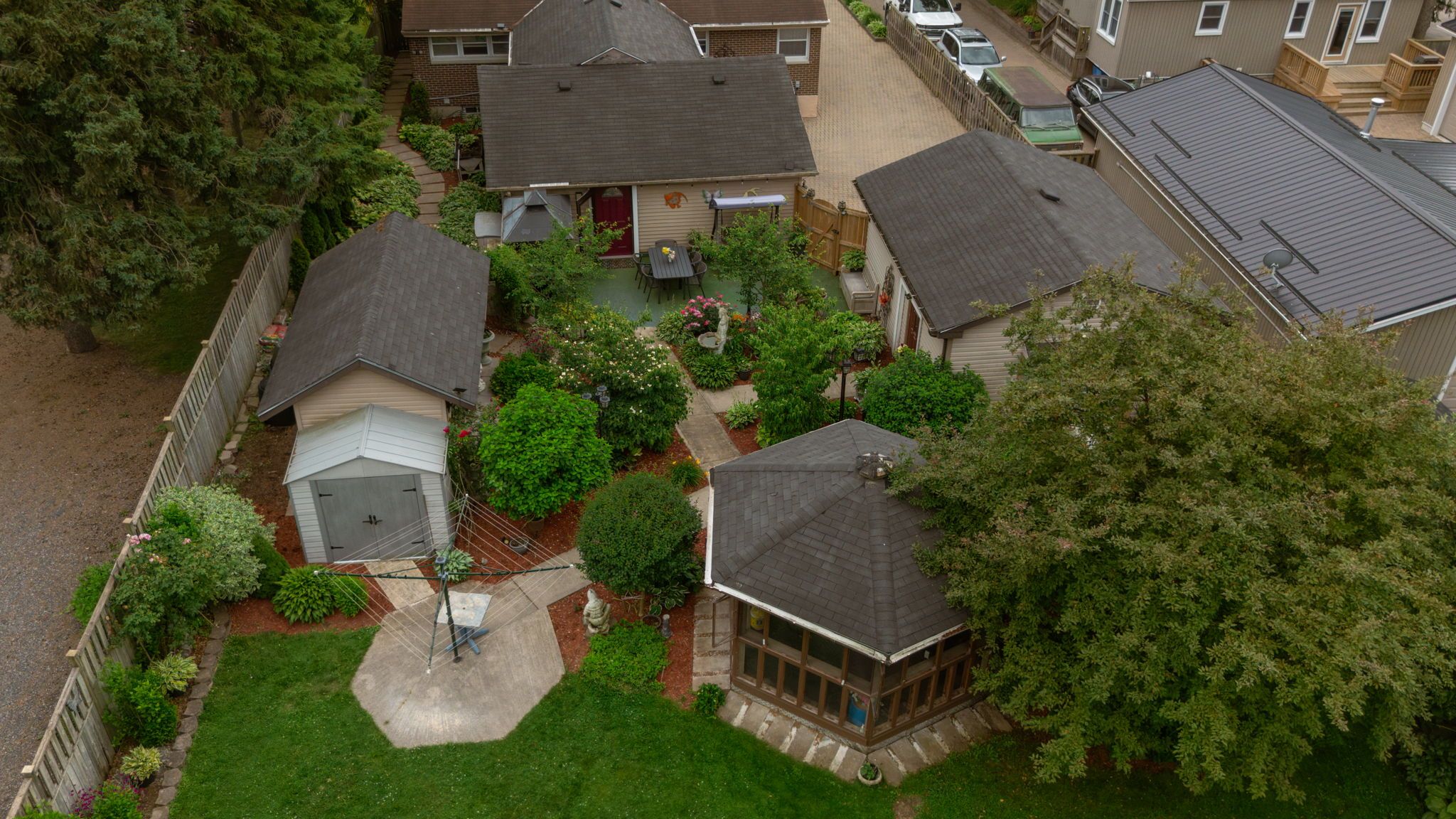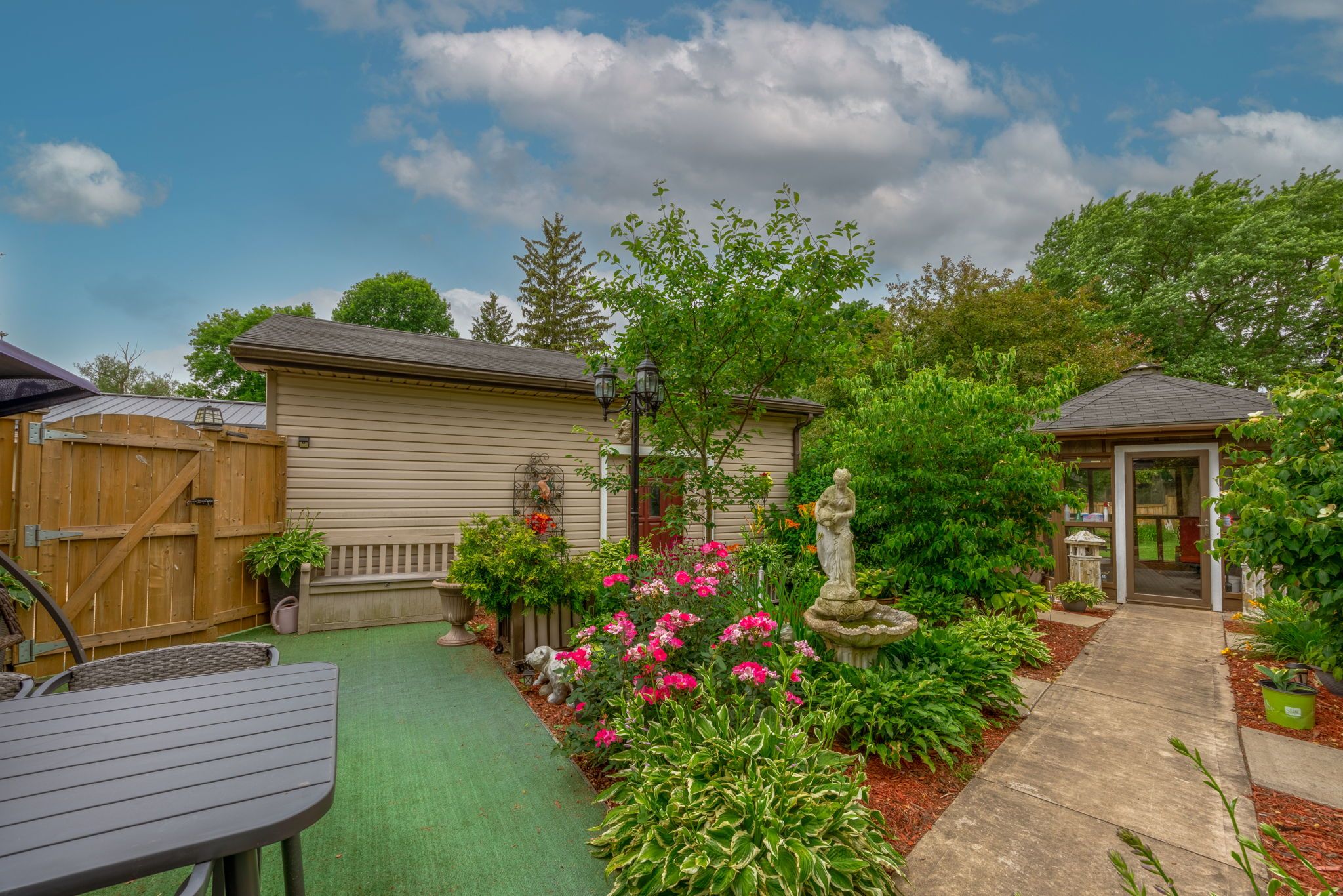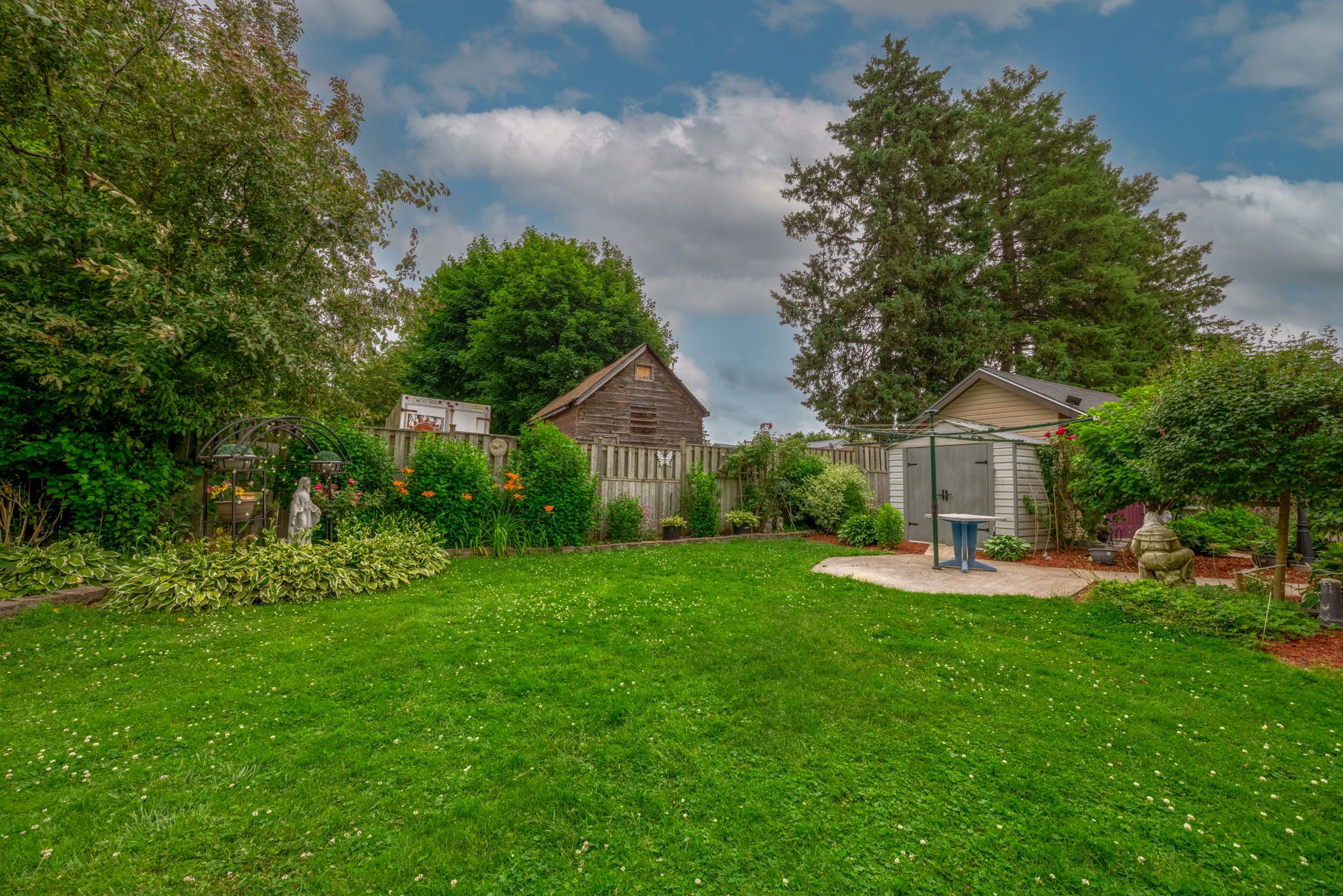 Pride of ownership shines in this beautiful bungalow. Tucked away on a quiet street, this versatile home features 3+2 bedrooms, 2 full bathrooms, and two separate kitchen areas - ideal for extended family or multi-generational living. The main level offers a bright welcoming living room complete with a natural gas fireplace. The kitchen is tastefully updated with granite countertops and matching backsplash. Downstairs, the finished lower level includes a private entrance to a self-contained 2-bedroom suite with its own kitchen, 4-piece bath, and laundry area. The property is equipped with 240-amp electrical service and an owned hot water heater. Outside, enjoy a stunning landscaped space featuring a large covered front porch, gazebo, two storage sheds, and a partially fenced 302-foot deep yard offering plenty of room to relax or entertain. The paved stone driveway fits up to six vehicles and is complemented by an attached double garage plus a detached single garage - perfect for extra storage, hobbies, or parking. Close to schools, parks, shopping, and everyday amenities, this well-maintained home offers space, flexibility, and long-term value in a peaceful setting.