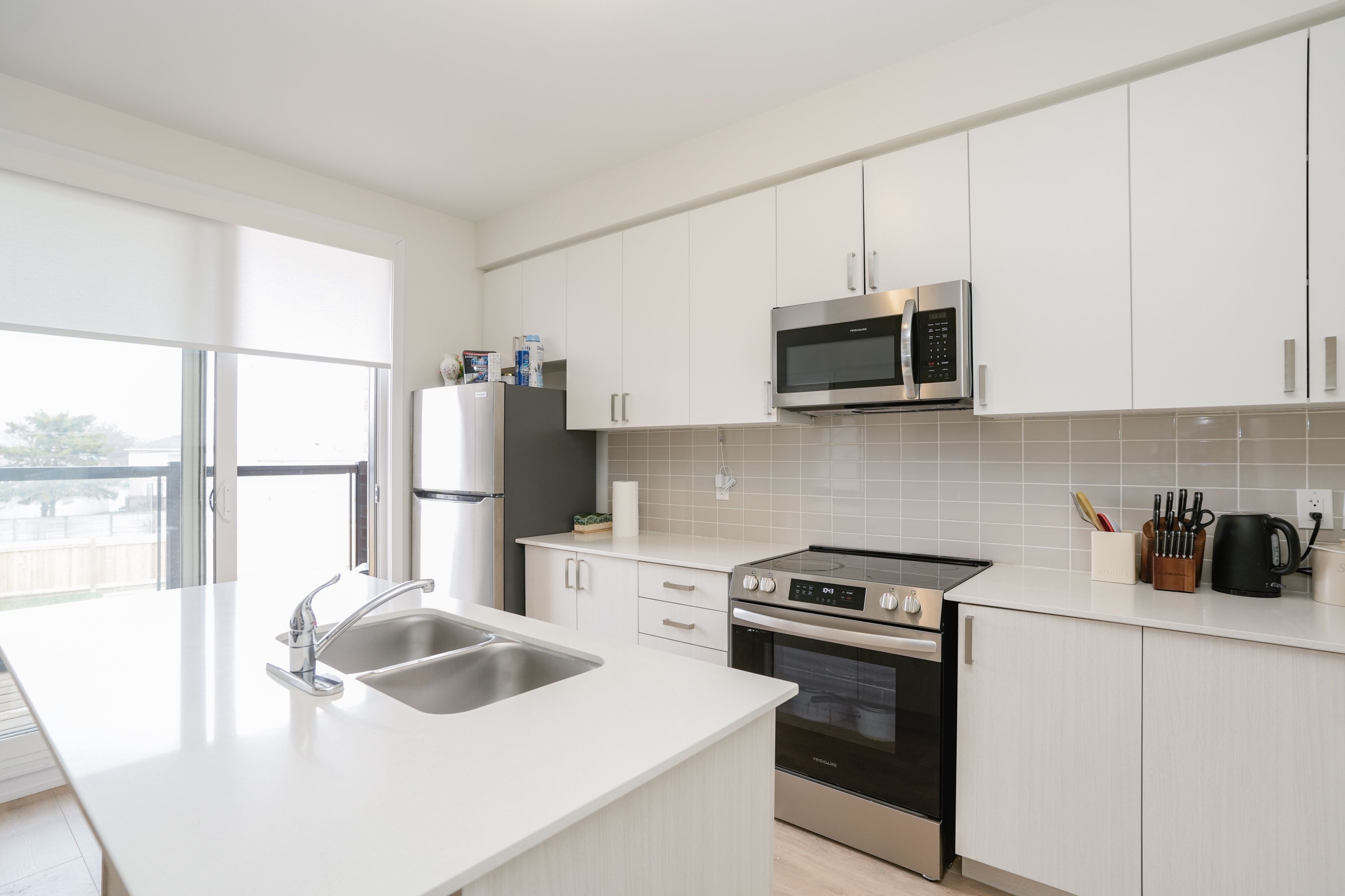 • Sun-filled main level with balcony, contemporary kitchen, and stainless steel appliances.