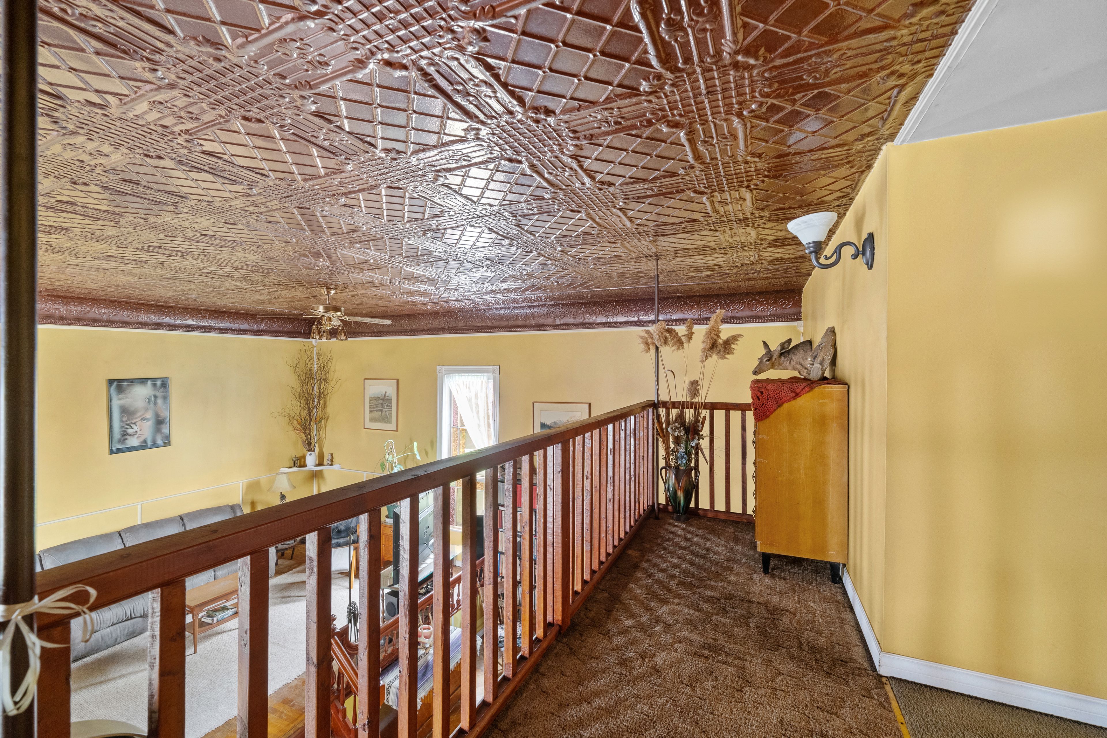 • Expansive living room features cathedral ceilings and stained-glass windows.