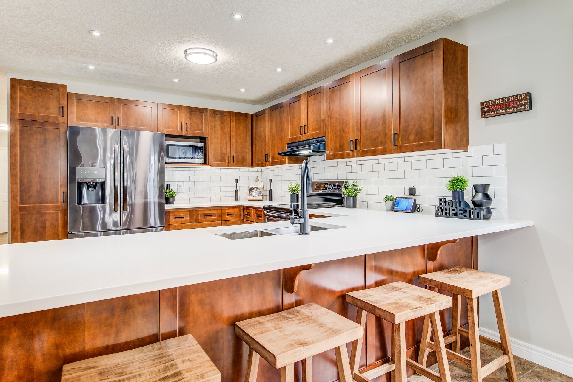 • Bright kitchen with quartz countertops and a stylish backsplash.