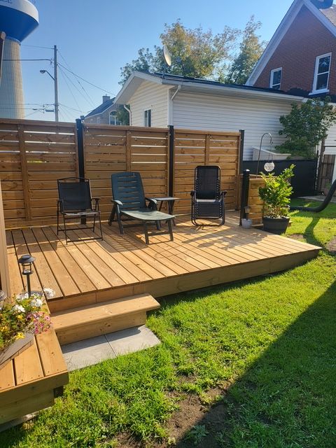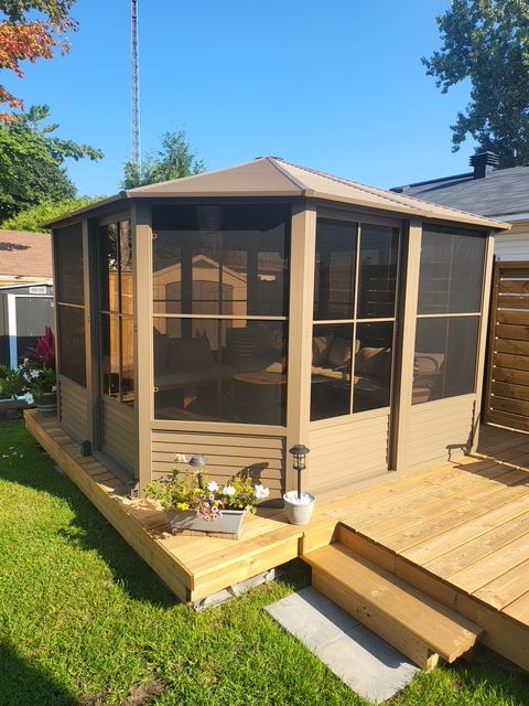 • Private fenced yard with landscaped features, gazebo, and extended deck.
