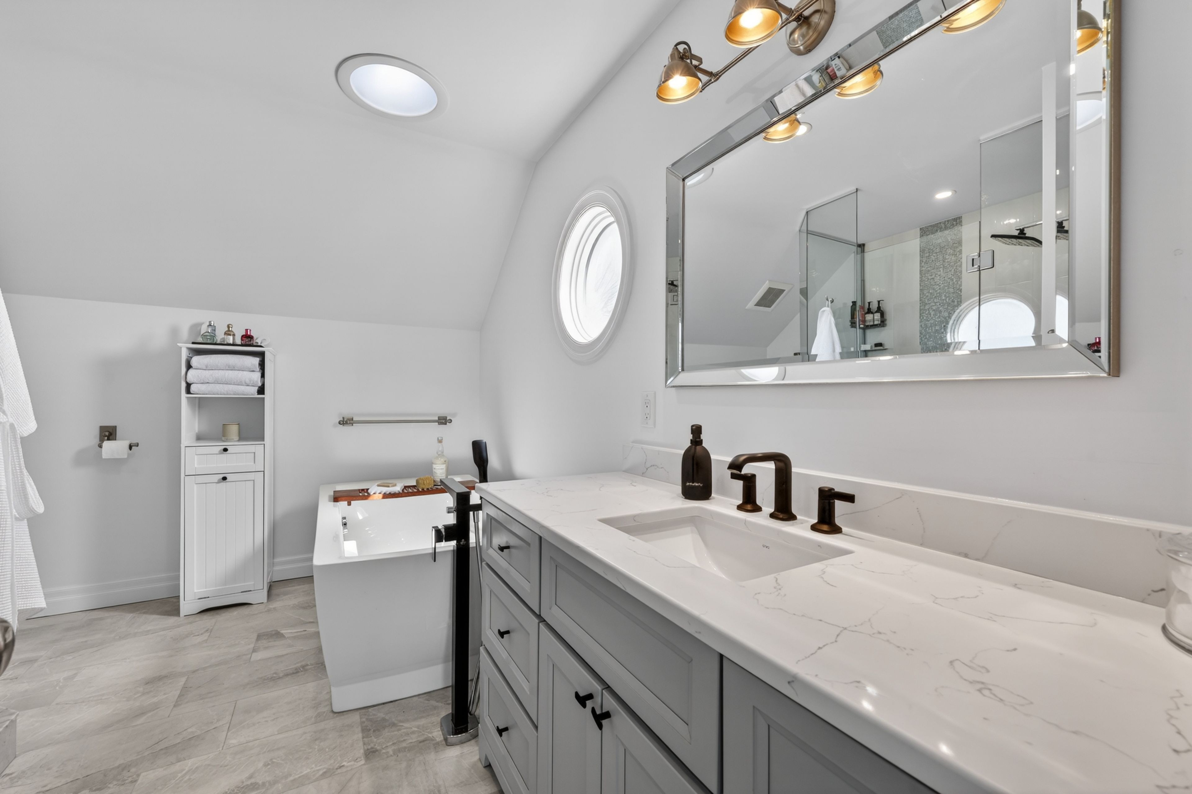 • Fully finished lower level with recreation room and spa-inspired bathroom.
