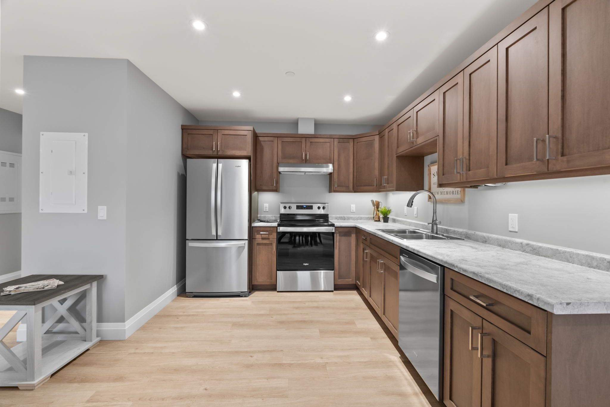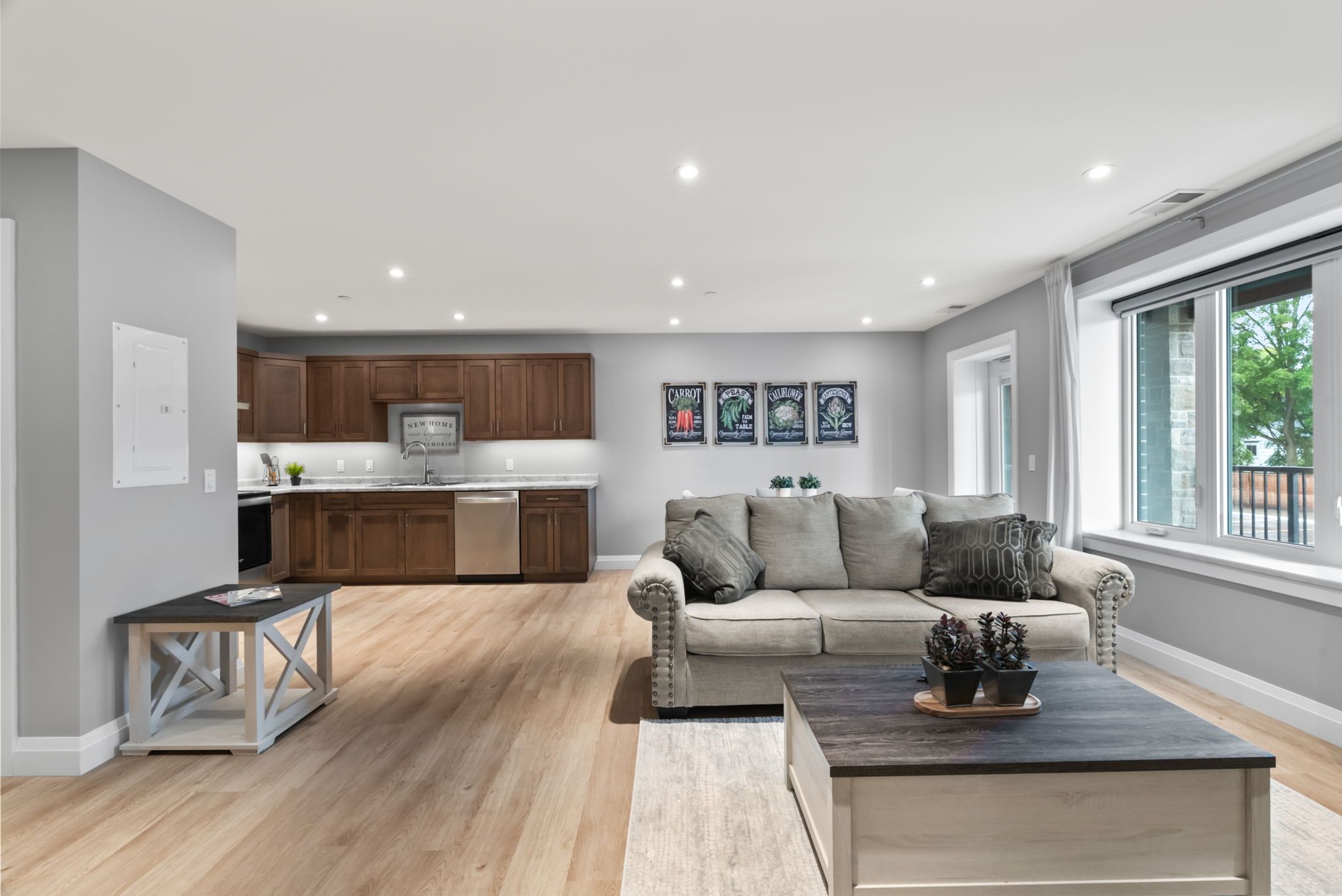 • Open concept living and kitchen area with stainless steel appliances.