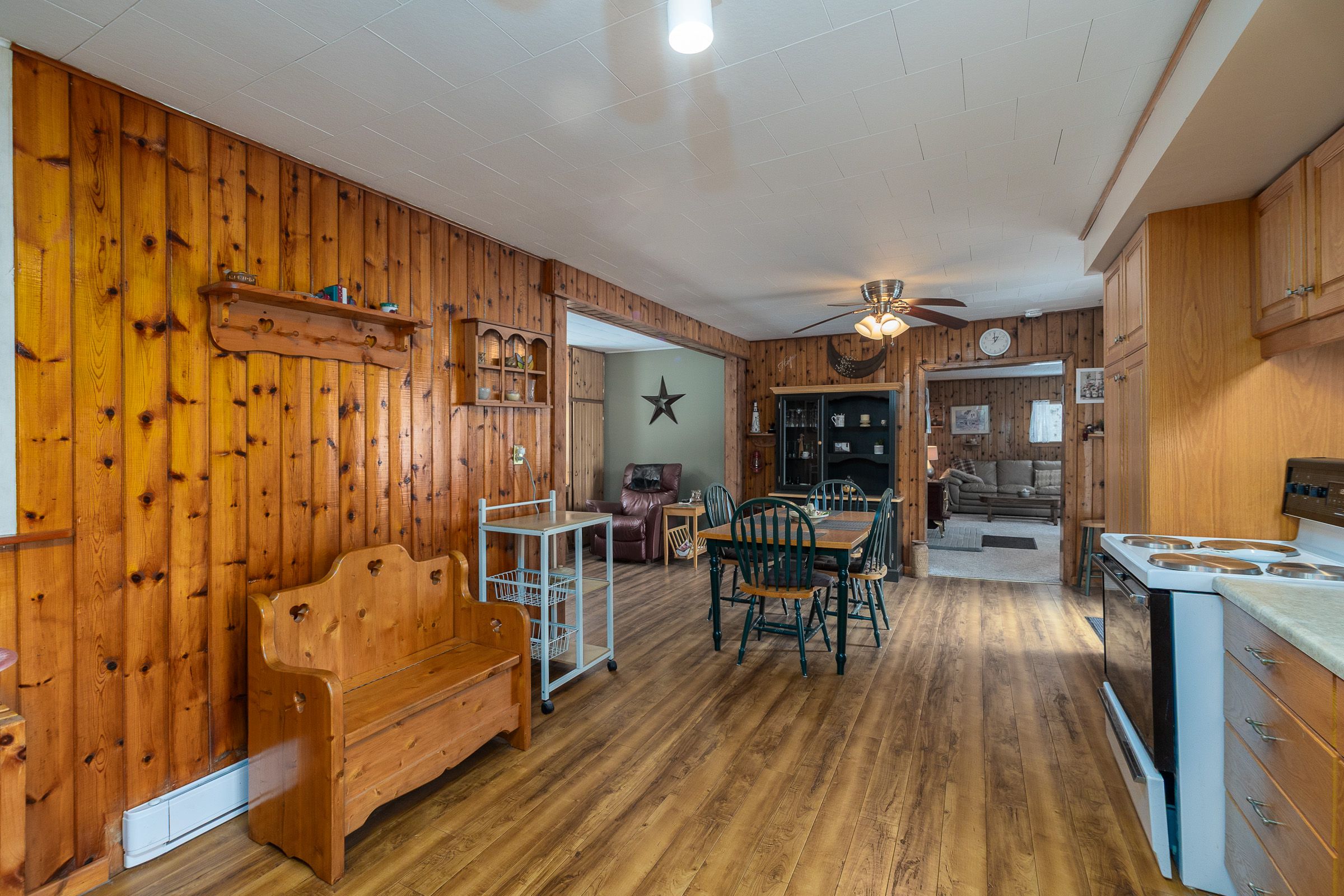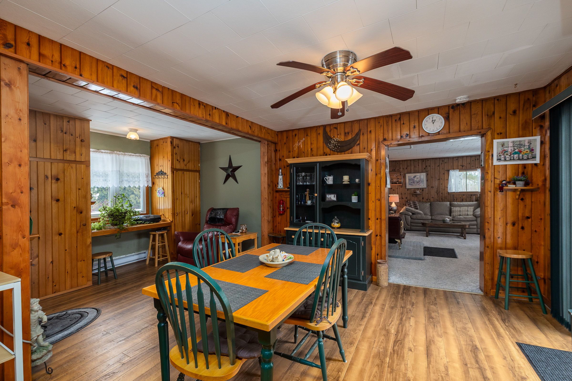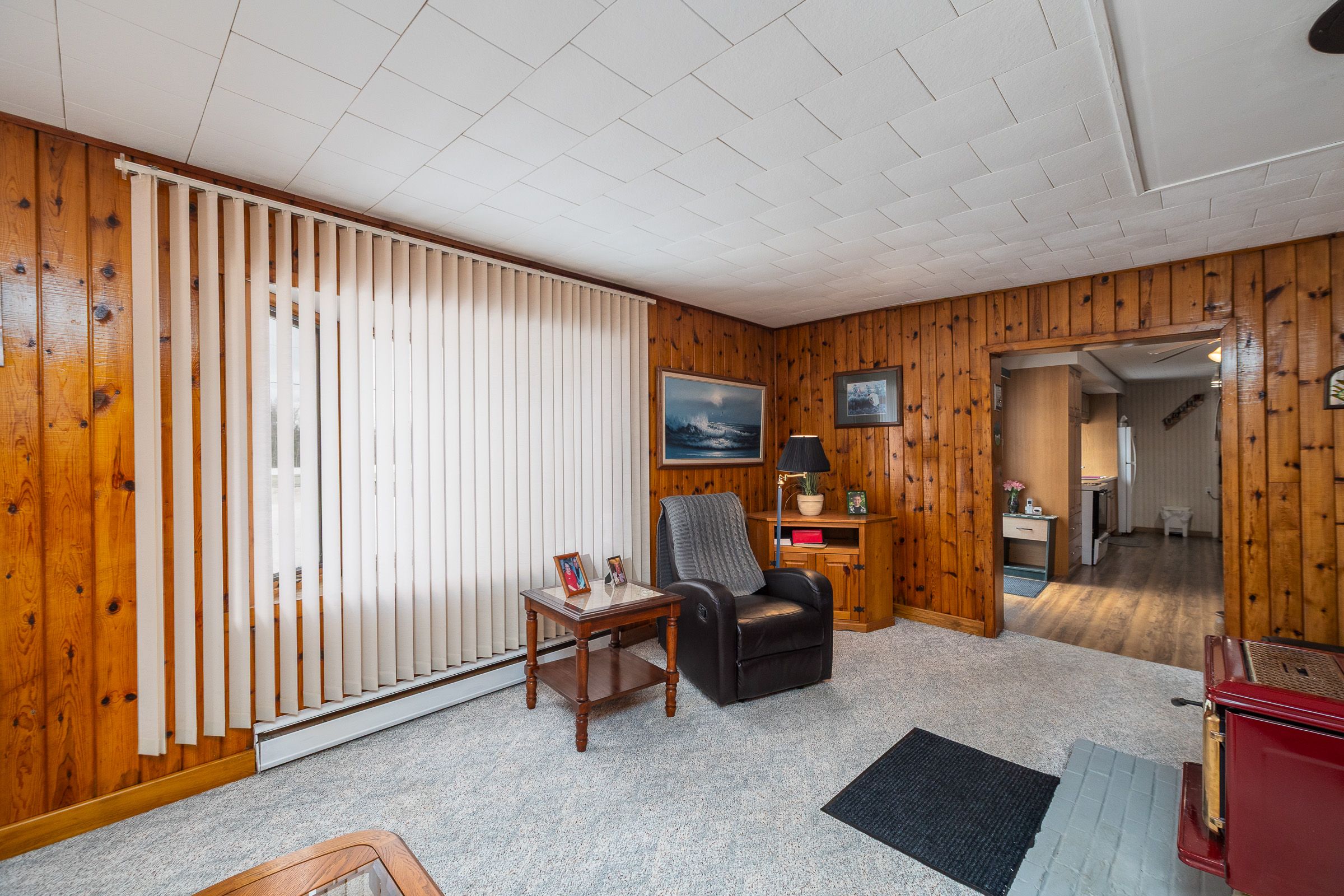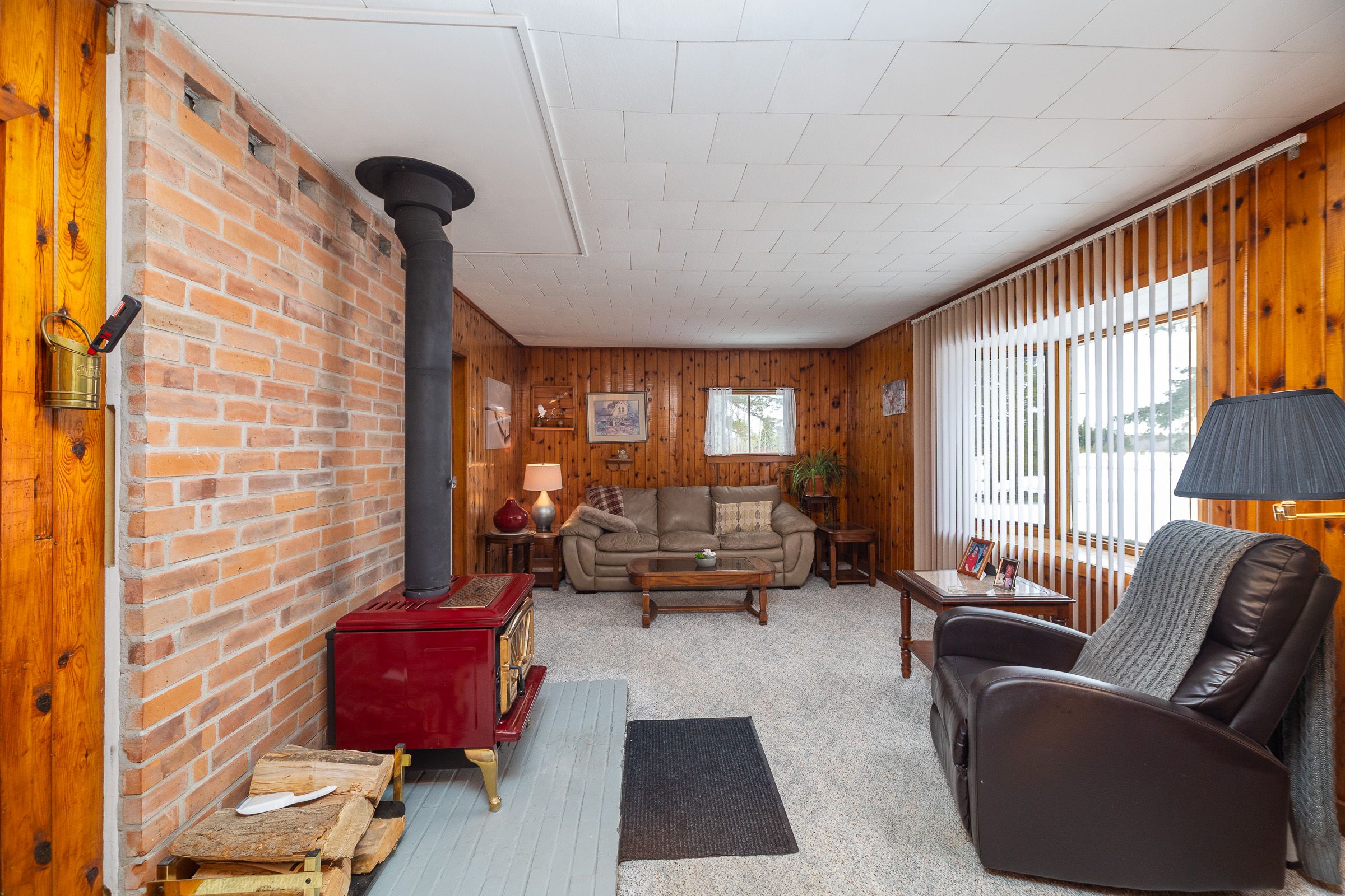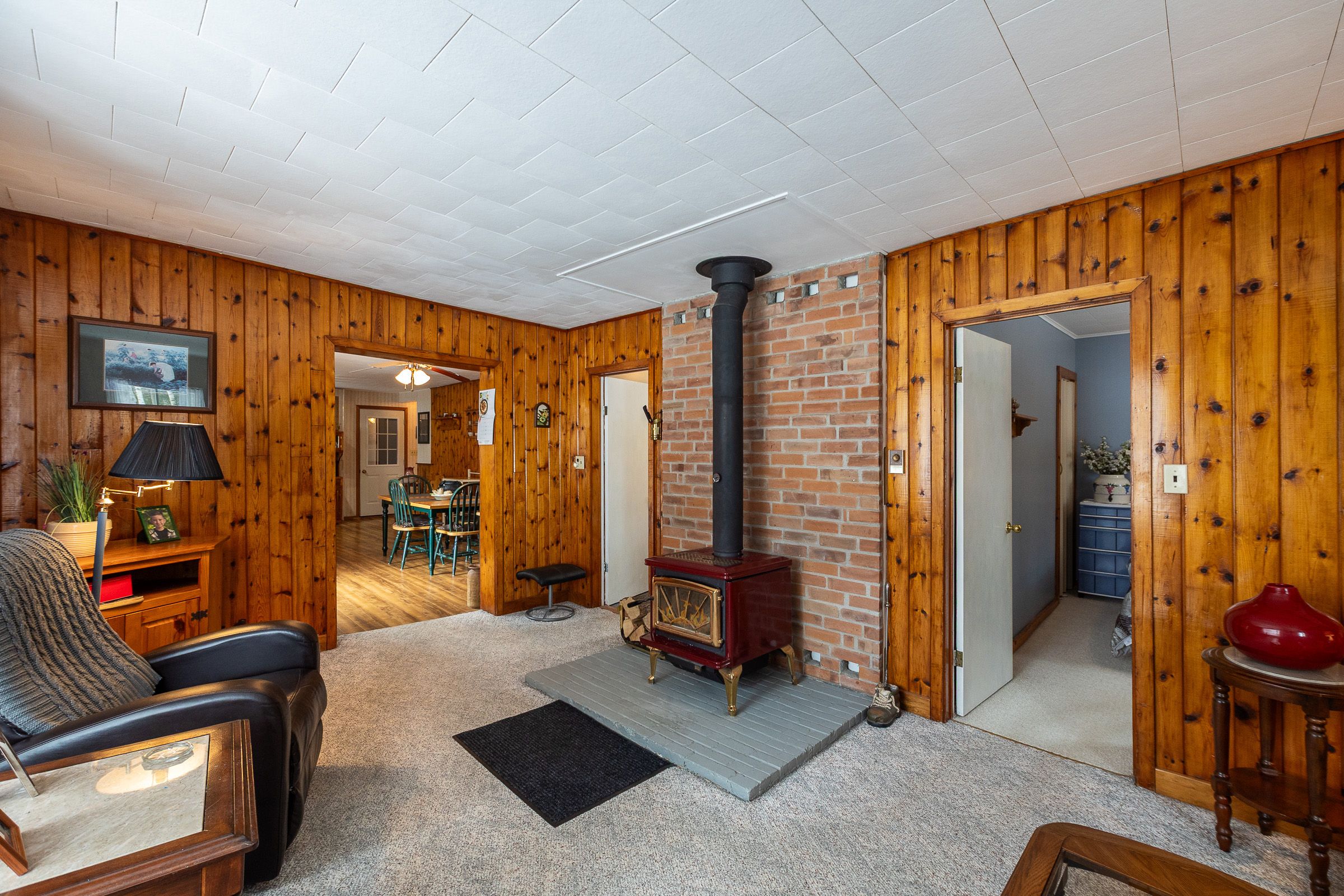 • Cozy wood stove adds warmth to open living spaces.
