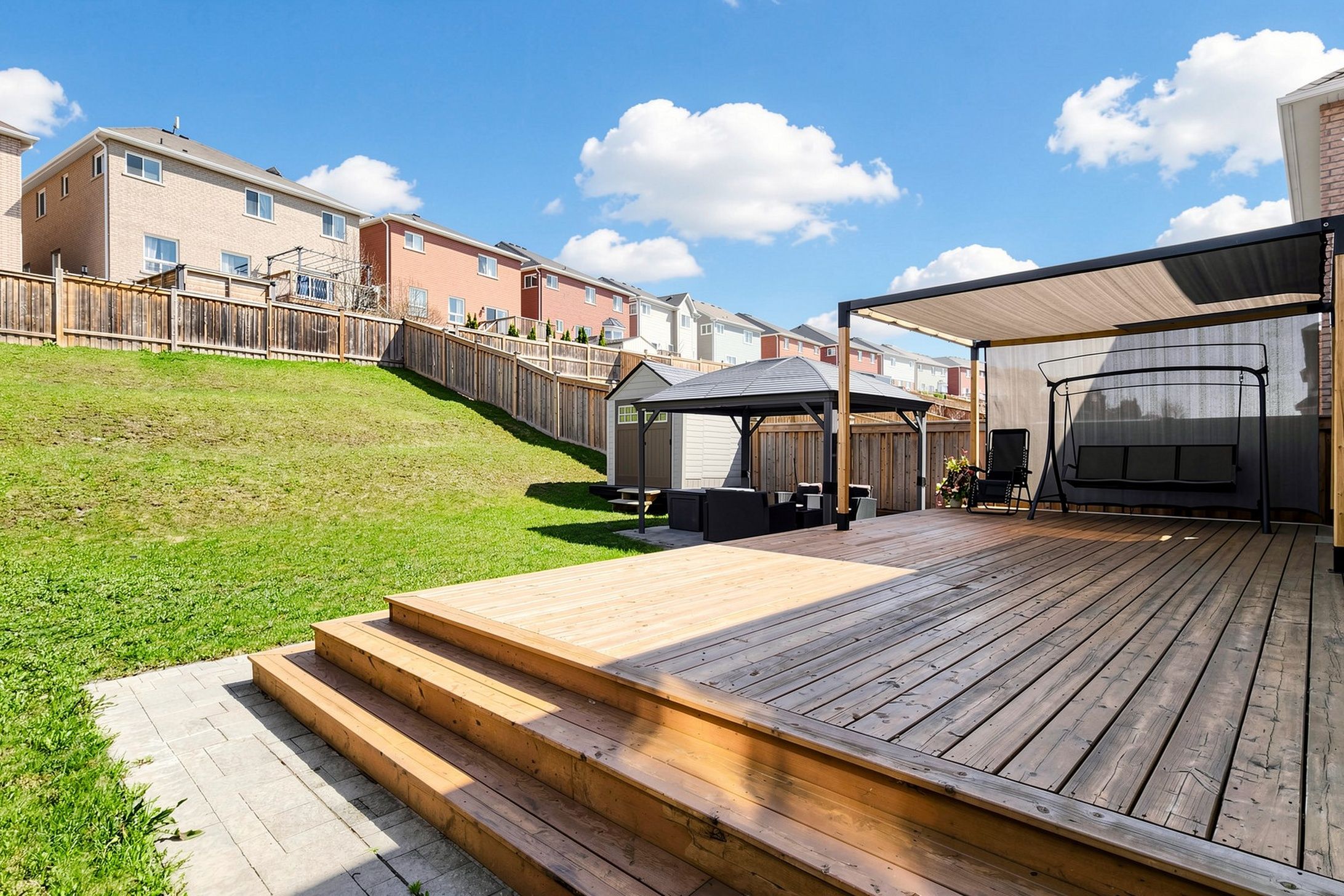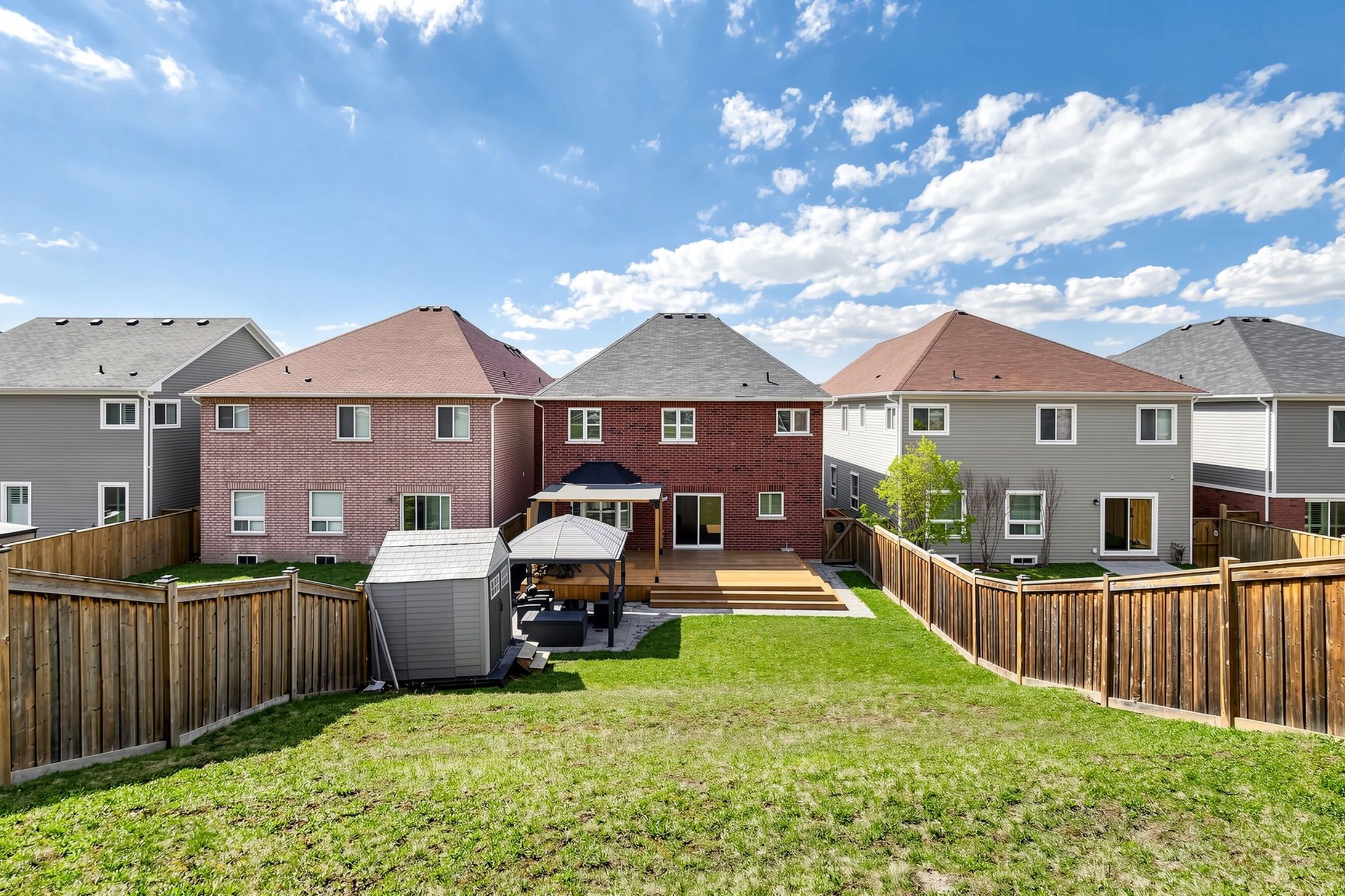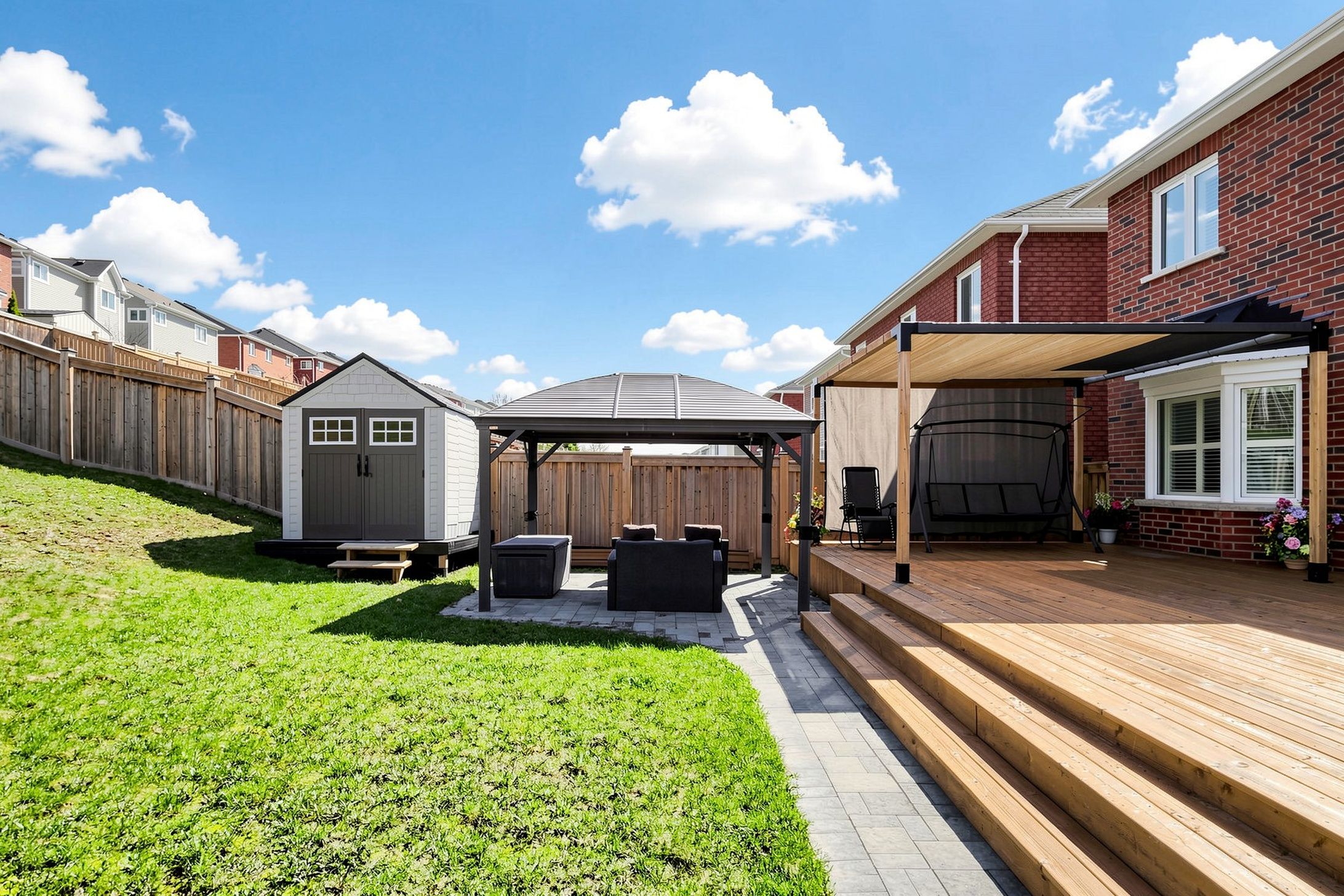 • Landscaped backyard with large deck, gazebo, and patio for outdoor gatherings.