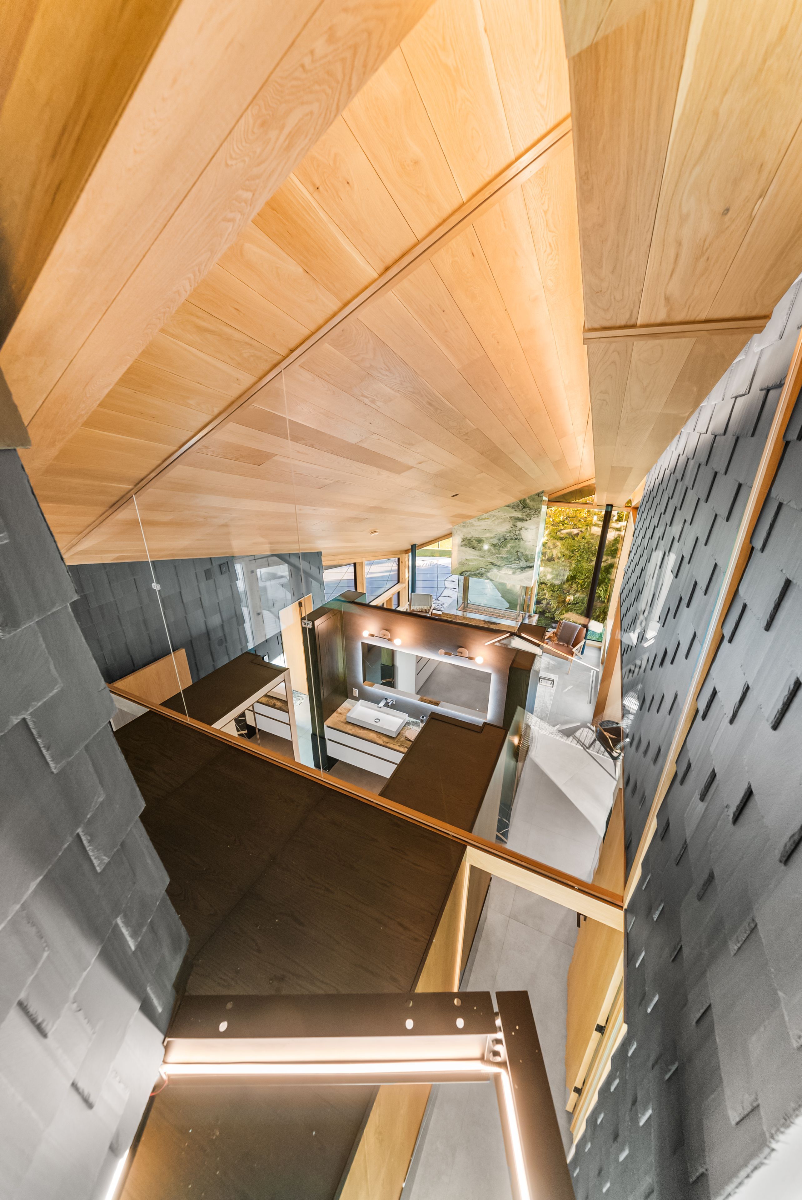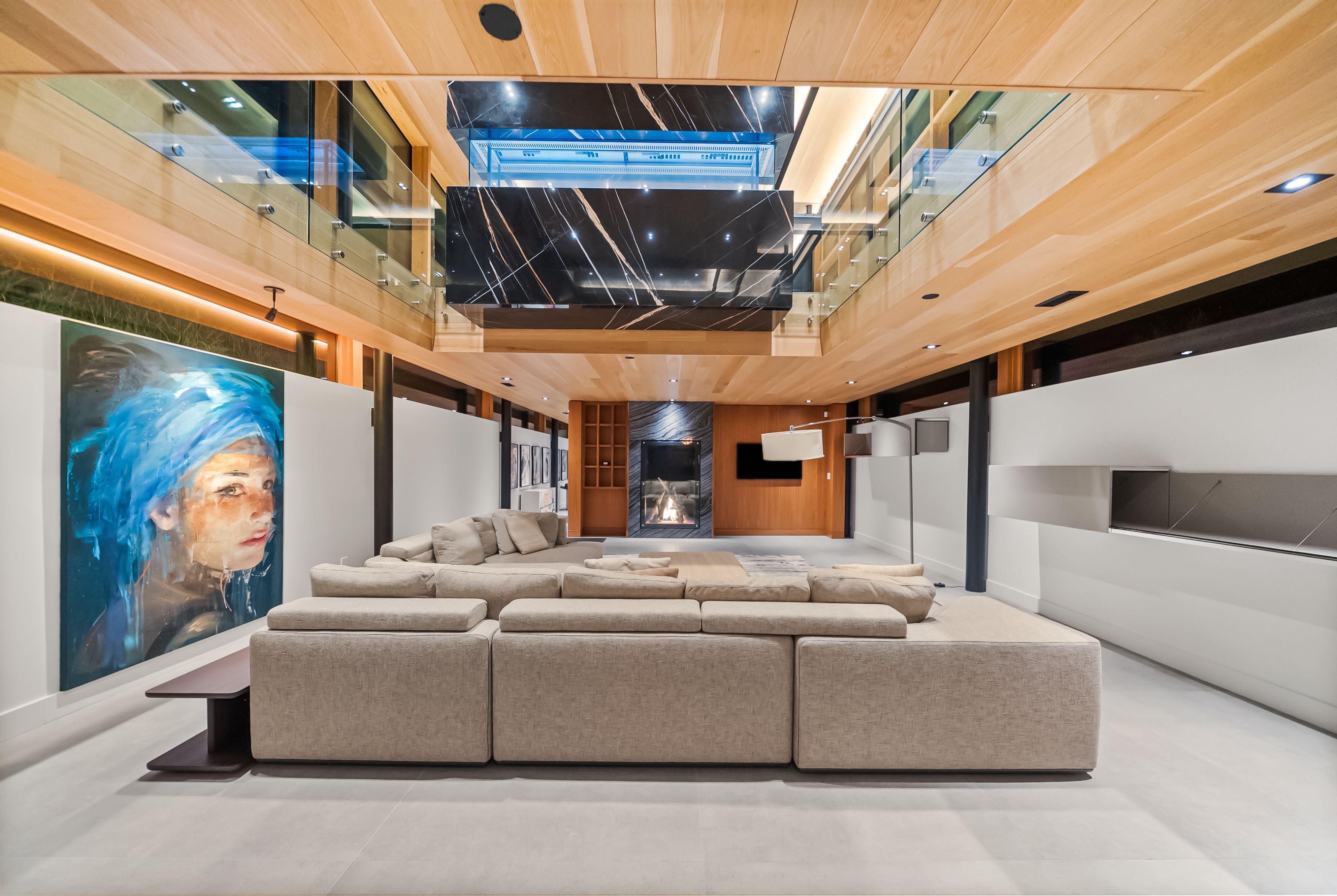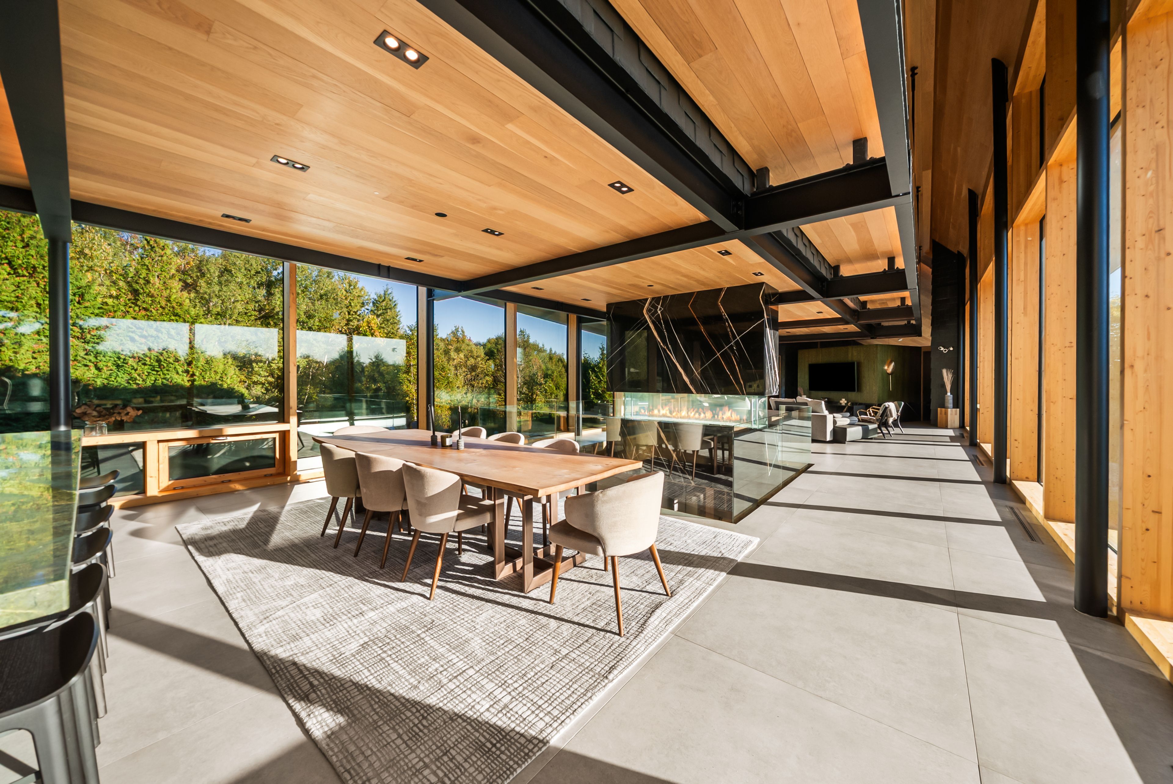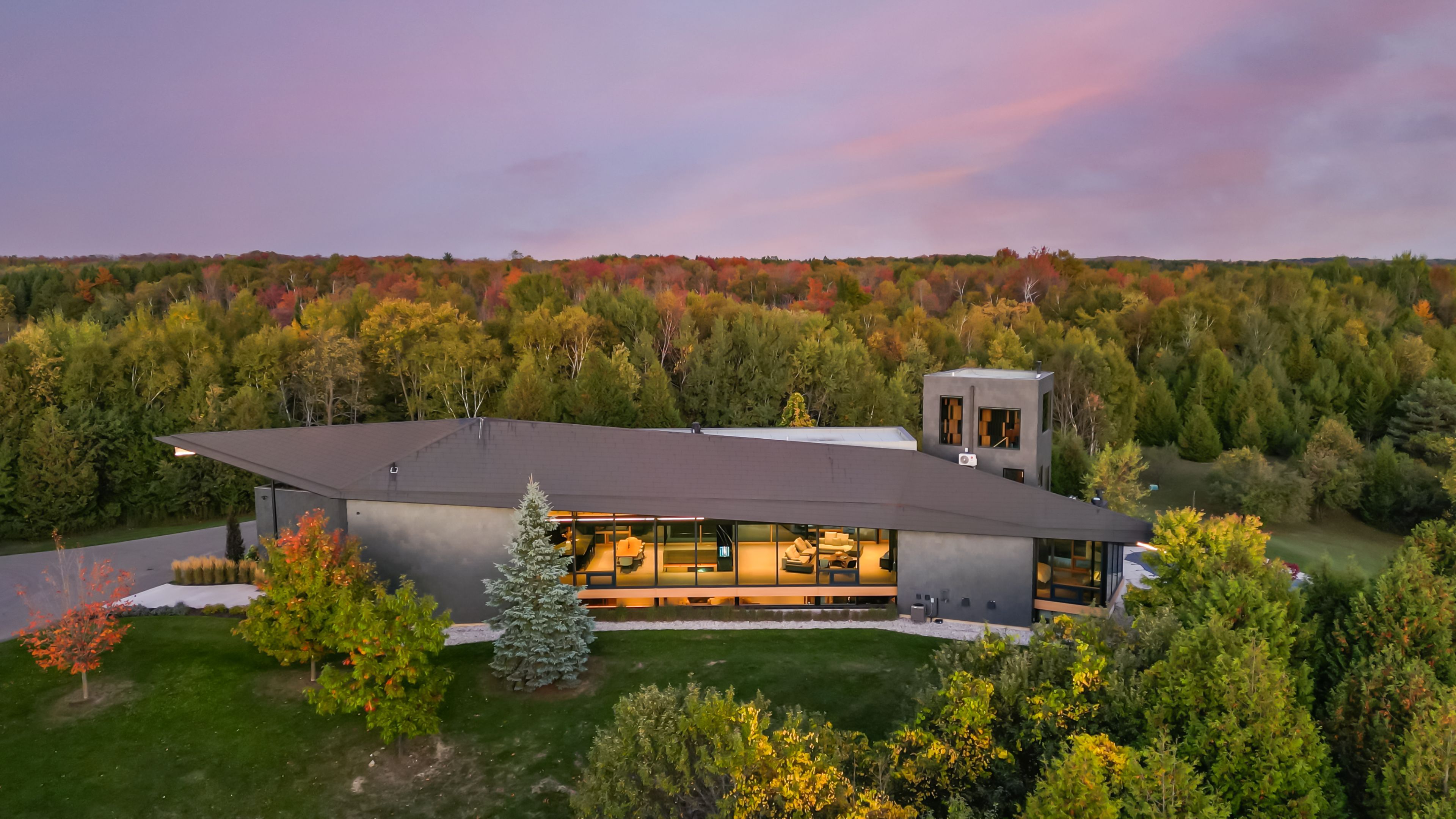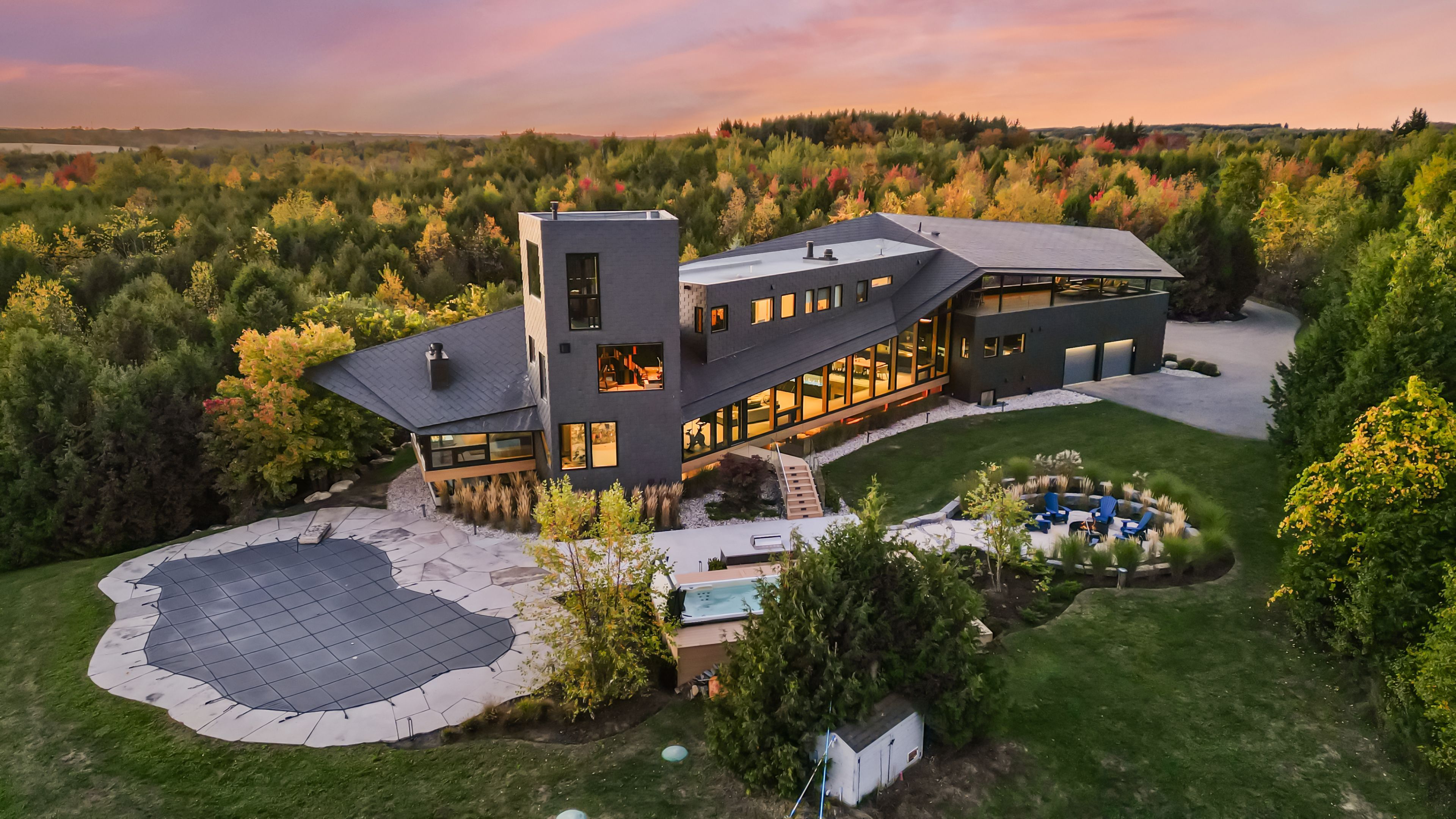 A jaw-dropping architectural statement in the heart of caledon! This one-of-a-kind residence blends world-class design, natural beauty & uncompromising craftsmanship across 10,300 square feet of living space. Designed by kariouk architects w/interiors curated by the renowned karin bohn, the home has been celebrated in films, fashion shoots, & multiple design awards, standing as a true icon of modern architecture in ontario. The exterior showcases a copper roof & natural slate stone siding wrapping both the façade & select interior feature walls-materials chosen for their rarity, permanence, & sculptural quality. Inside, the atmosphere is defined by floor-to-ceiling windows, dramatic lighting & solid white oak tongue-and-groove ceilings. The raised ground-floor design allows for continuous transom windows around the perimeter, filling the lower level w/natural light. A large central floor opening connects the two levels visually & spatially, framing the home's main fireplace & creating a dynamic double-height volume. Throughout the home, you'll find extensive custom millwork, steel beam & suspended walkways, & dramatic vaulted ceilings w/ambitious angles that celebrate the artistry of structure & form. The oak interior doors w/oil-rubbed bronze hardware add a warm, tactile contrast to the sleek architecture. The gourmet kitchen features gaggenau appliances & is complemented by a secondary prep kitchen/pantry designed for seamless entertaining. Beyond the interior, an impressive covered deck-integrated into the roof system with ipe floors & b/i speakers, oriented toward stunning elevated views. Outdoor living continues w/a fire pit, hot tub, & inground pool, all set against almost 100 acres of private, forested land-providing tranquility, privacy & notably reduced property taxes. This is not simply a home-it is a work of art, designed for those who value architecture, privacy & the seamless connection between design & nature.