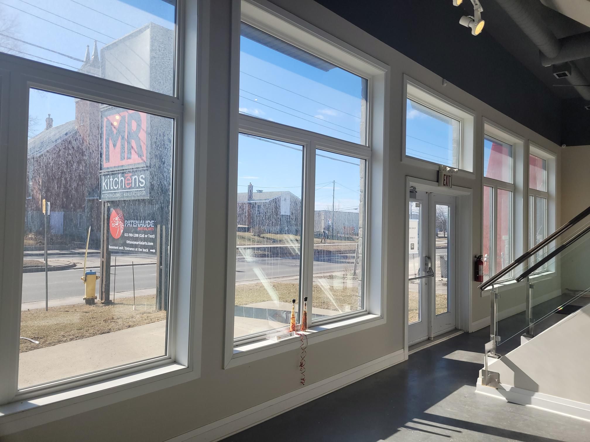 • Large showroom windows and high ceilings create a bright atmosphere.