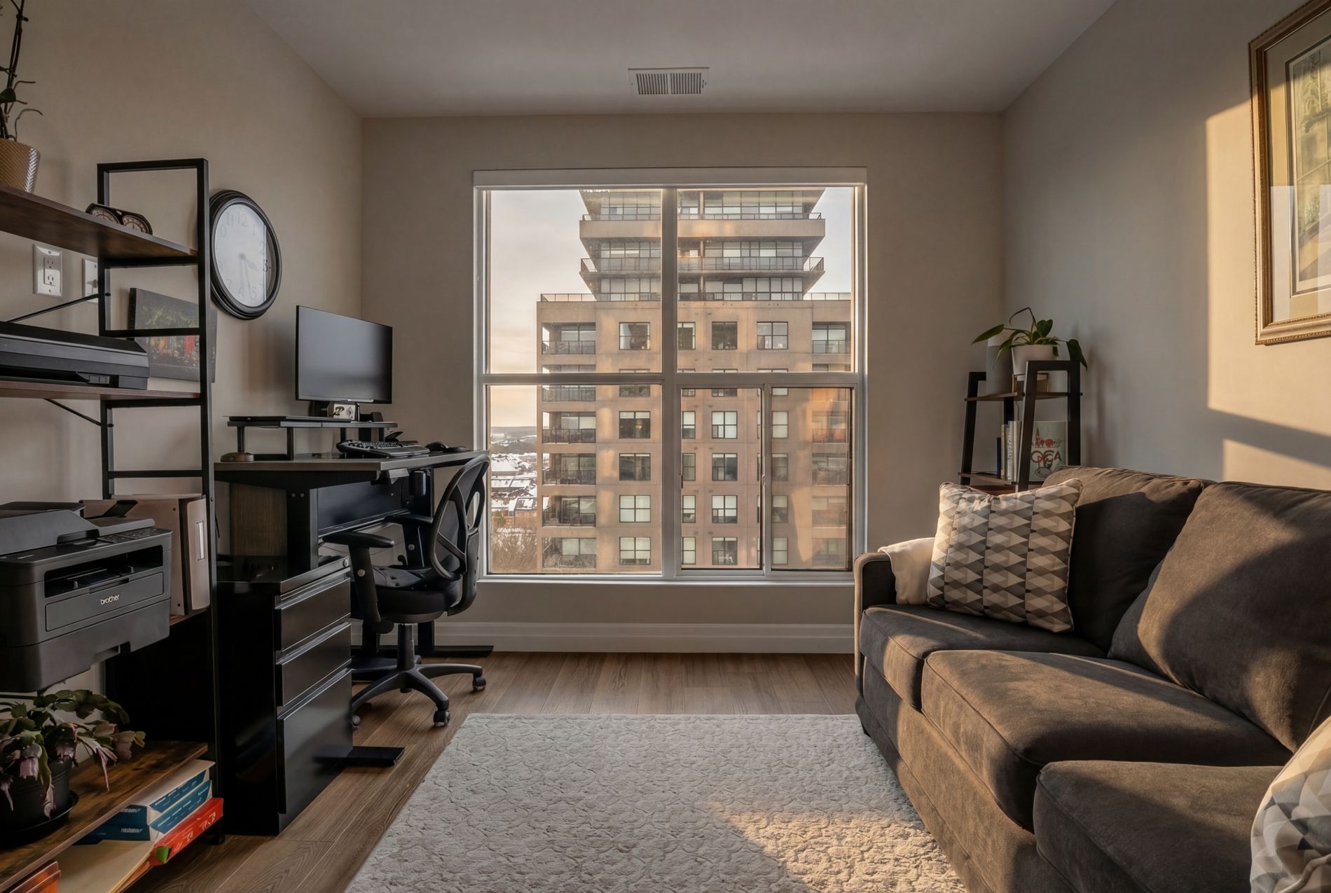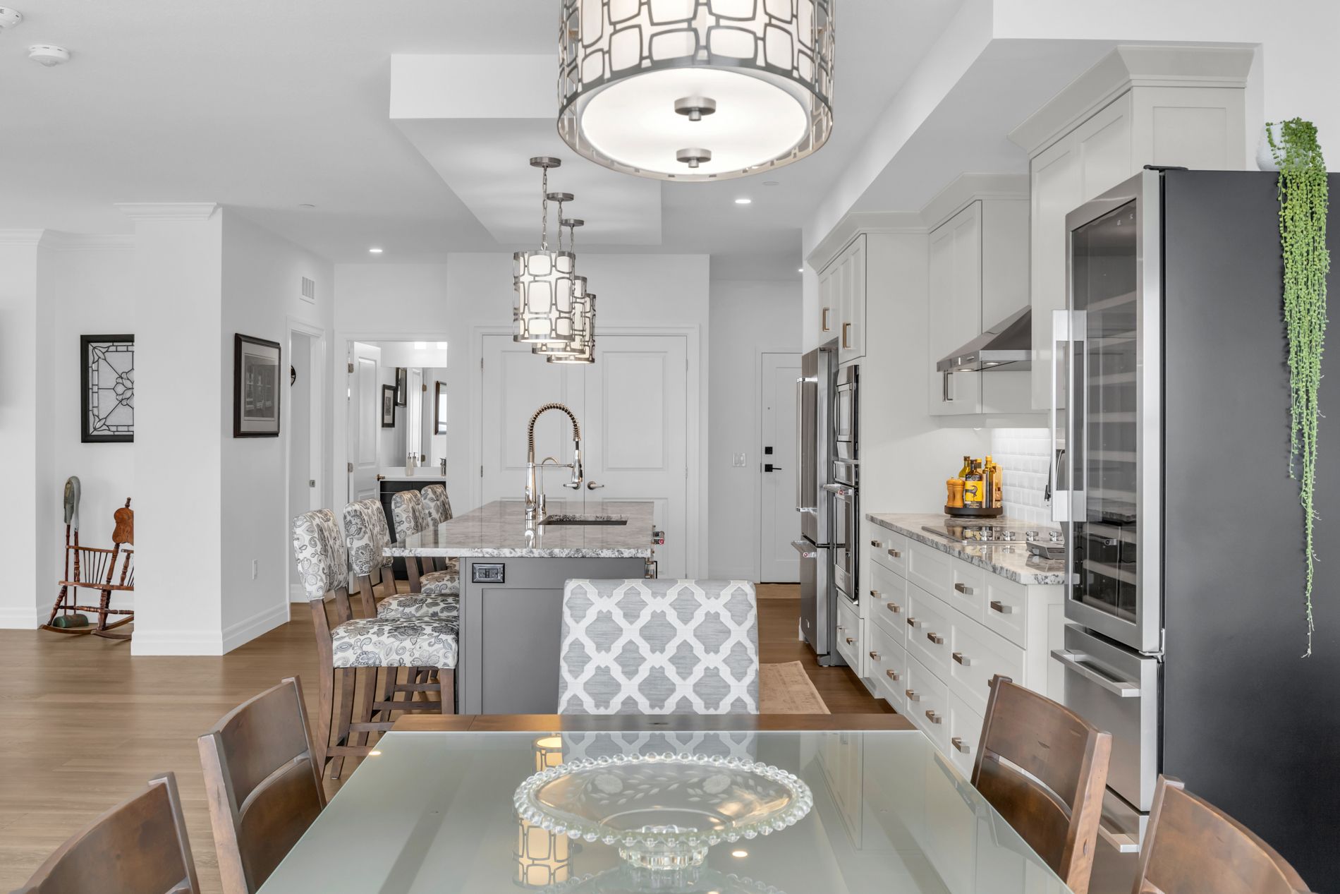 Rarely does a suite of this calibre become available in the prestigious gordon square tower 1, offering a masterful balance of expansive scale and intentional privacy. Framed by soaring ceilings and floor-to-ceiling windows, the 1,632 sq. Ft. Interior is bathed in natural light from a desirable northeast exposure. The space is anchored by 7" wide, engineered hardwood that runs seamlessly from room to room throughout the condo, creating a sophisticated backdrop for the chef-inspired kitchen equipped with premium built-in appliances and a dedicated cooktop. The 'winged' floorplan ensures maximum seclusion, separating the guest bedroom from a primary sanctuary that boasts a generous walk-in closet and a dual-vanity ensuite. Beyond the aesthetic, this residence offers the rare logistical luxury of two side-by-side parking spaces and a large storage locker on the p1 level. Positioned just steps from south guelph's finest dining with effortless 401 access, this residence provides a seamless transition for those who demand the convenience of a condominium without sacrificing the space, functionality, or sophistication of a luxury home.