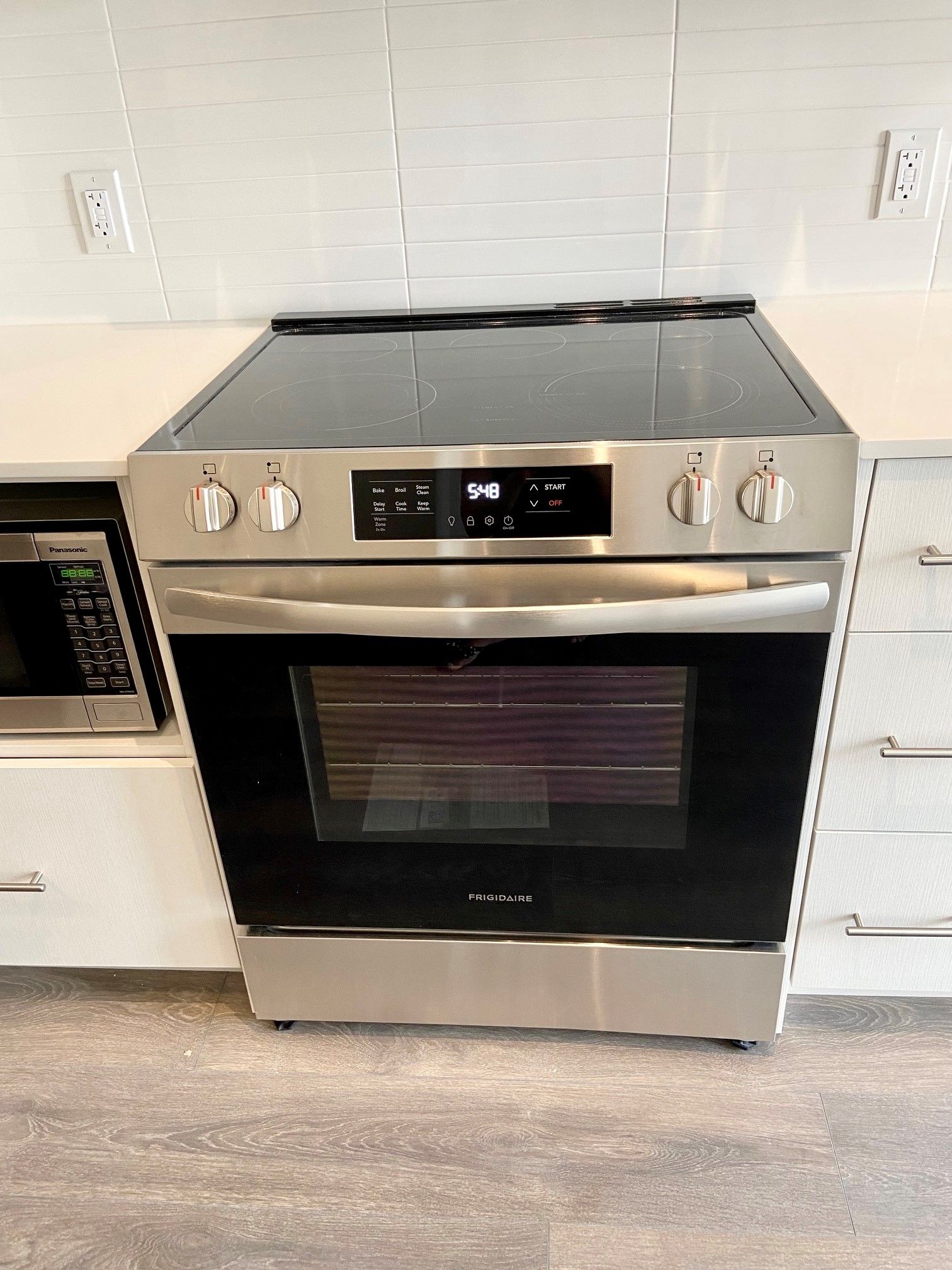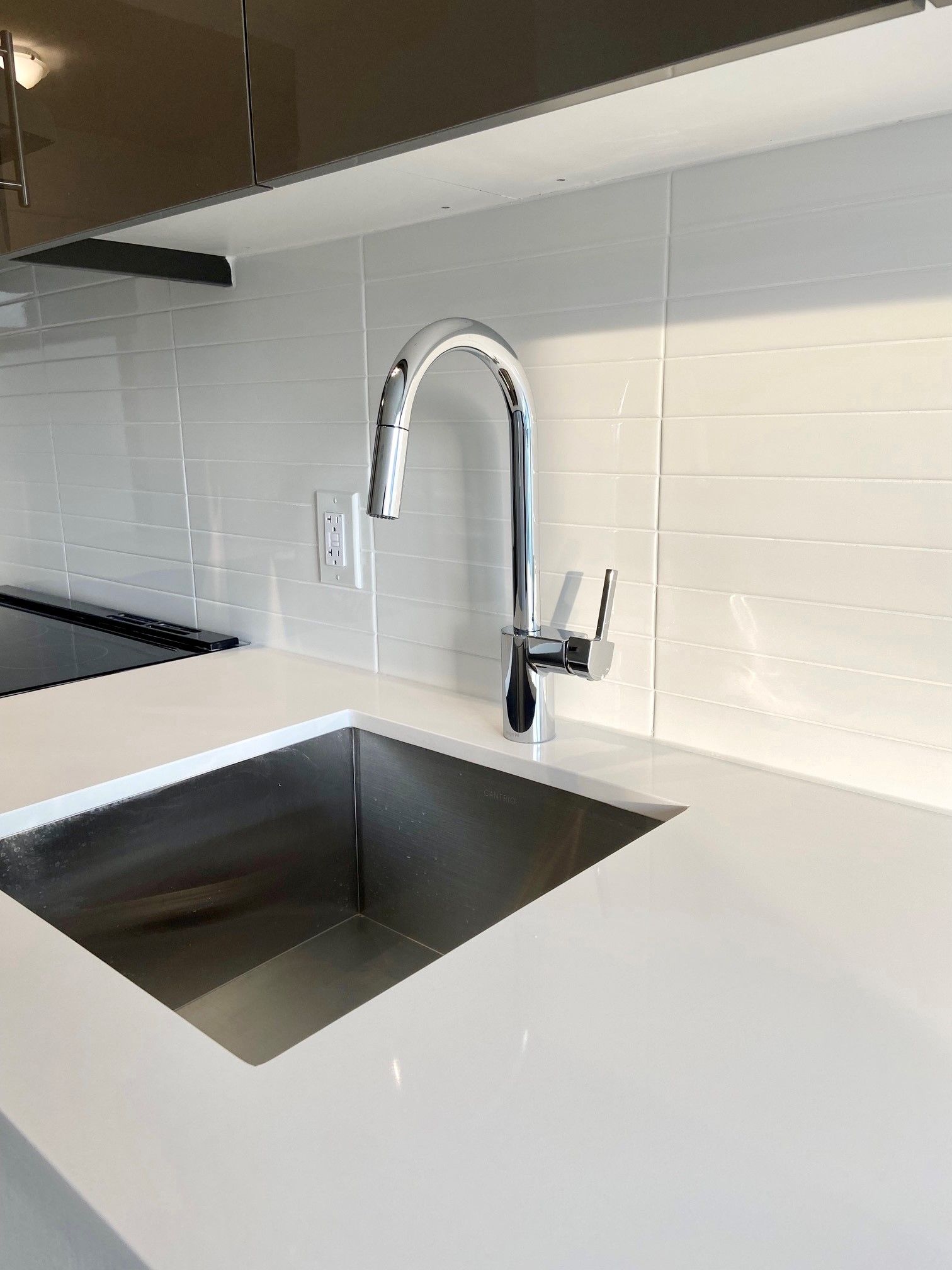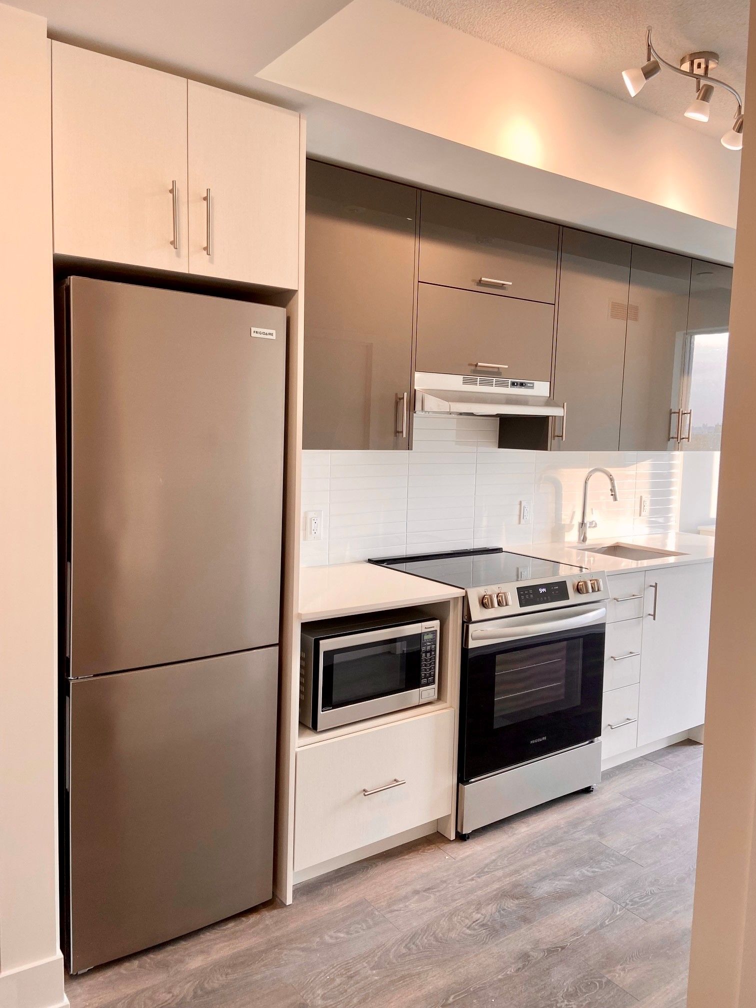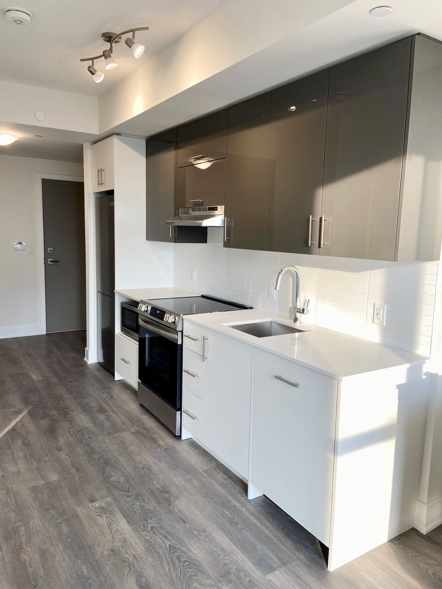 • Modern kitchen with quartz countertops and stainless steel appliances.
