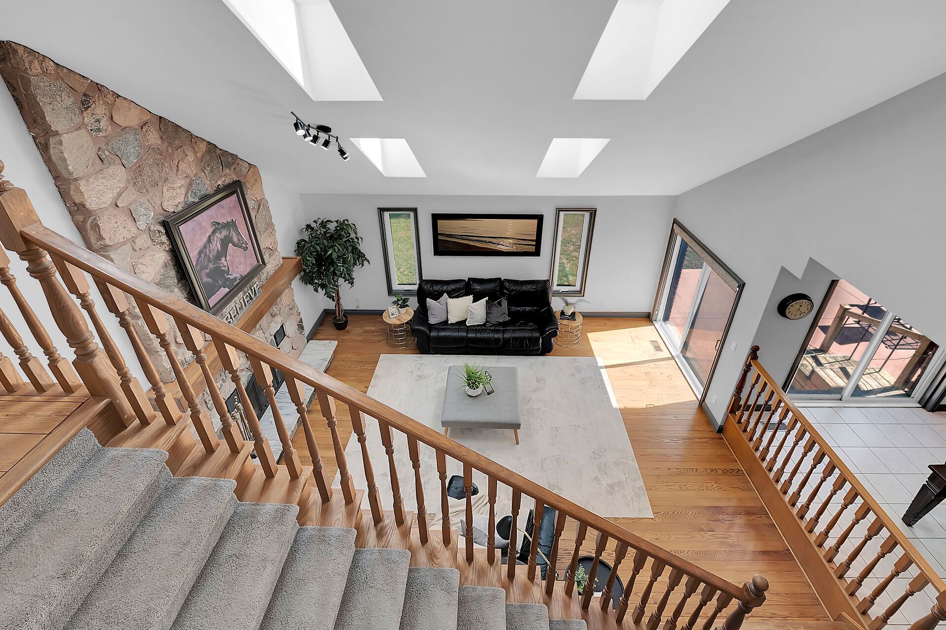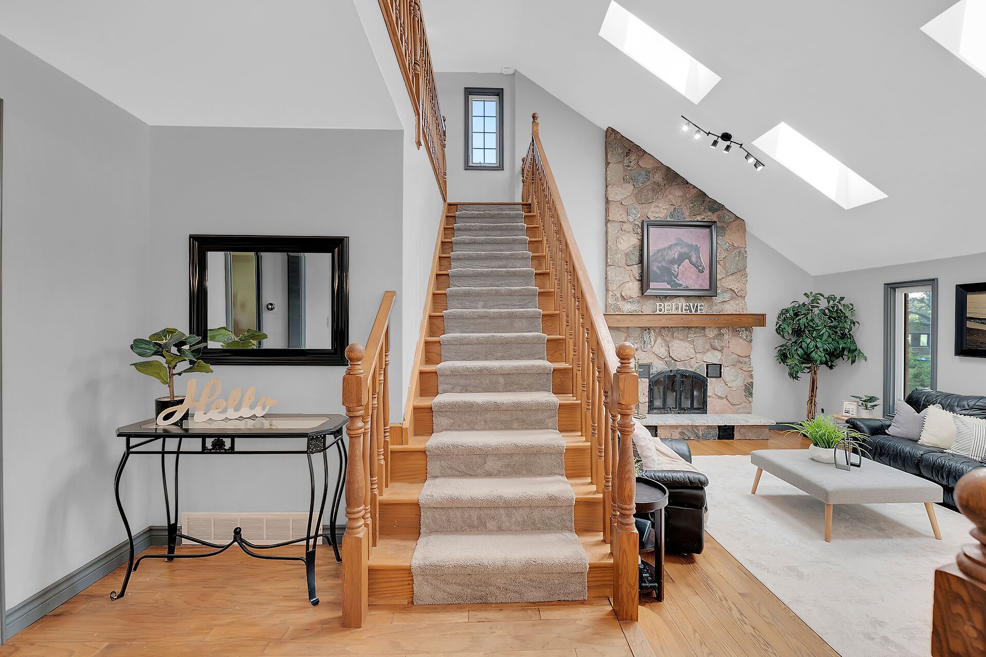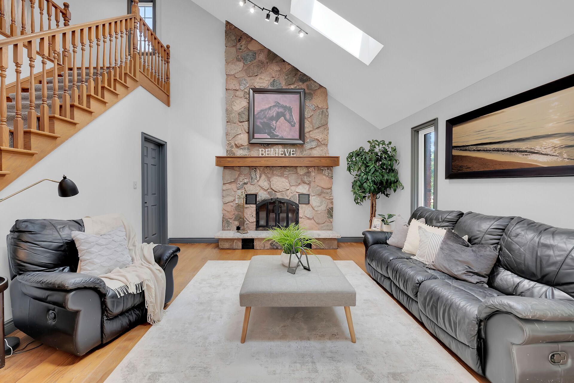 • Spacious main home with vaulted ceilings and a natural stone fireplace.