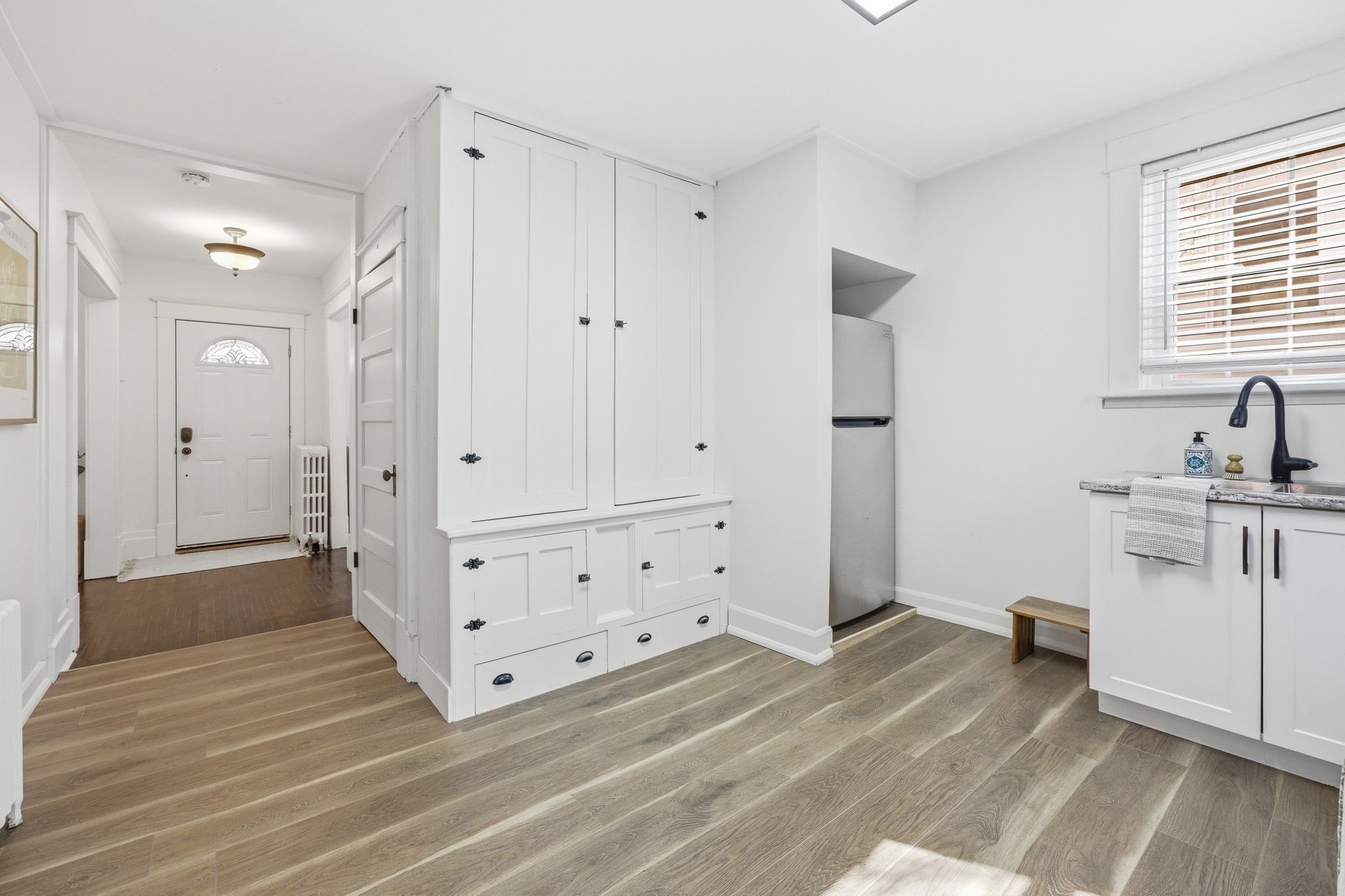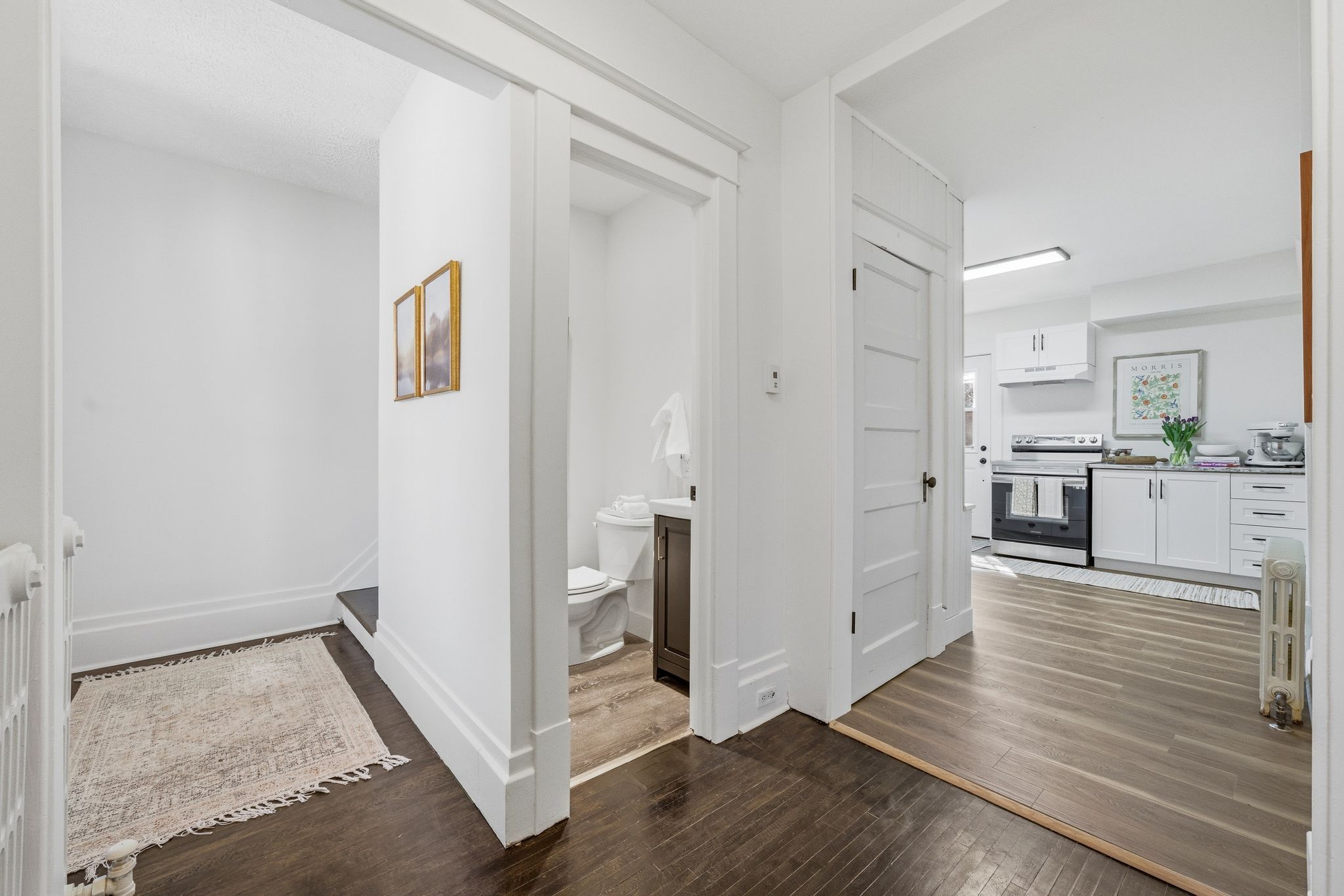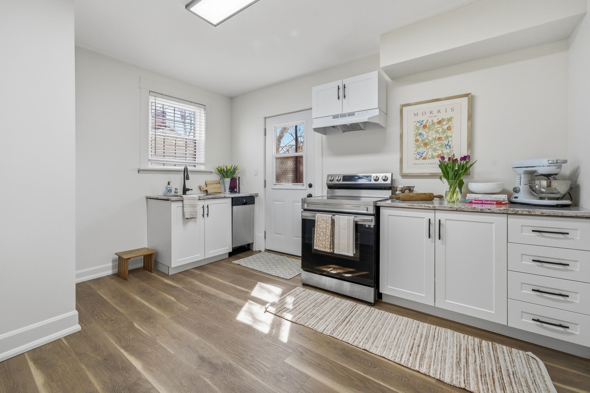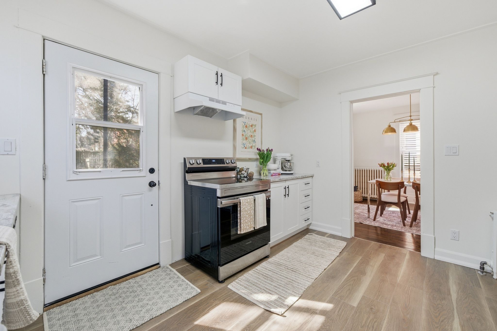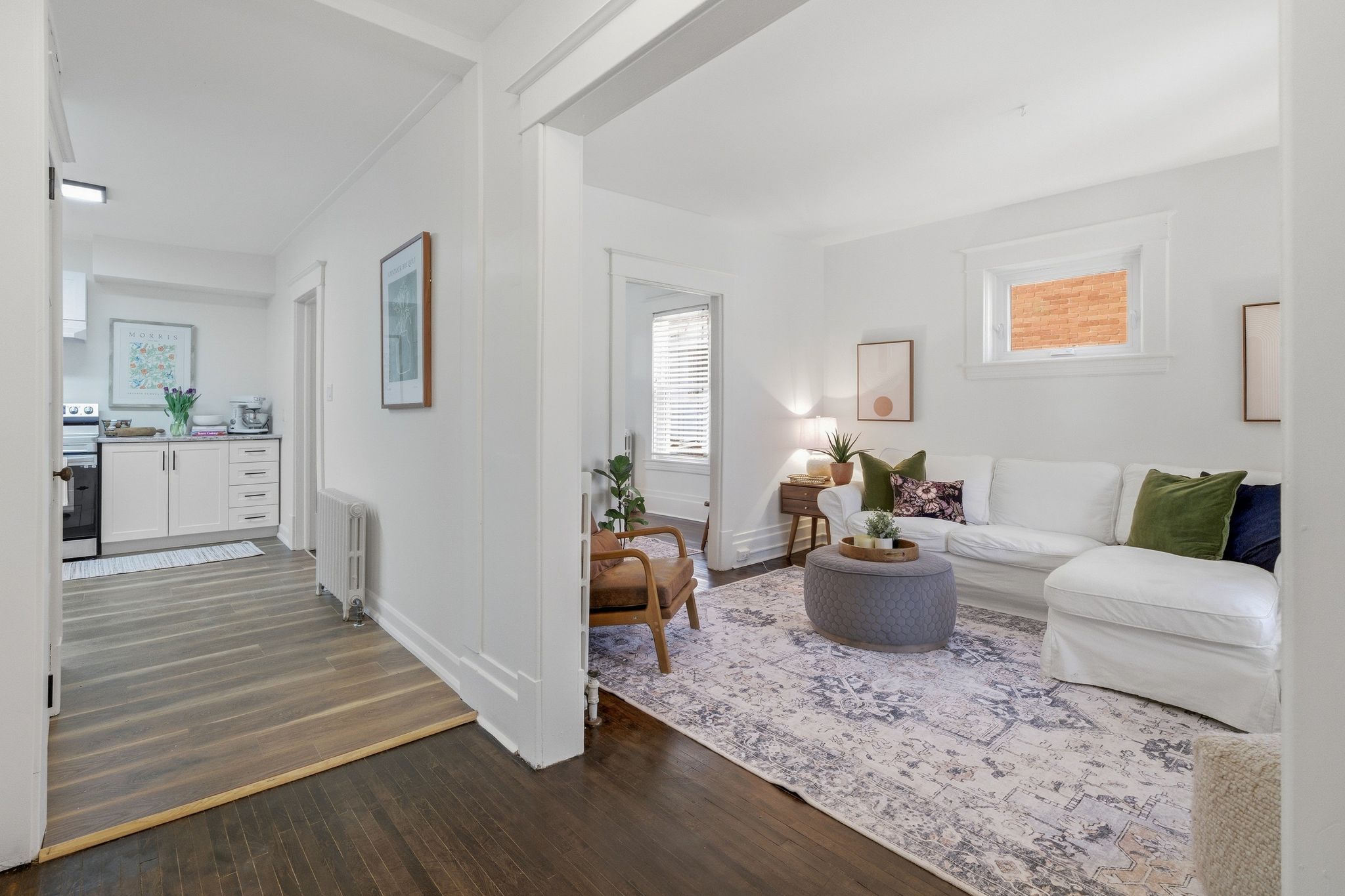• Bright interior with updated finishes and a modern kitchen.