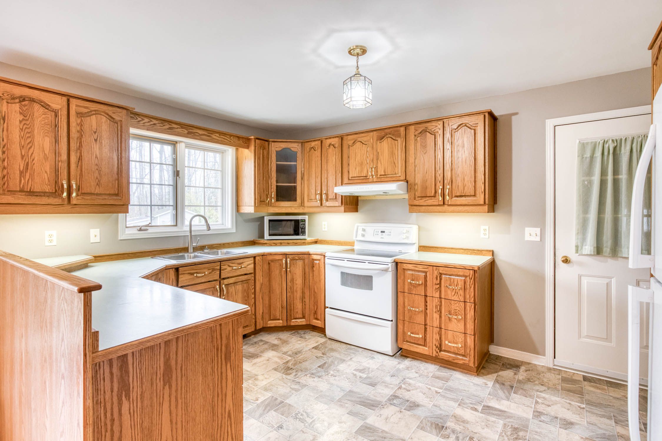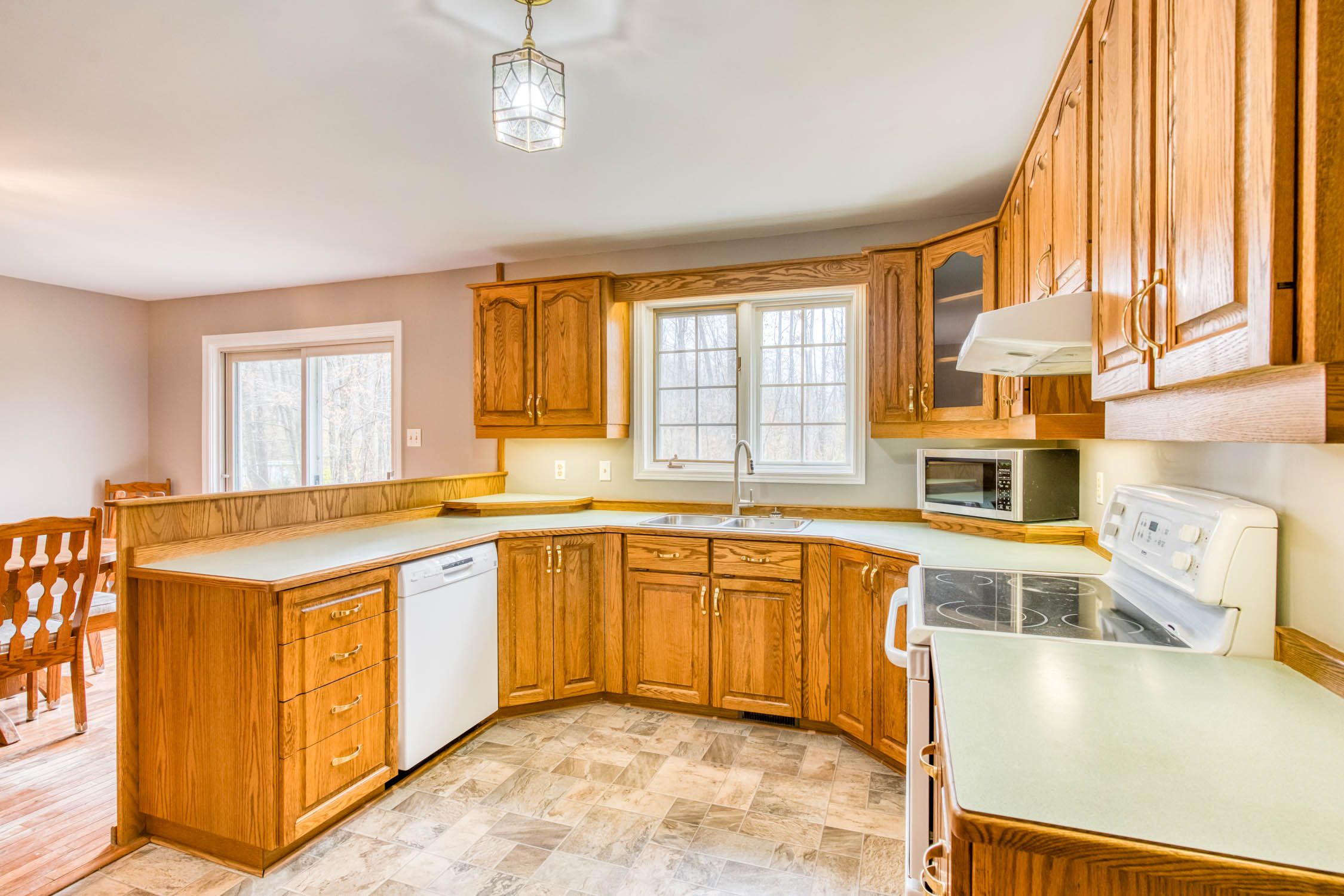 • Open kitchen with lots of cupboards and sunny eating area.