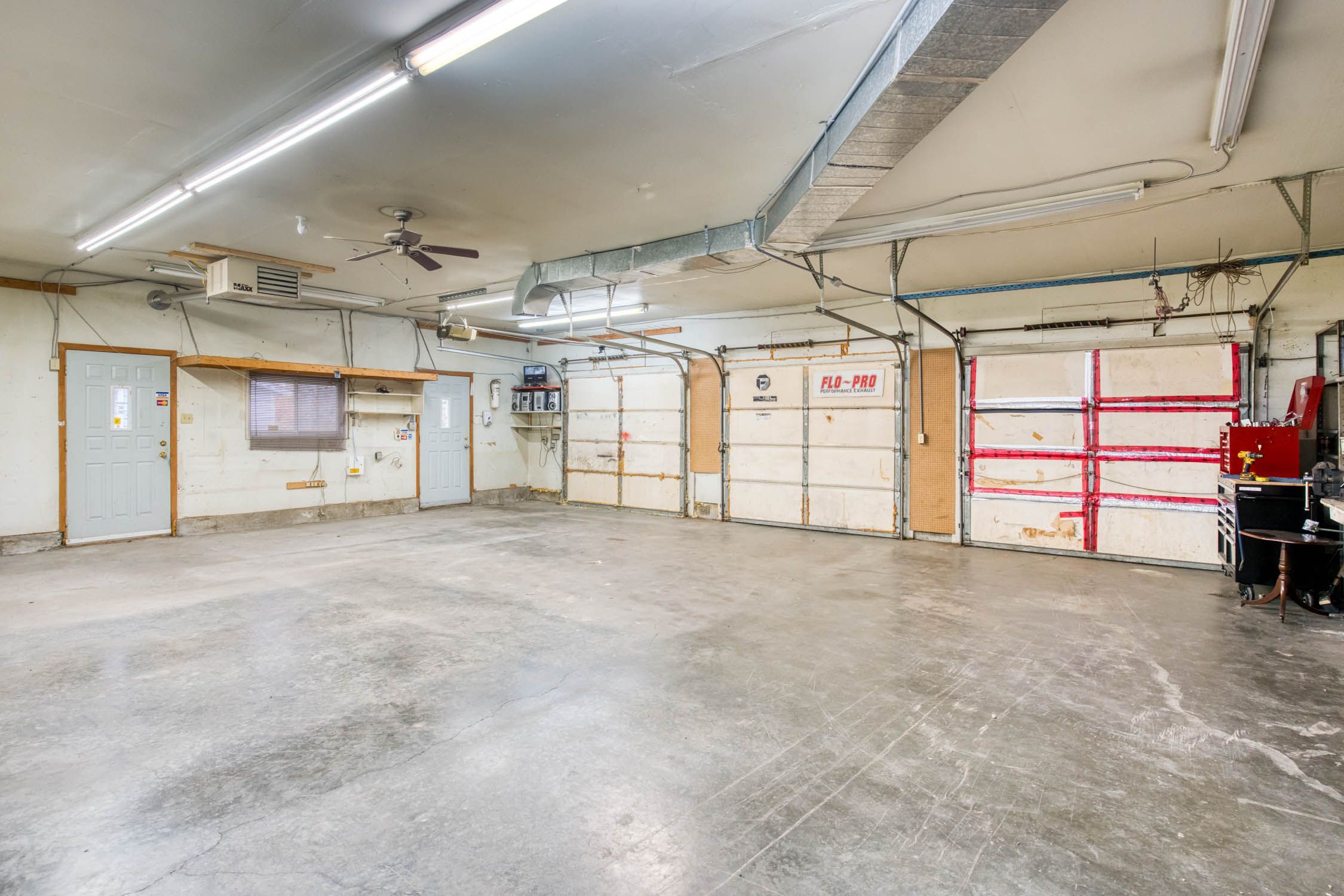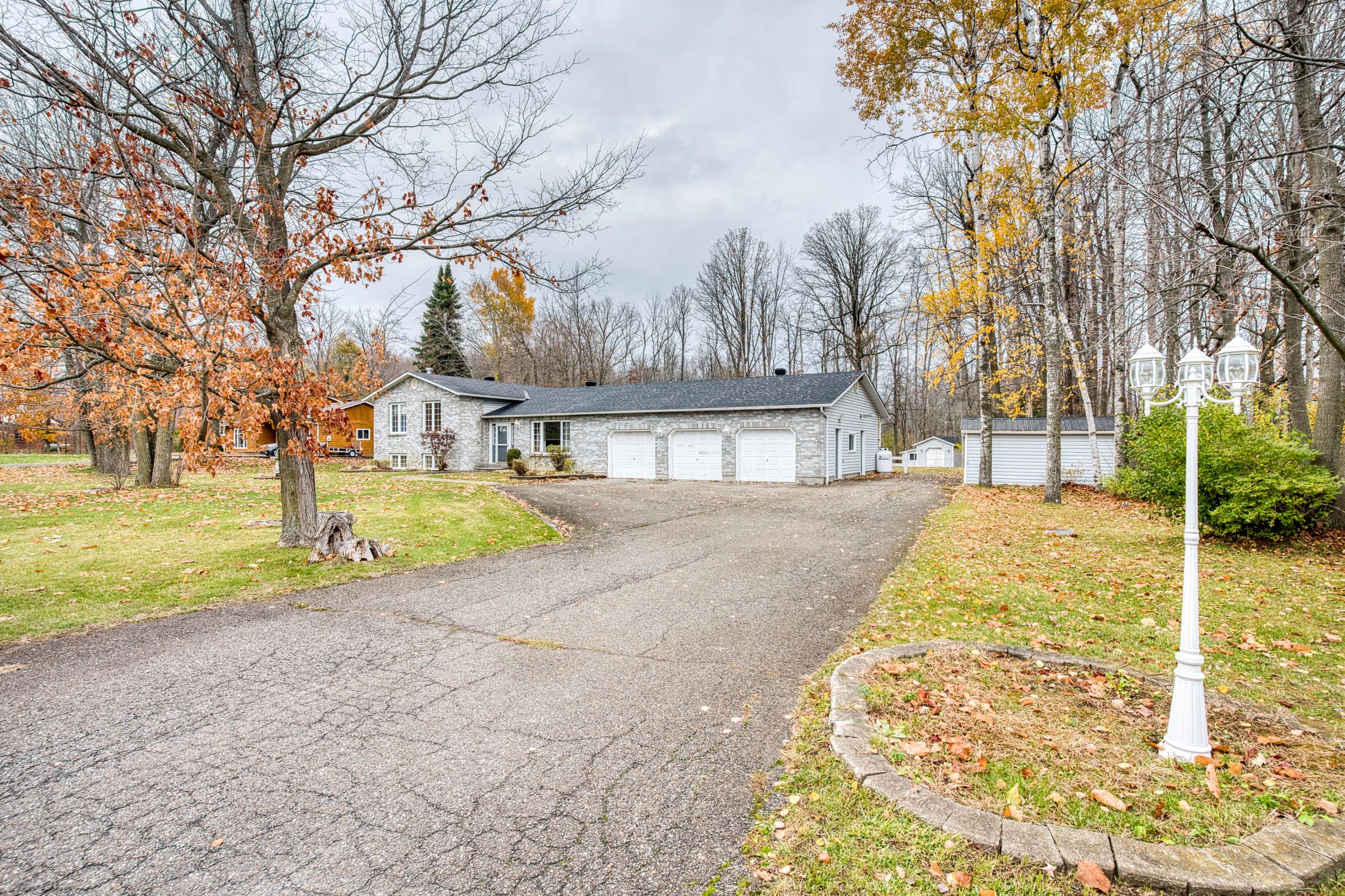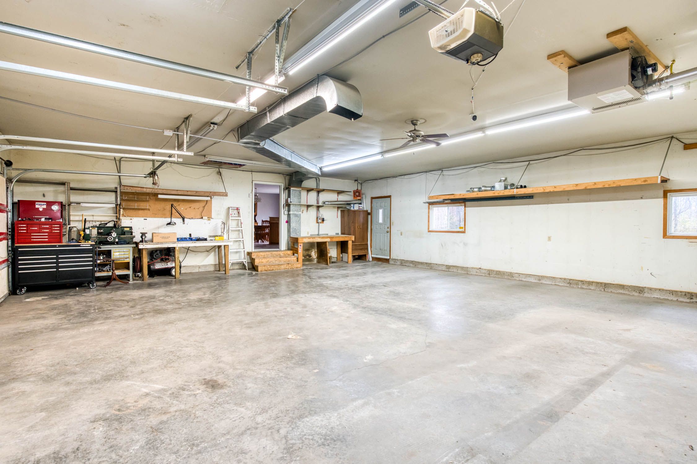 • Three-car heated garage ideal for hobbies or car enthusiasts.