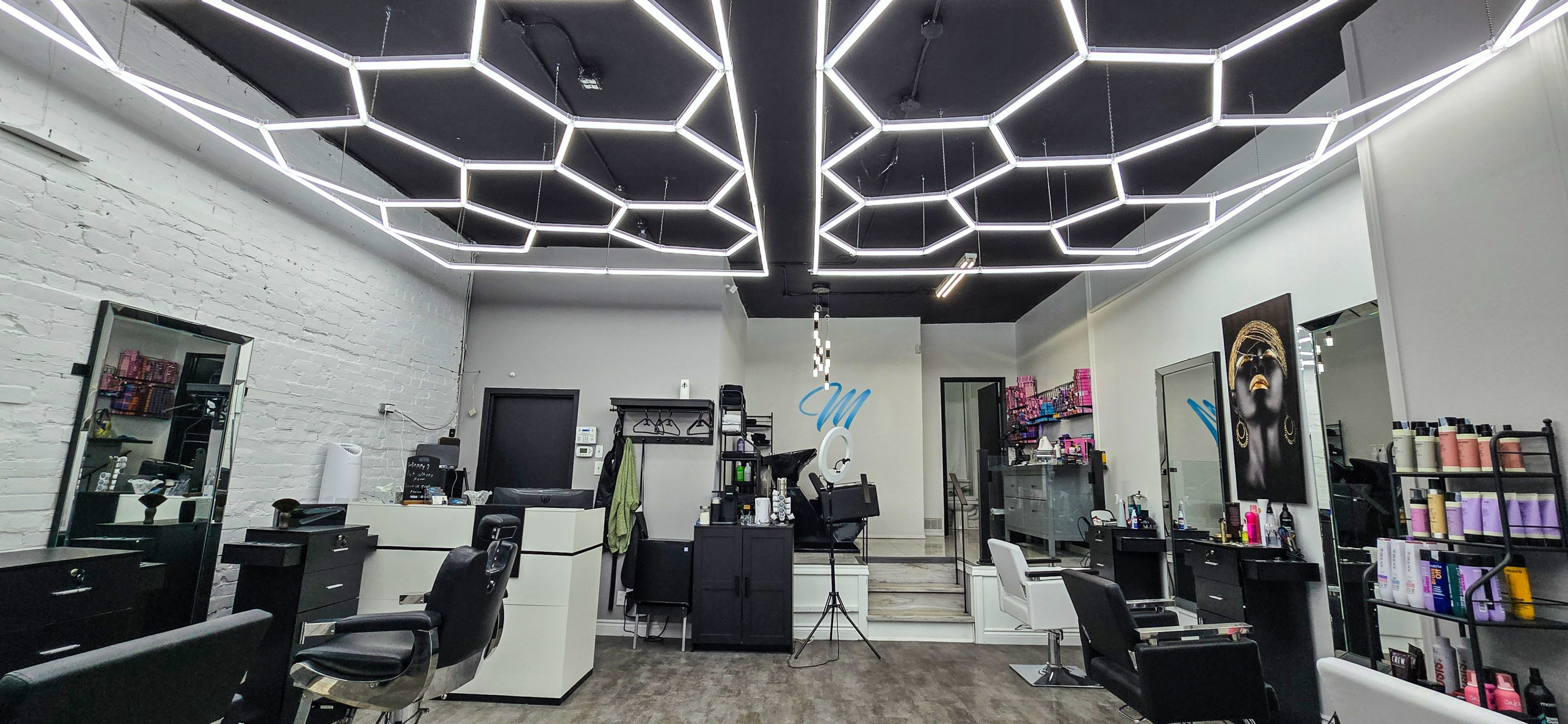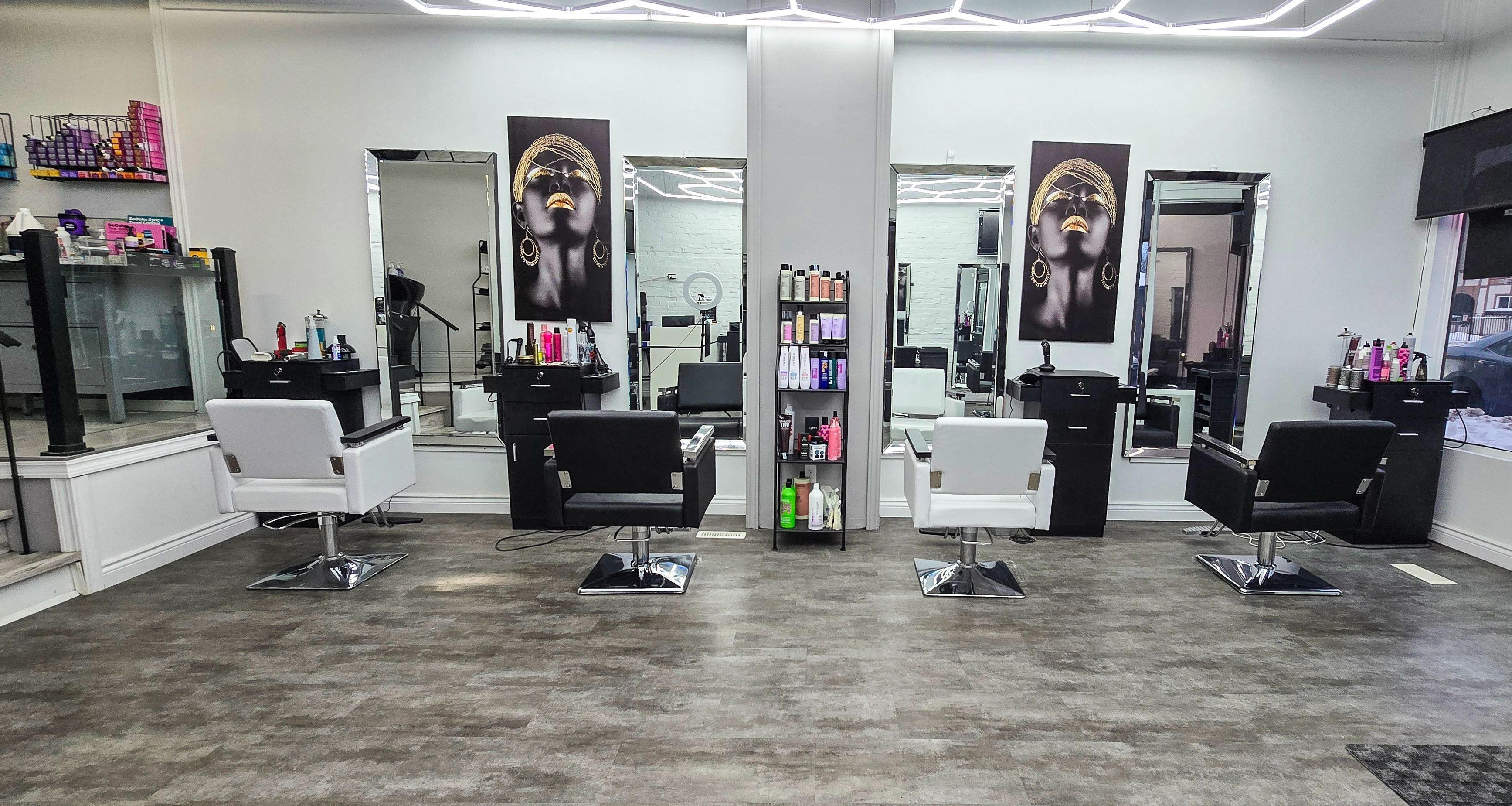 • Equipped with 7 hair stations, 2 wash stations, and a coloring station.