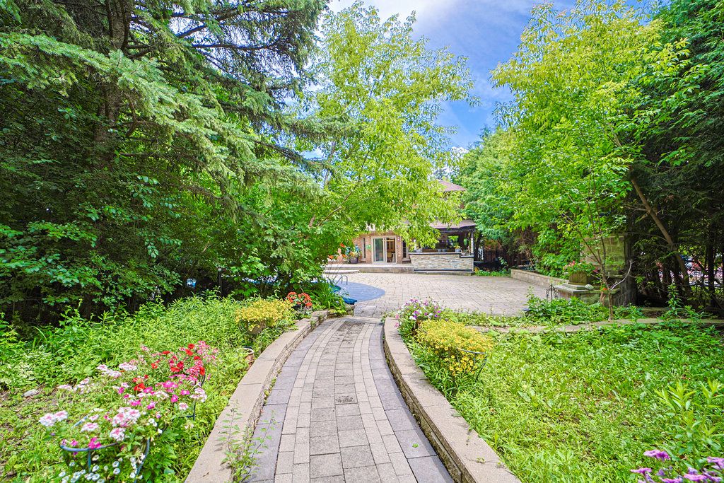 Majestic estate on a rare double-parcel premium huge lot! Proudly featuring the lucky house number "188", a stone front mansion w/ $450k breathtaking garden backs onto a tranquil grenbelt and adjoins a park for unparalleled privacy. The grand foyer greets you with soaring 17' ceiling and a signature scarlett o'hara staircase. A thoughtfully designed layout boasts gleaming hardwood floors, a gourmet granite kitchen & a sun-filled family room with a fireplace and custom bar. The master bath features a spa-inspired ensuite overlooking the serene woods. The separate-entrance basement featuring two self-contained units and a dry sauna-ideal for multi-generational living or significant rental income. Step into a professionally landscaped resort-style backyard oasis: sparkling inground pool with waterfall, hot tub, and a grand gazebo equipped with a wet bar and built-in bbq kitchen. Nestled in a top-ranking school zone. A true masterpiece of luxury and prestige!