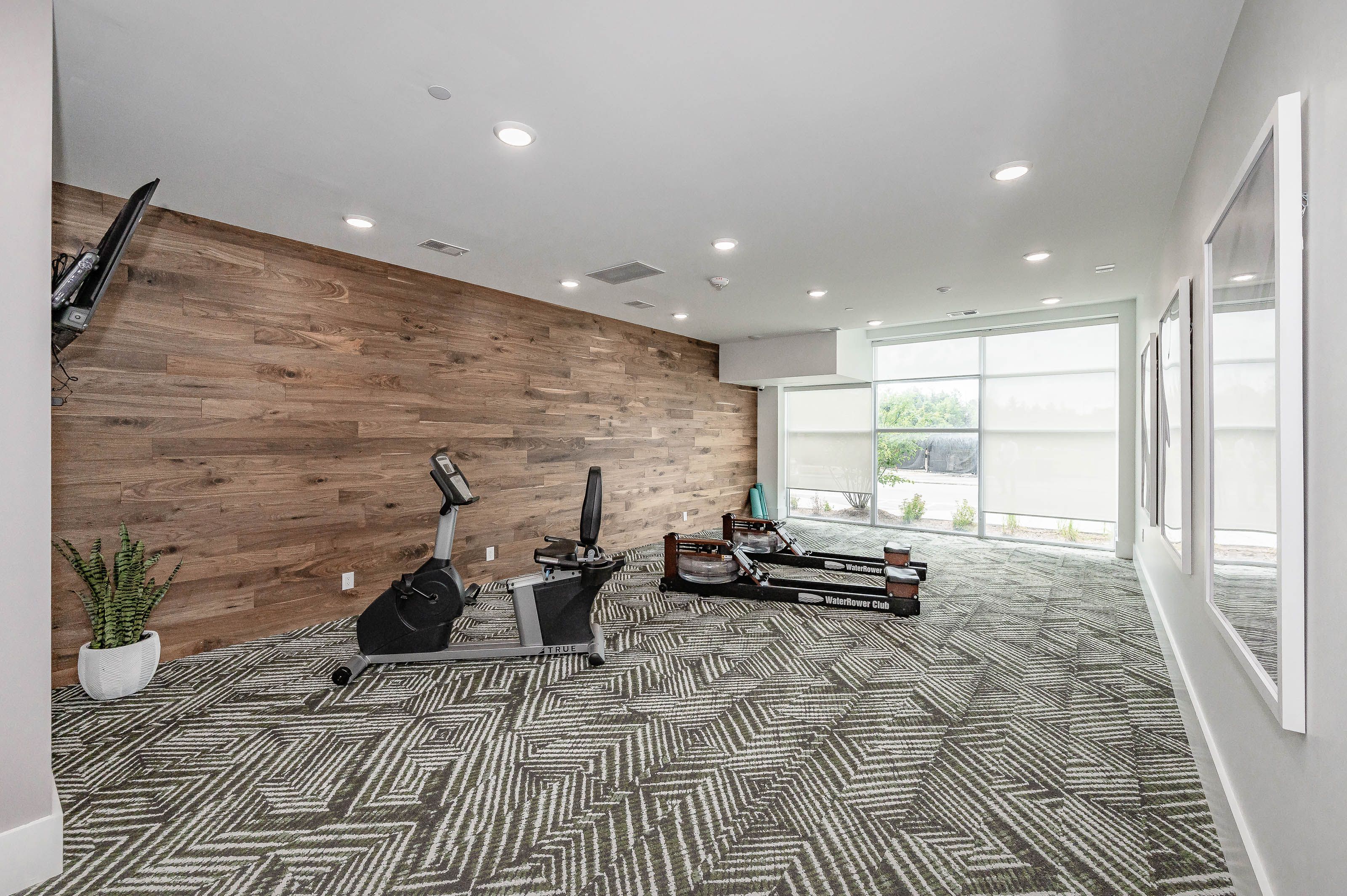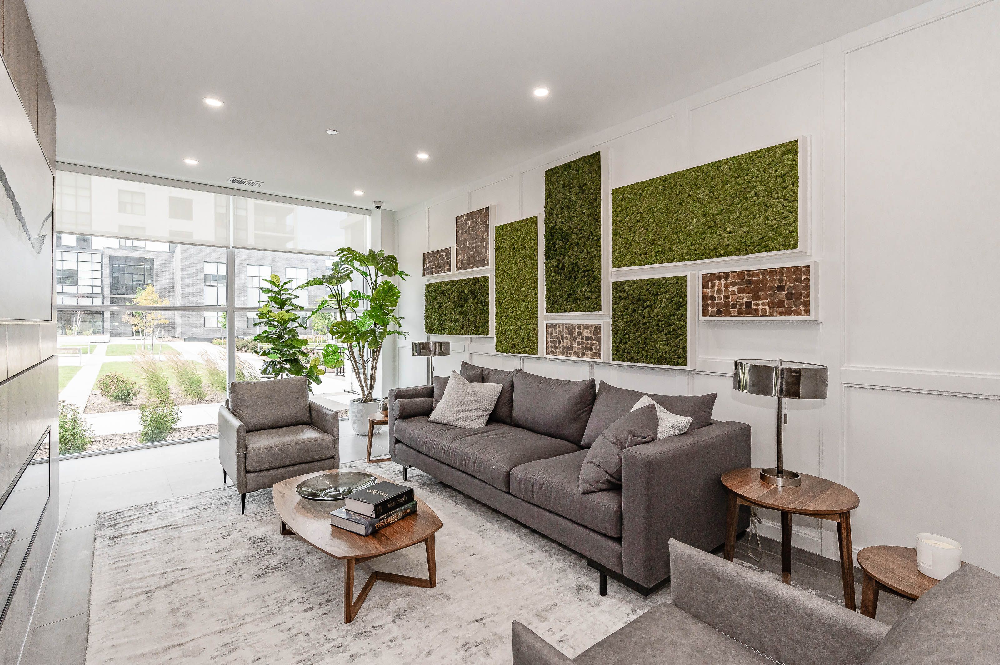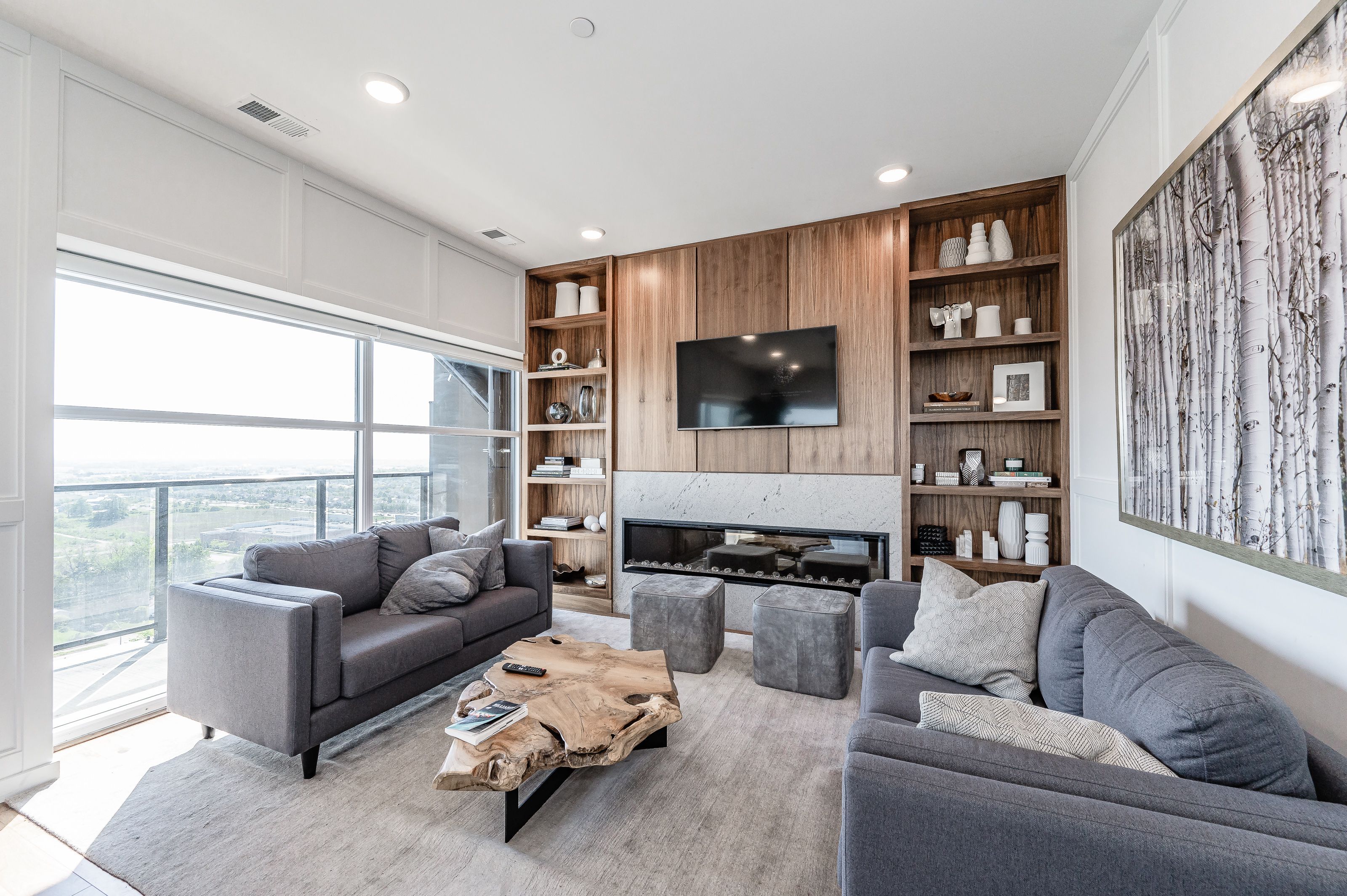 • Amenities include gym, golf simulator, and resident lounge with panoramic views.