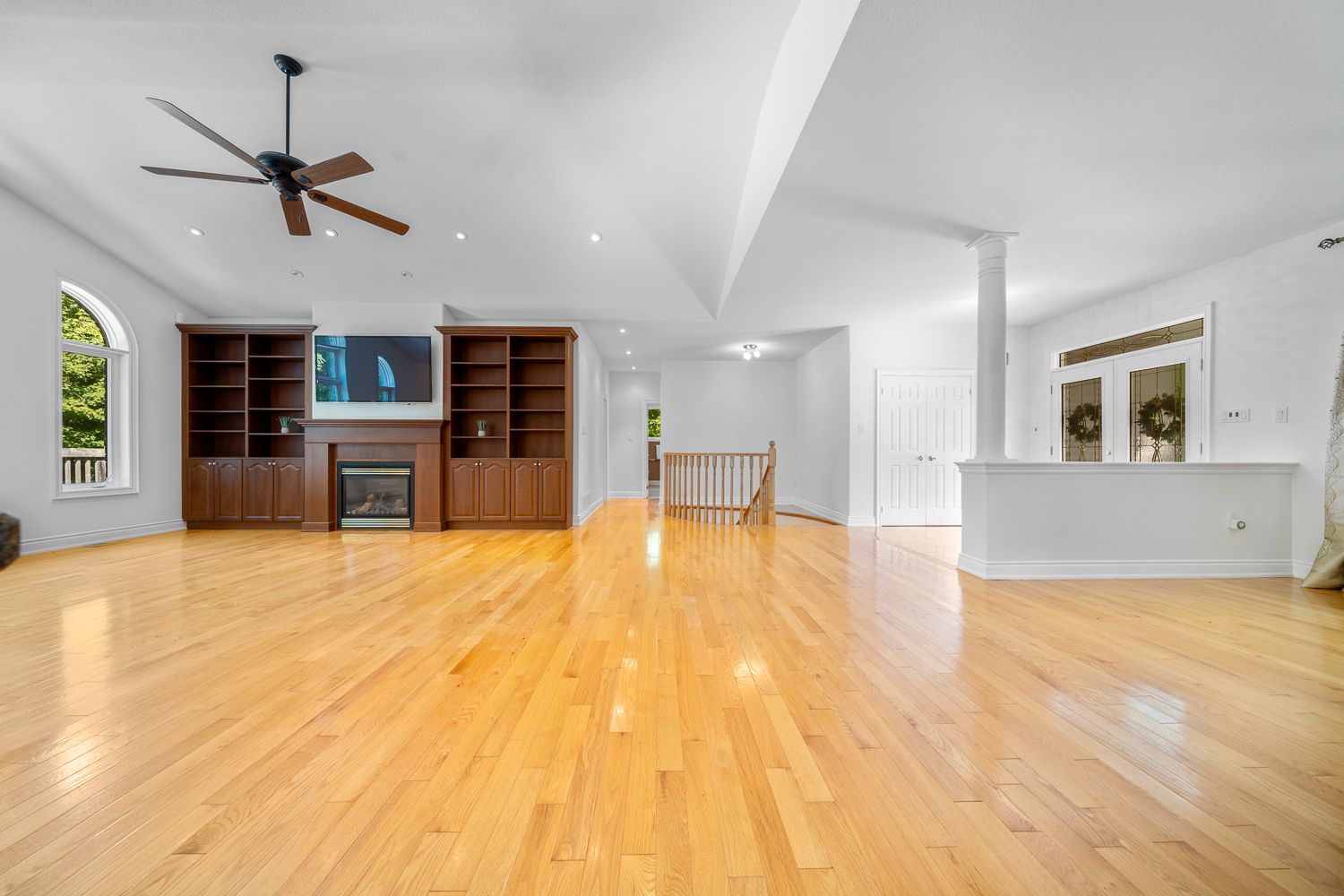 • Open-concept living space with vaulted ceilings and hardwood flooring.