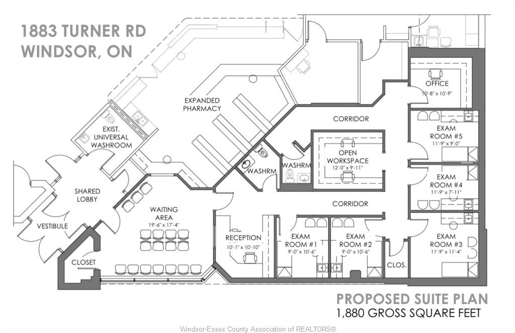 Opportunity for healthcare professionals looking for a space to practice! 1800 sq. Ft unit available in a medical building with a neighbouring full service pharmacy on site. This unit offers a perfect setup for clinic/medical office use. Landlord will perform additional renovations (architectural design within photos) and will offer a marketing plan to the tenant. Conveniently located just west of walker road and across from wrh metropolitan hospital. Lots of free parking and on a bus route. $2,500. 00 base rent plus cam of approx. $975. 00 plus hst per month. Requires content insurance with minimum $5 million liability. Book now for a private tour!