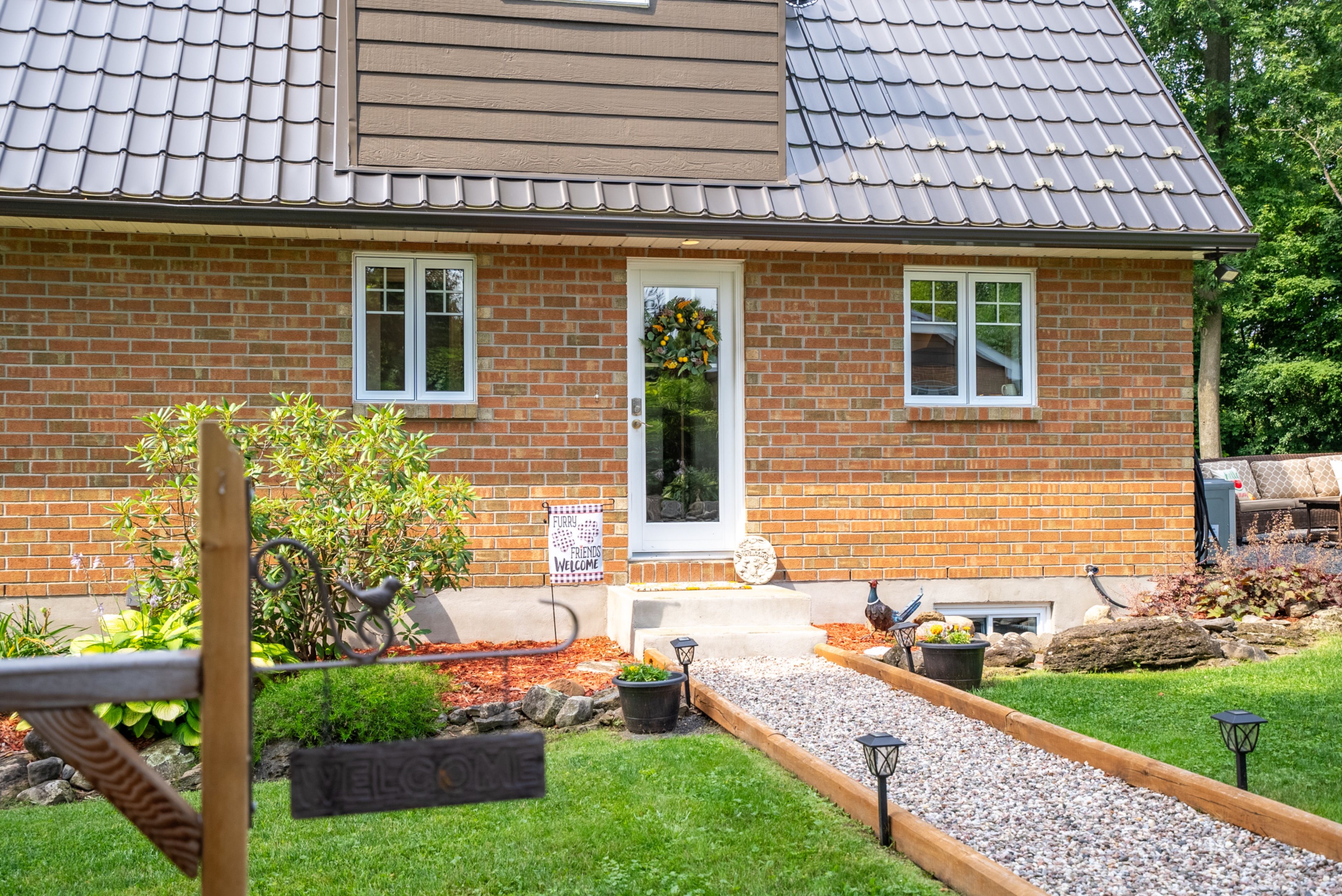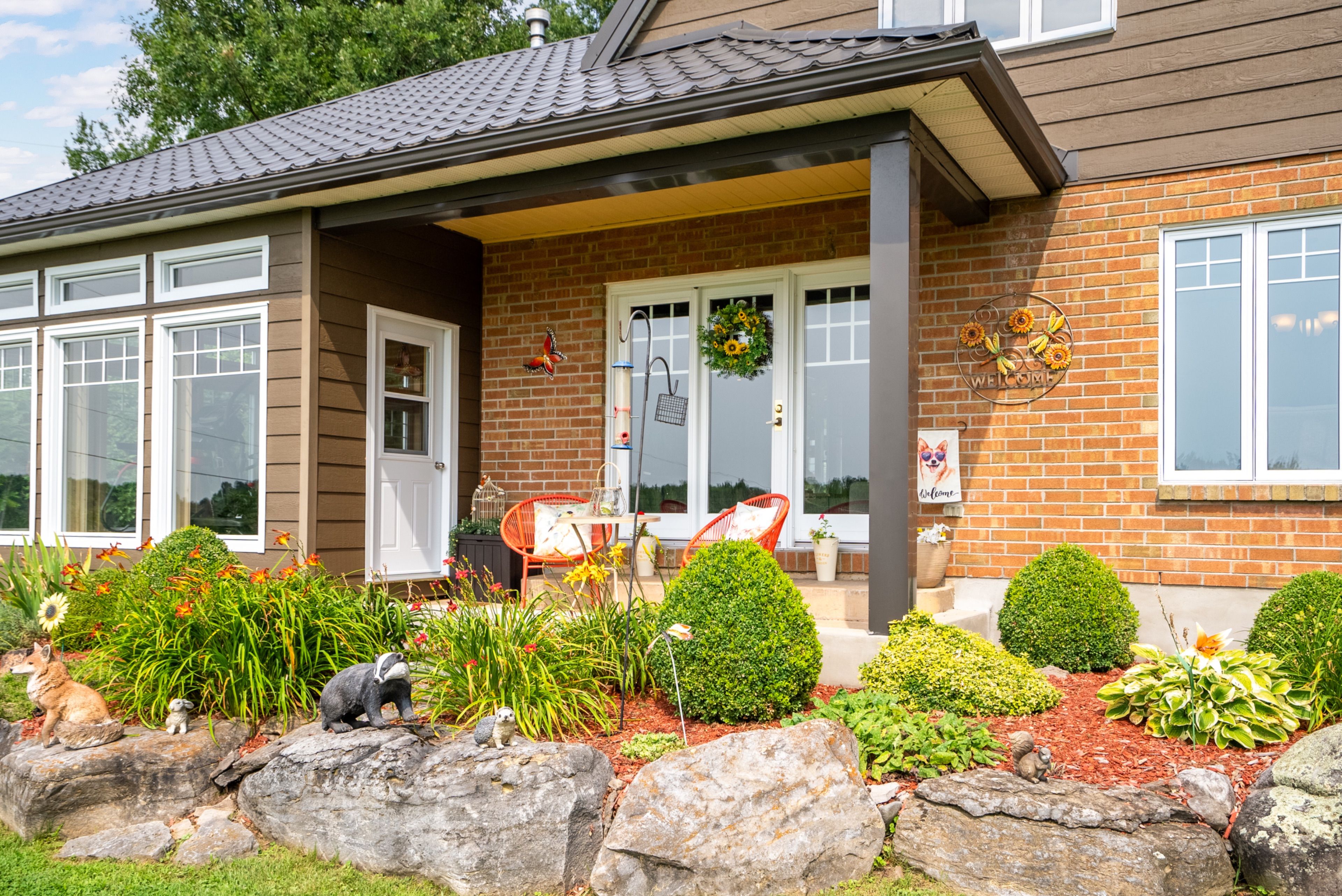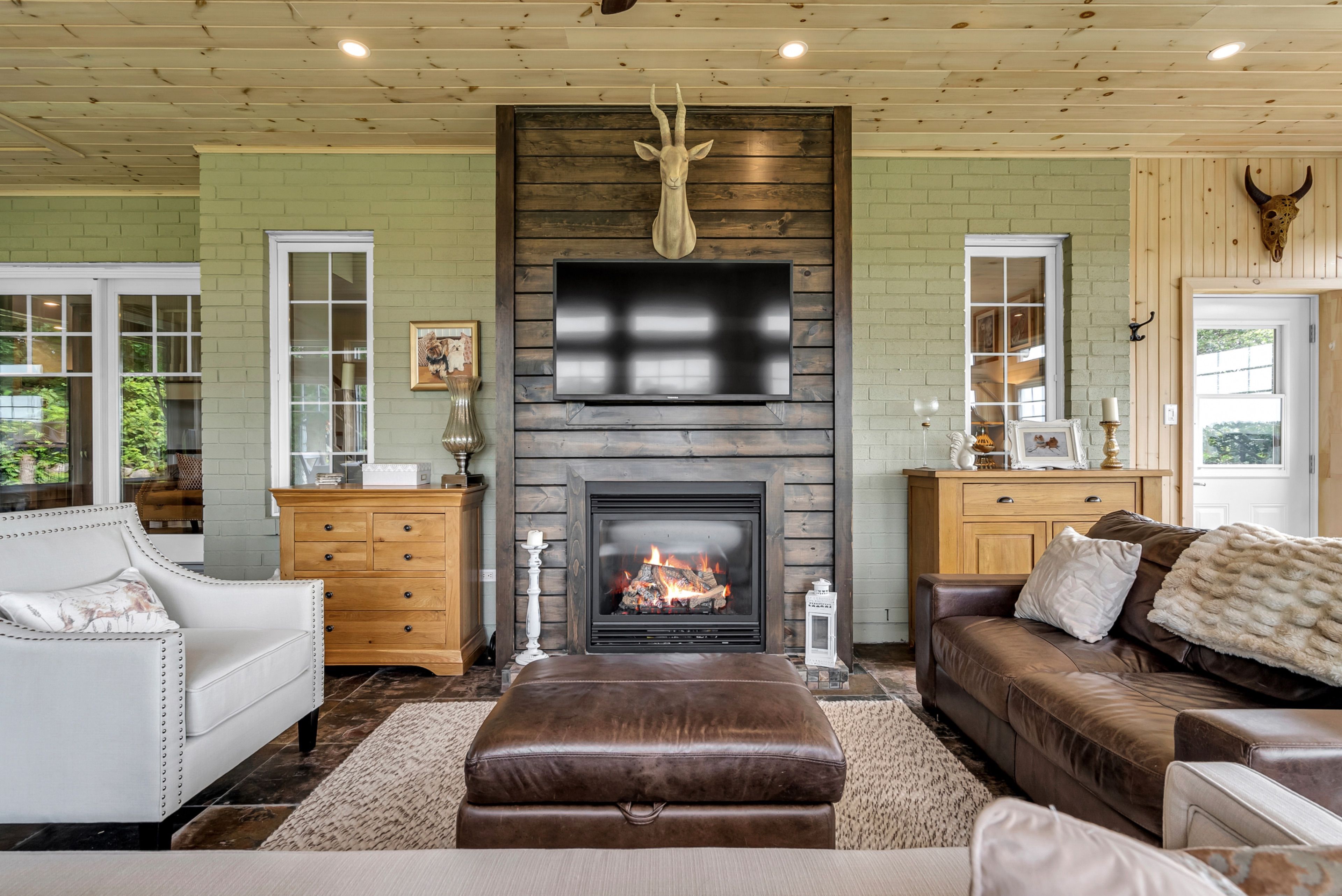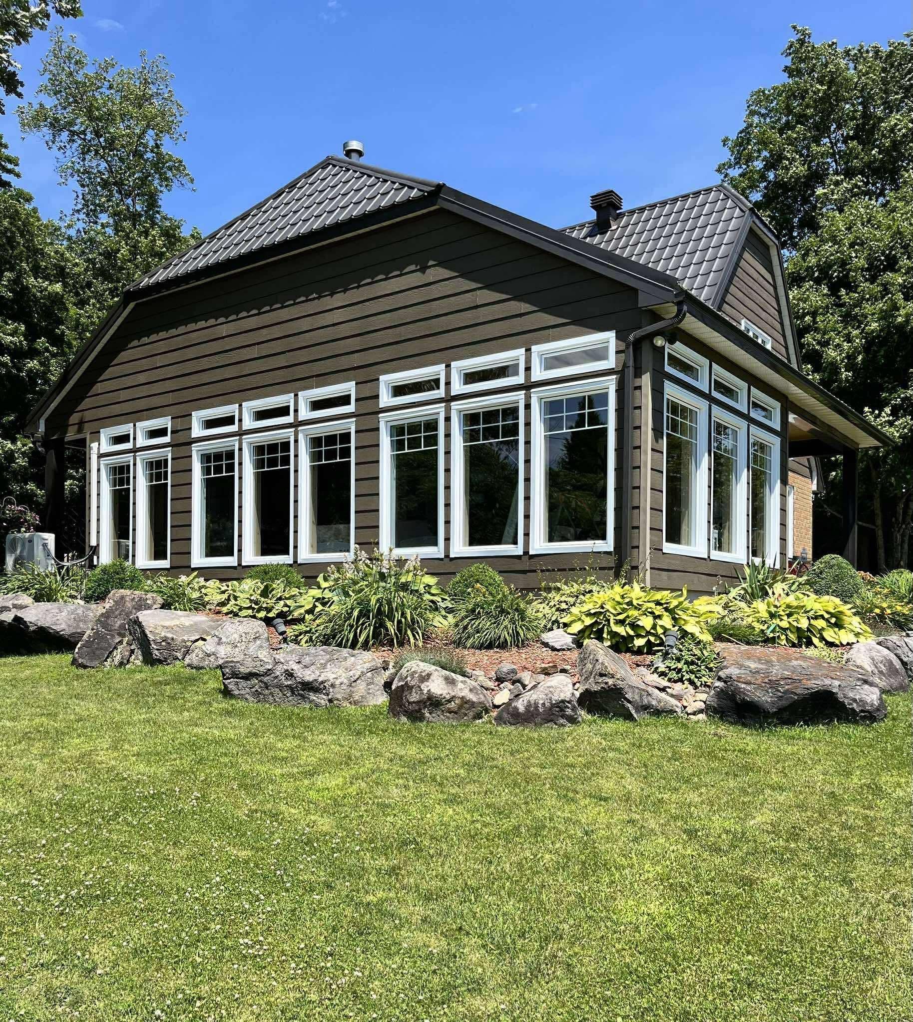 Perched high atop a picturesque 3-acre hilltop, this stunning country retreat offers breathtaking panoramic views and an unmatched sense of privacy. From the moment you arrive, the curb appeal and distinctive charm set this property apart. Step inside to a truly unique interior where style and function blend seamlessly. The custom kitchen is a standout feature, complete with solid wood cabinetry, quartz countertops, thoughtful pull-outs, and an abundance of storage, all complemented by a cozy built-in breakfast nook. Wide plank flooring carries through the main living areas, creating warmth and continuity throughout. Enjoy a formal dining space for entertaining and a welcoming living room featuring a built-in entertainment center. One of the home's most captivating spaces is the spectacular four-season sunroom, anchored by a fireplace and surrounded by wall-to-wall windows that flood the space with natural light while showcasing the incredible views. The main floor is completed by a stylish 2-piece bathroom. Upstairs, you'll find two generously sized bedrooms and a beautifully appointed 4-piece bathroom. The fully finished basement adds even more living space with a spacious rec room, an additional bedroom, and a high-end bathroom featuring a walk-in shower, along with its own separate exterior access. A metal roof and cold climate heat pump provide efficiency, durability, and peace of mind. Outside, the property continues to impress with a heated 2-car garage, an additional 1-car garage, and a massive driveway offering ample parking for all your vehicles, toys, and guests. Extensive landscaping, including perennial gardens and tiered stone walls, enhances the natural beauty of the surroundings, creating a truly serene and unforgettable setting. This is more than a home, it's a lifestyle.