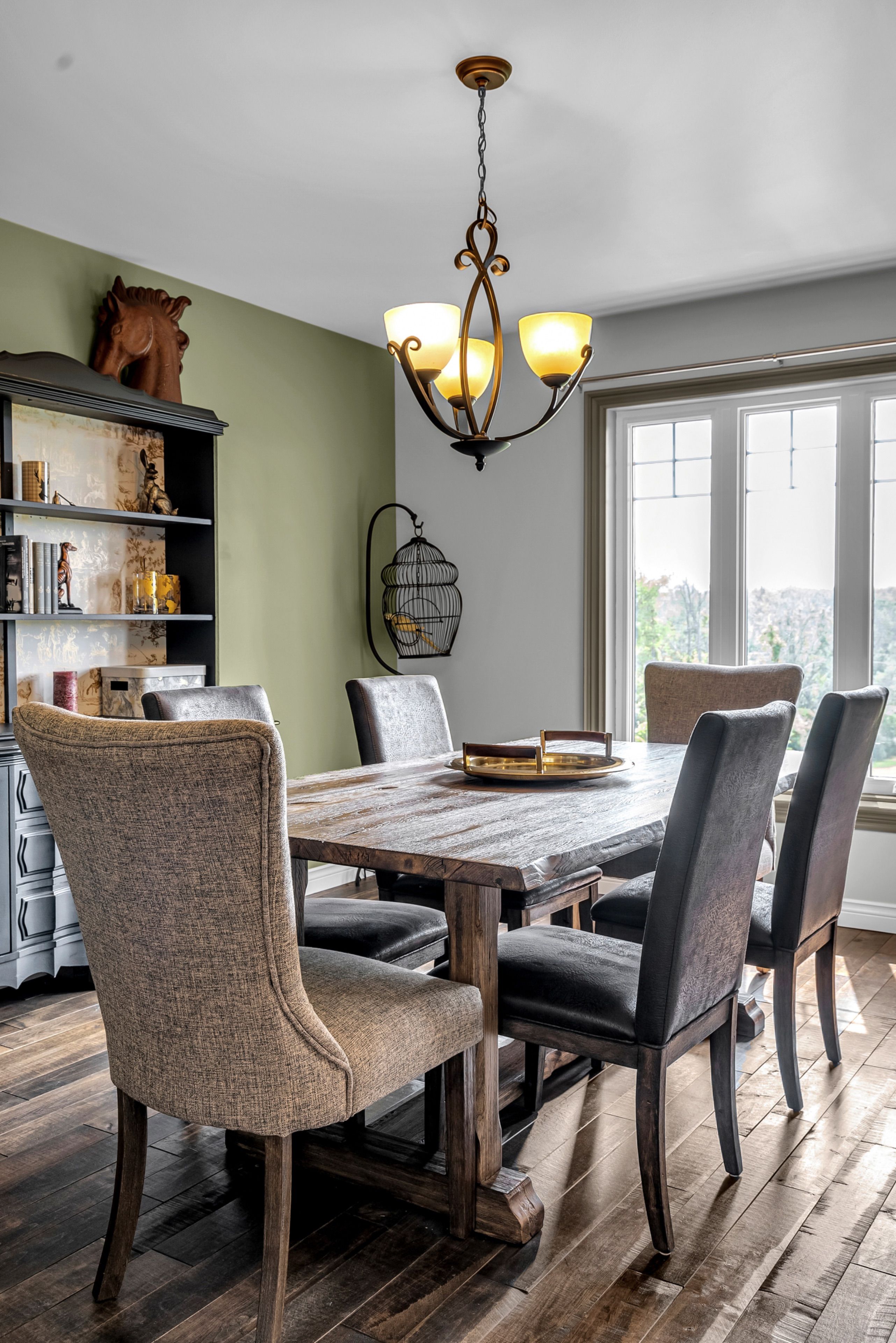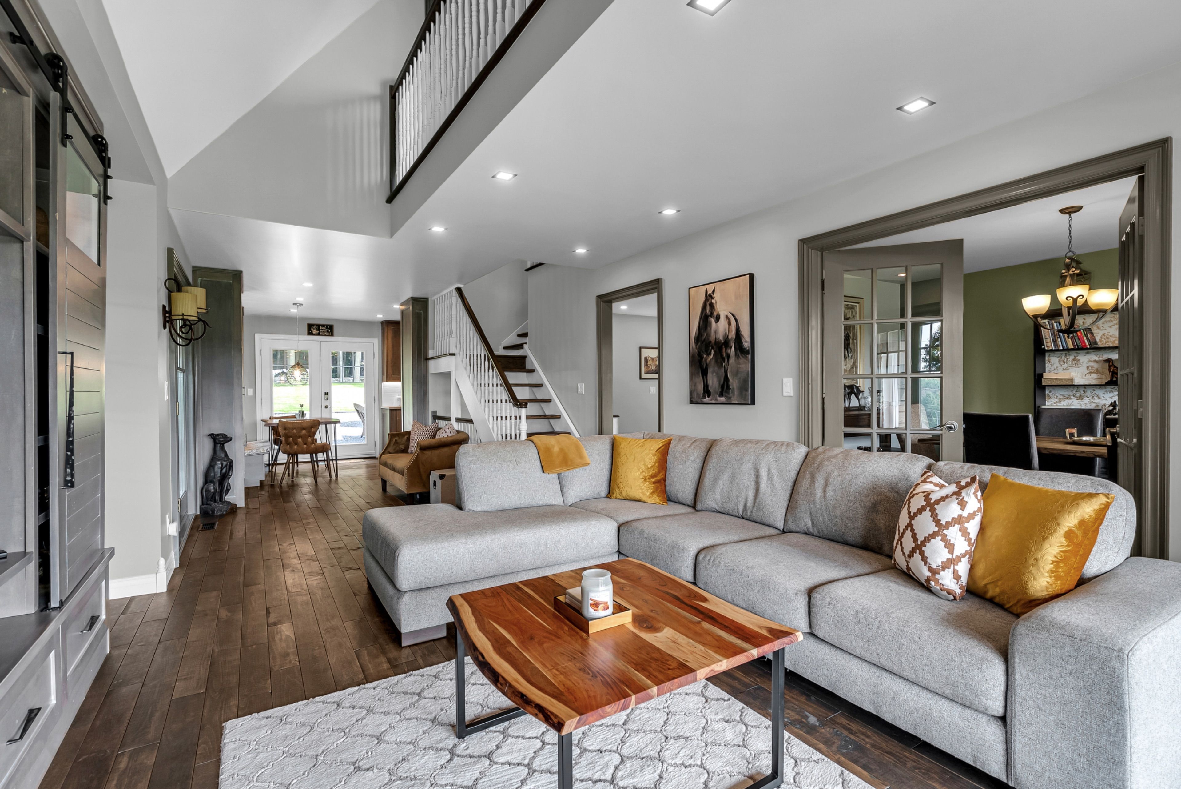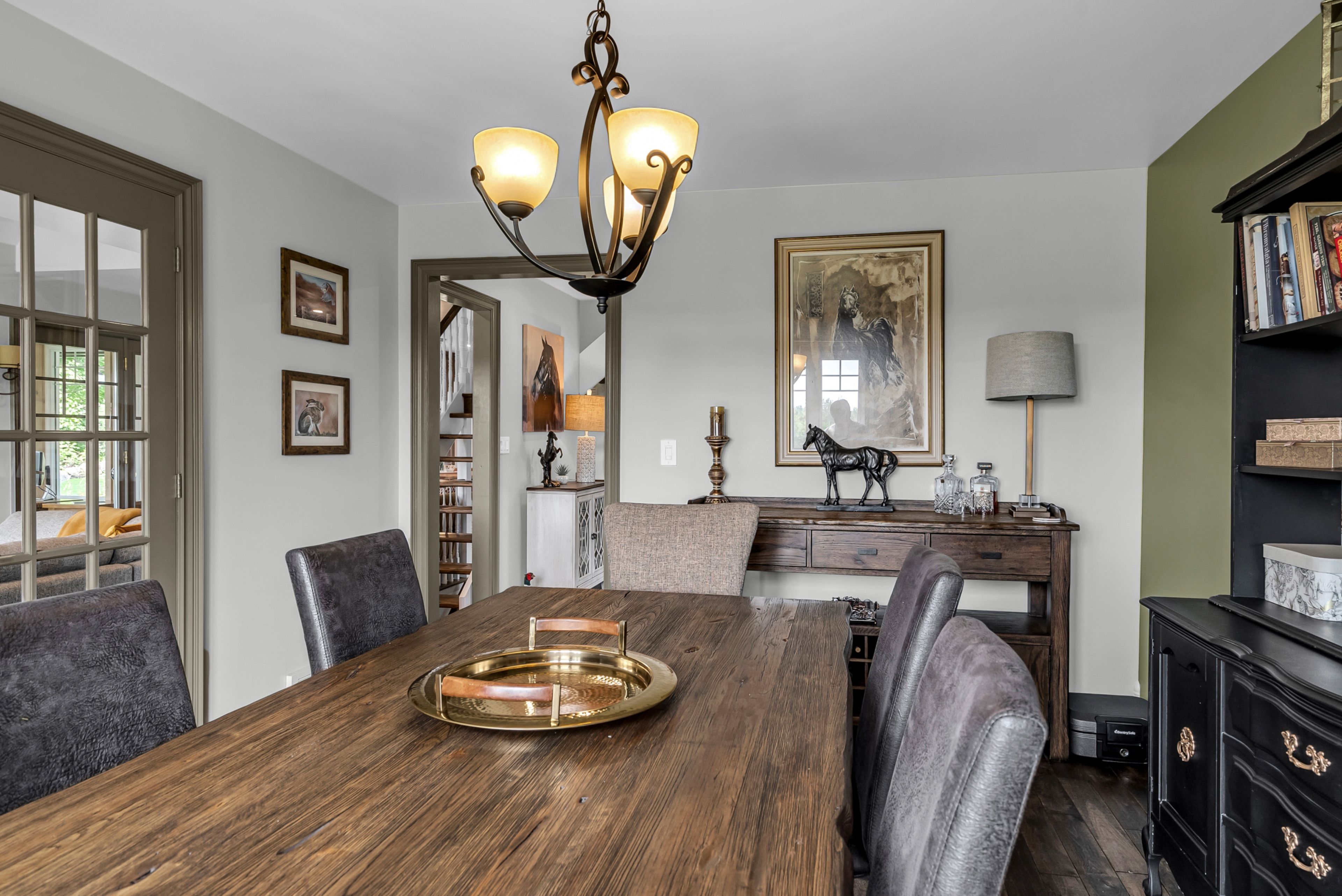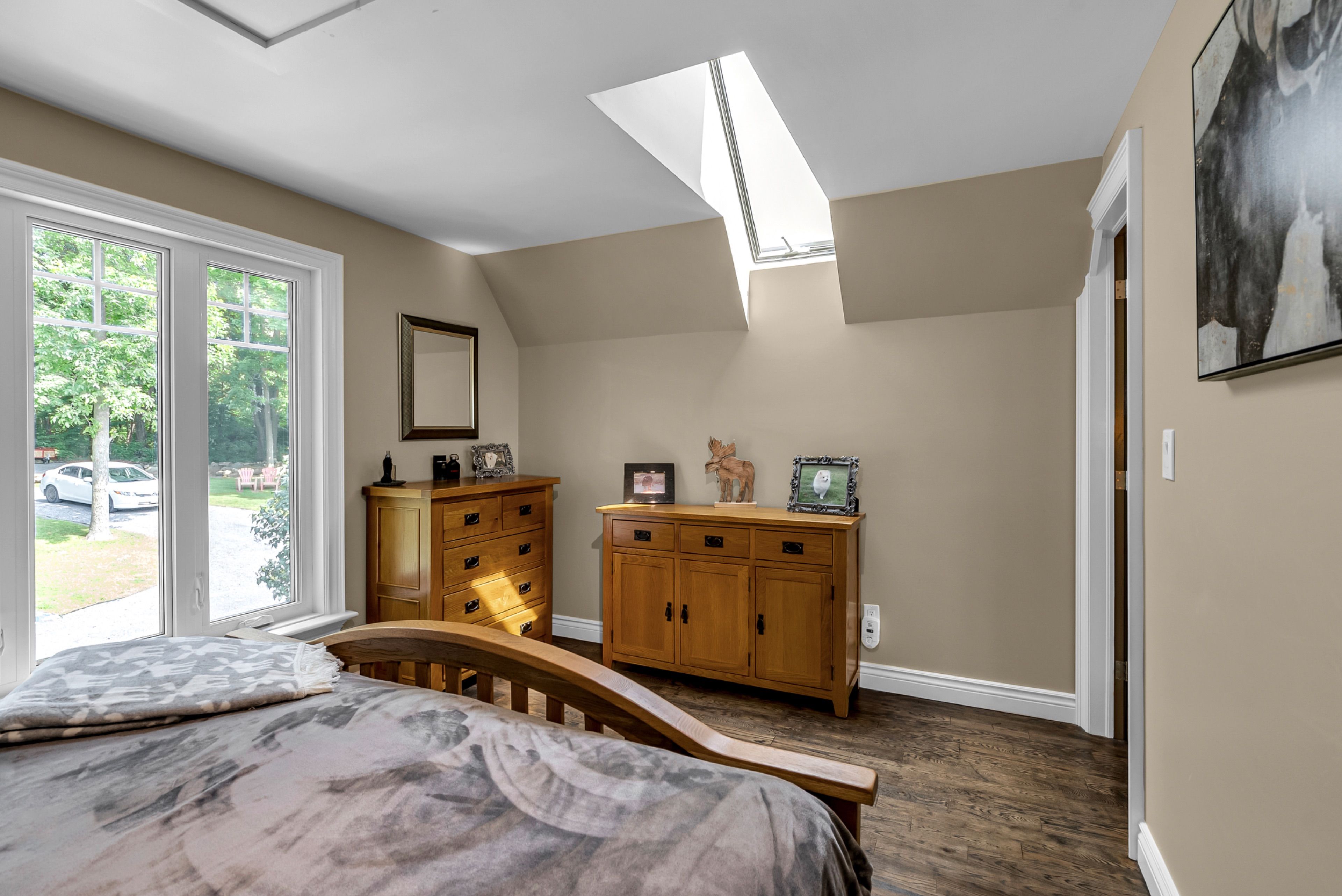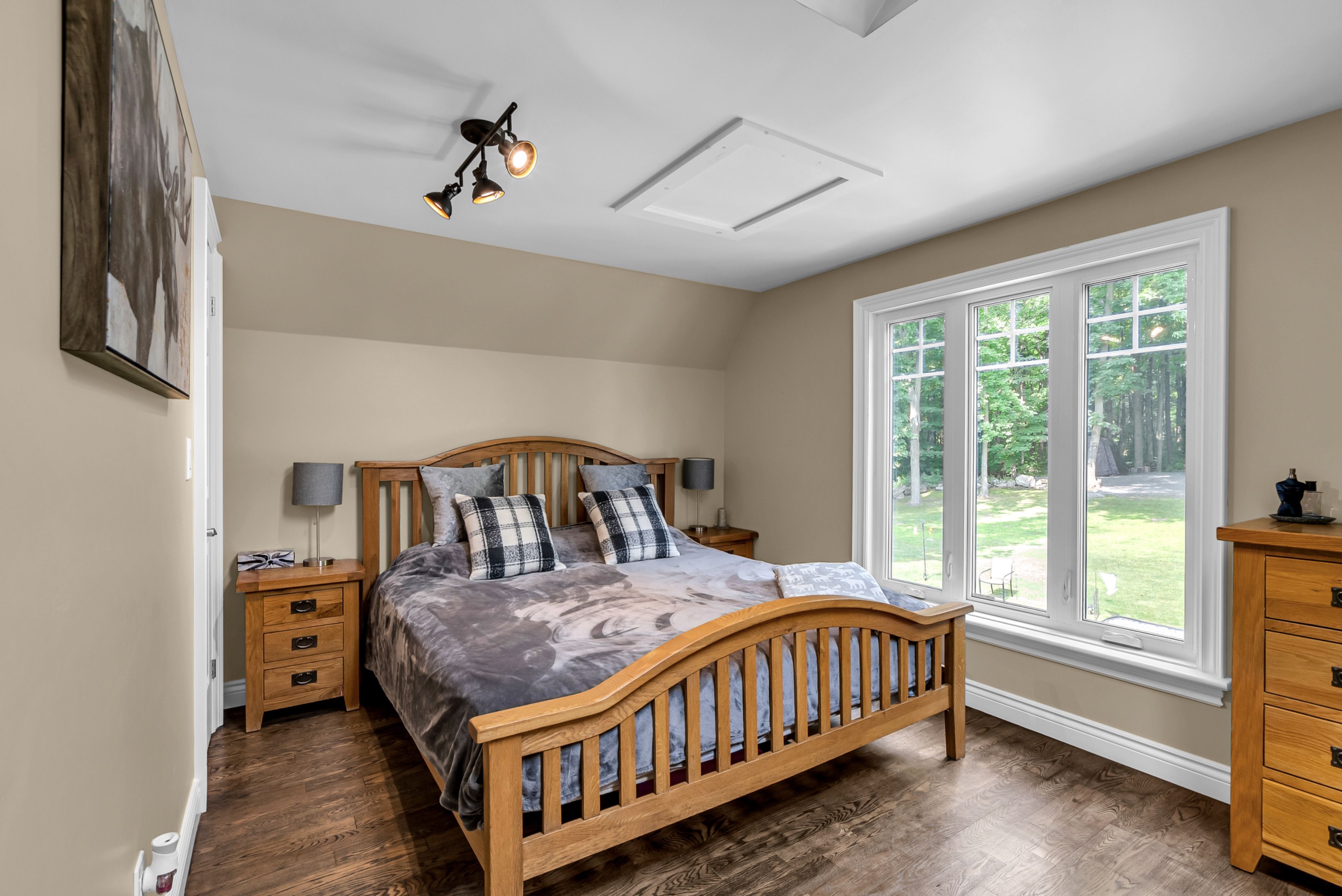 Perched high atop a picturesque 3-acre hilltop, this stunning country retreat offers breathtaking panoramic views and an unmatched sense of privacy. From the moment you arrive, the curb appeal and distinctive charm set this property apart. Step inside to a truly unique interior where style and function blend seamlessly. The custom kitchen is a standout feature, complete with solid wood cabinetry, quartz countertops, thoughtful pull-outs, and an abundance of storage, all complemented by a cozy built-in breakfast nook. Wide plank flooring carries through the main living areas, creating warmth and continuity throughout. Enjoy a formal dining space for entertaining and a welcoming living room featuring a built-in entertainment center. One of the home's most captivating spaces is the spectacular four-season sunroom, anchored by a fireplace and surrounded by wall-to-wall windows that flood the space with natural light while showcasing the incredible views. The main floor is completed by a stylish 2-piece bathroom. Upstairs, you'll find two generously sized bedrooms and a beautifully appointed 4-piece bathroom. The fully finished basement adds even more living space with a spacious rec room, an additional bedroom, and a high-end bathroom featuring a walk-in shower, along with its own separate exterior access. A metal roof and cold climate heat pump provide efficiency, durability, and peace of mind. Outside, the property continues to impress with a heated 2-car garage, an additional 1-car garage, and a massive driveway offering ample parking for all your vehicles, toys, and guests. Extensive landscaping, including perennial gardens and tiered stone walls, enhances the natural beauty of the surroundings, creating a truly serene and unforgettable setting. This is more than a home, it's a lifestyle.