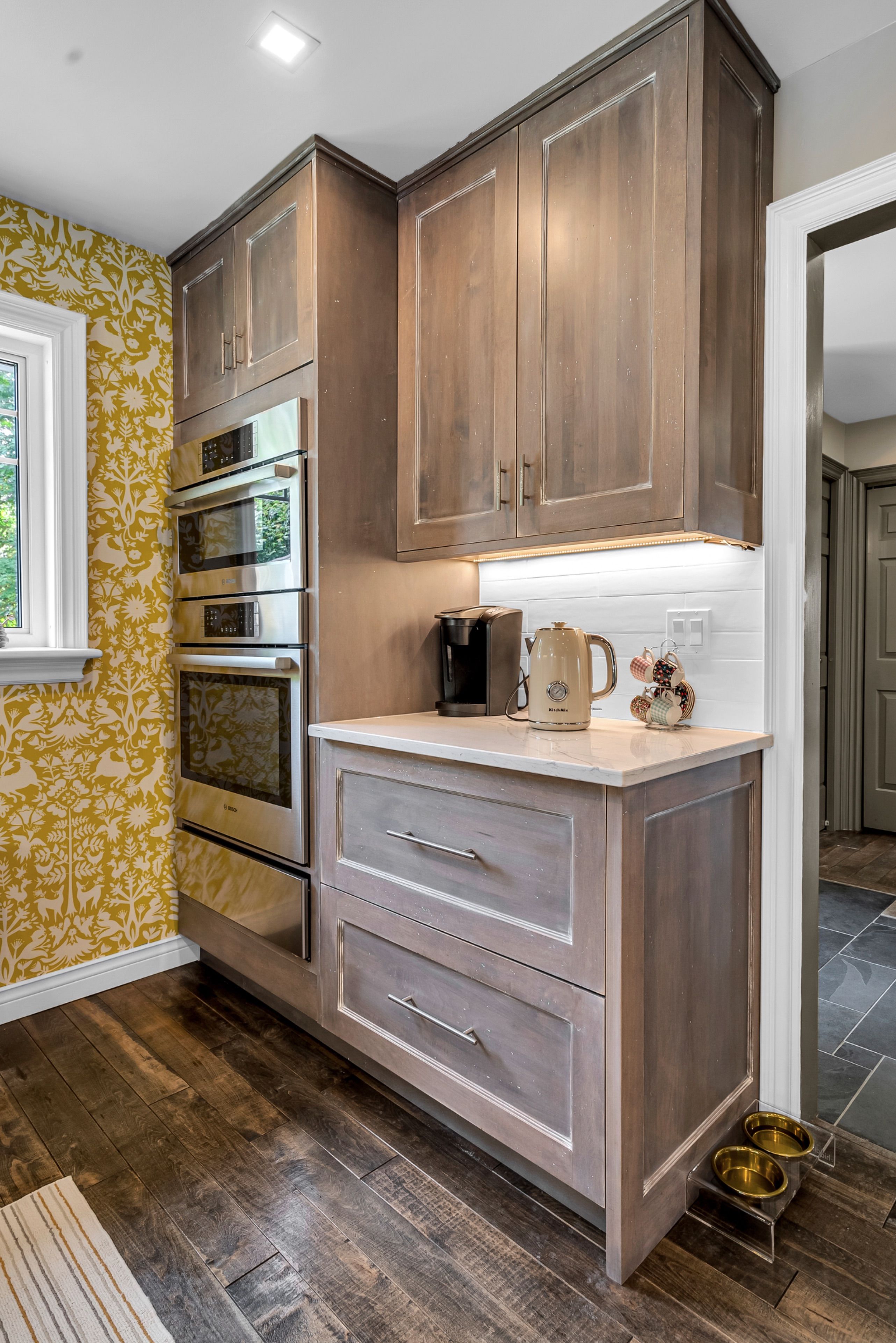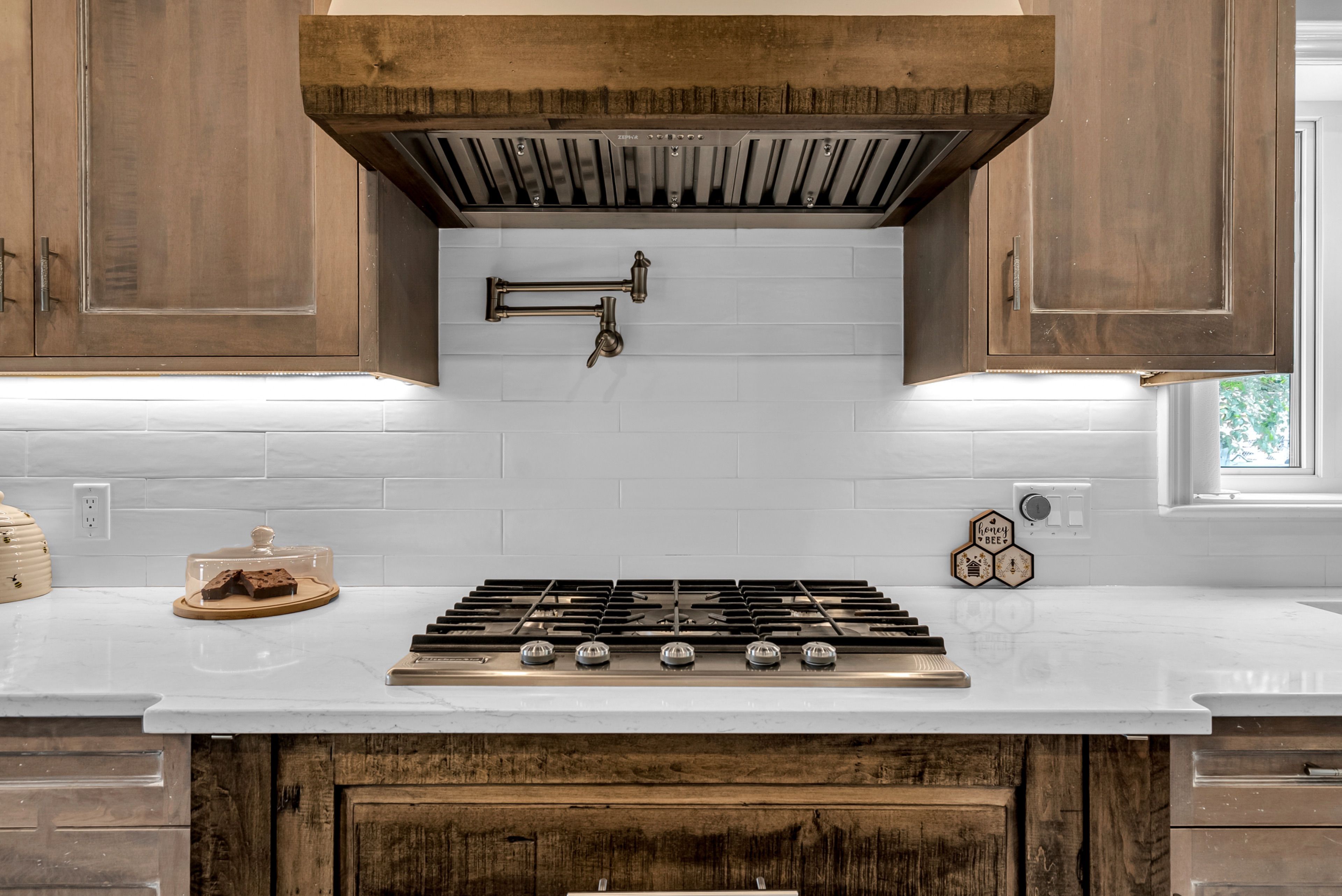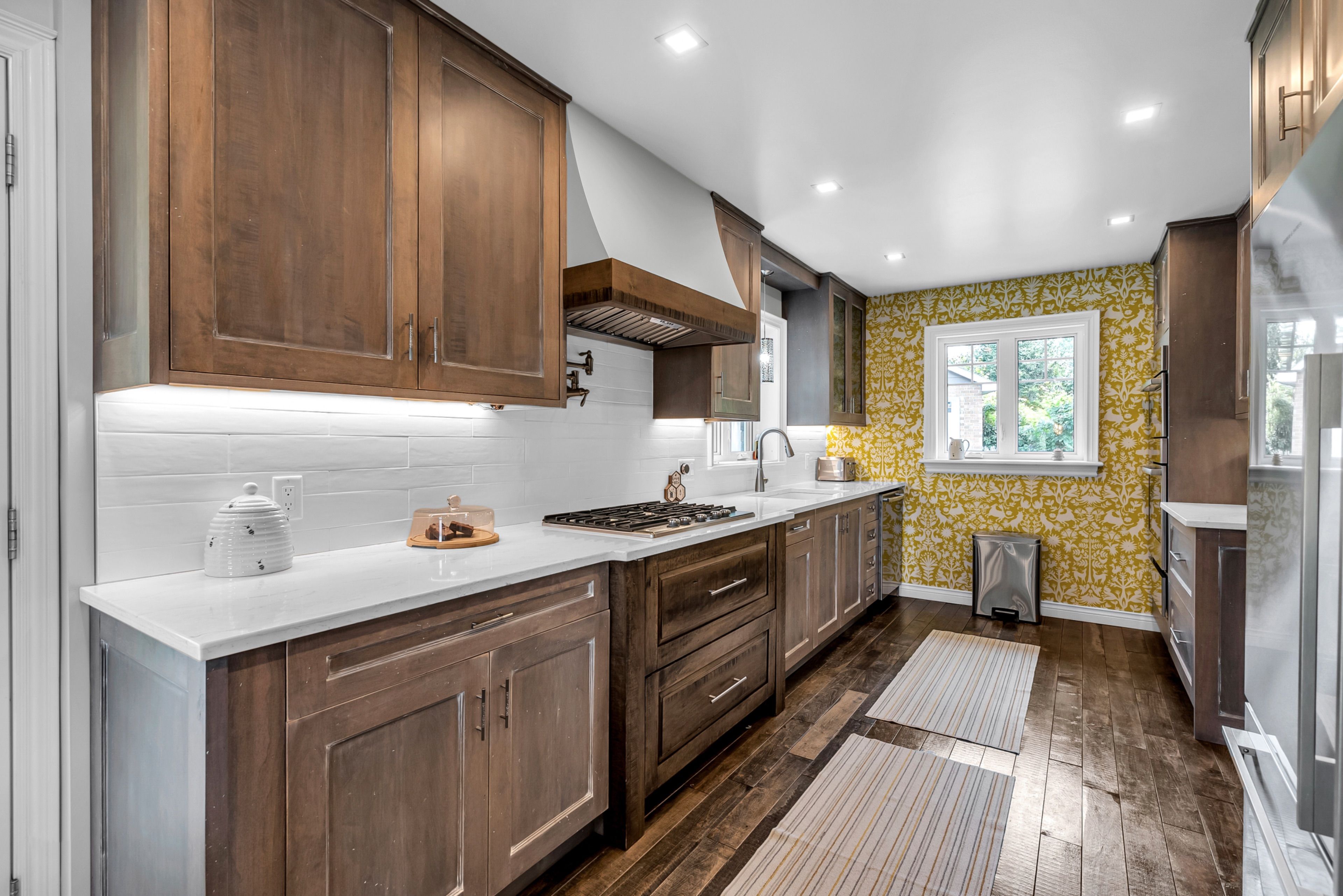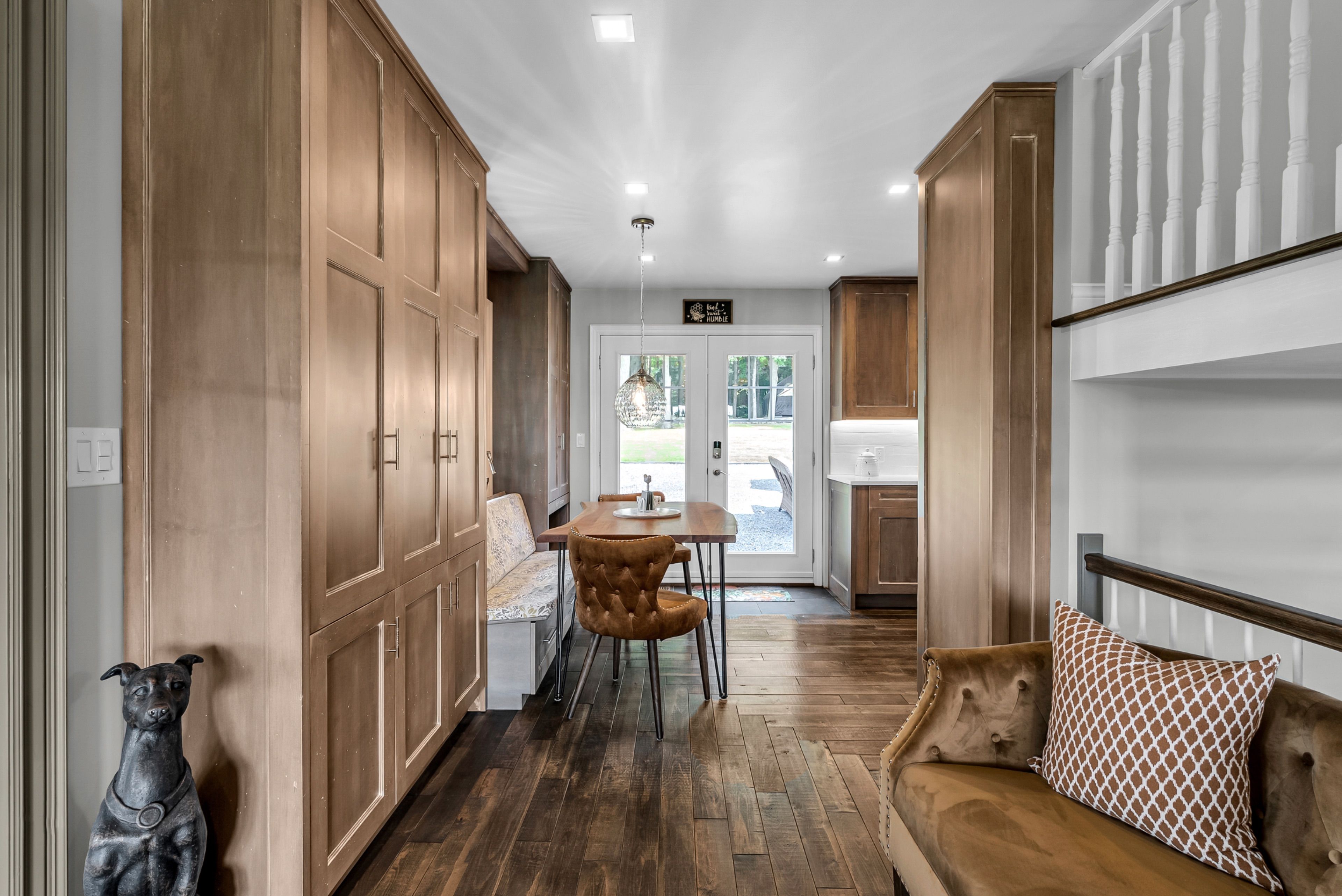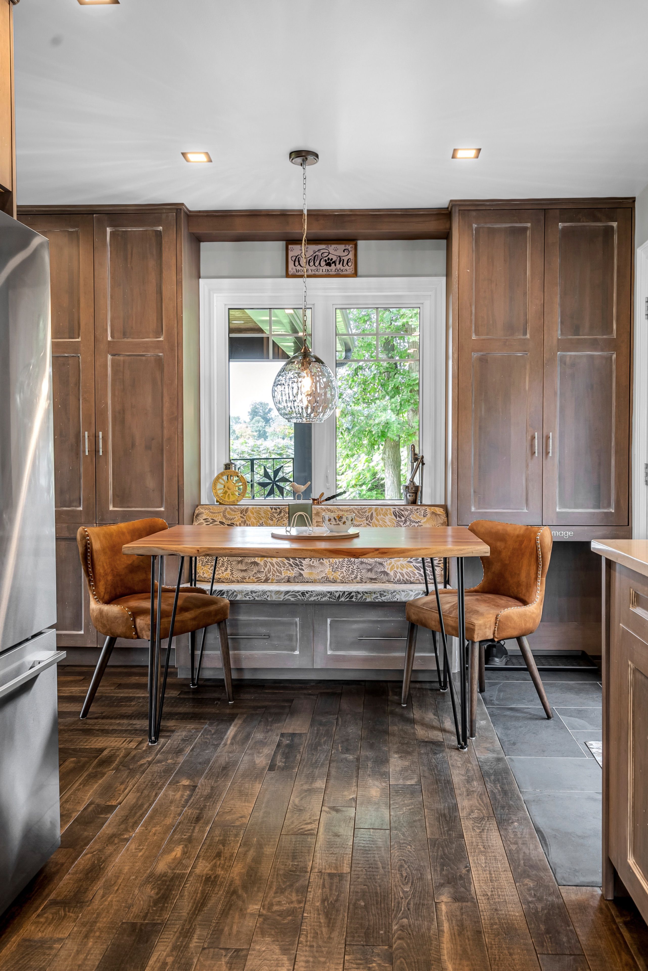 • Custom kitchen with solid wood cabinetry and cozy breakfast nook.