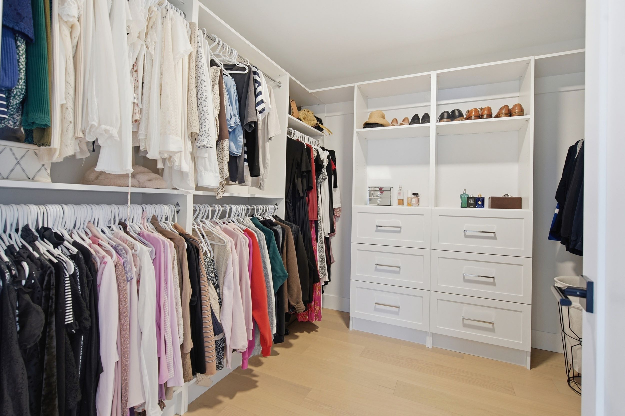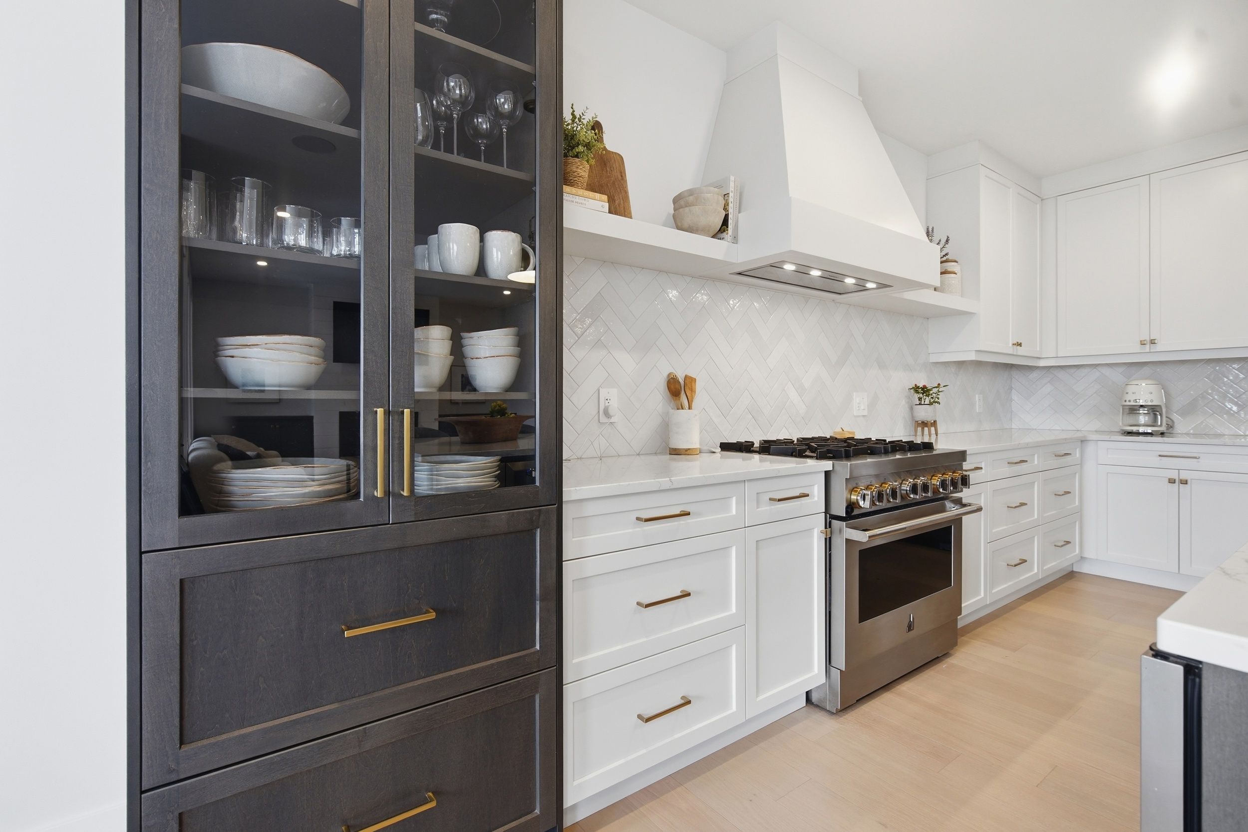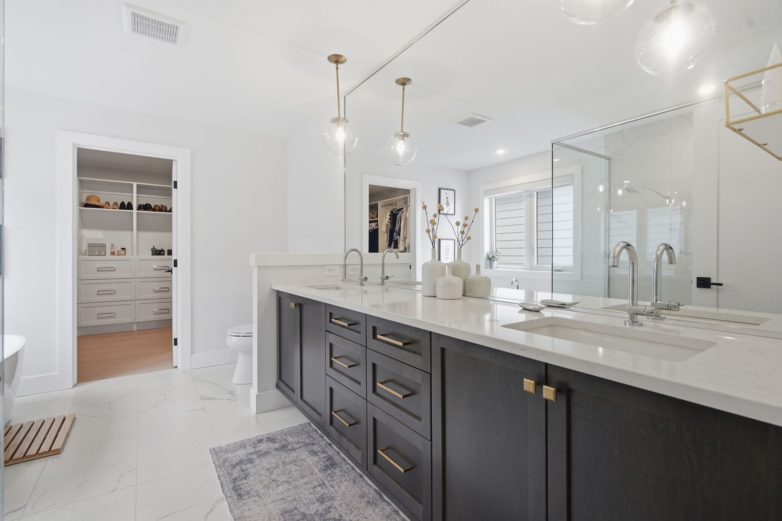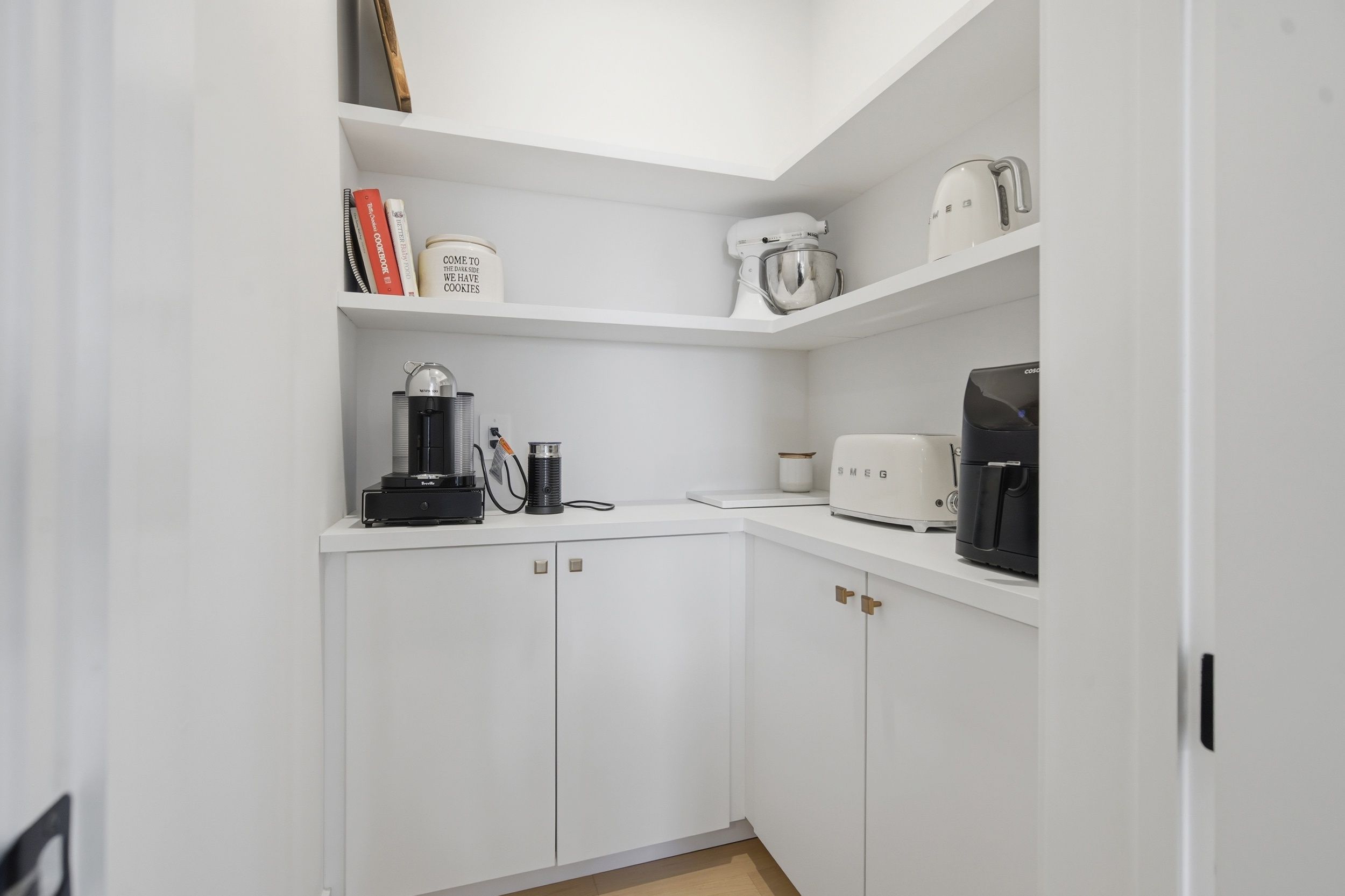 • Functional kitchen features quartz countertops, custom cabinetry, and a walk-in pantry.