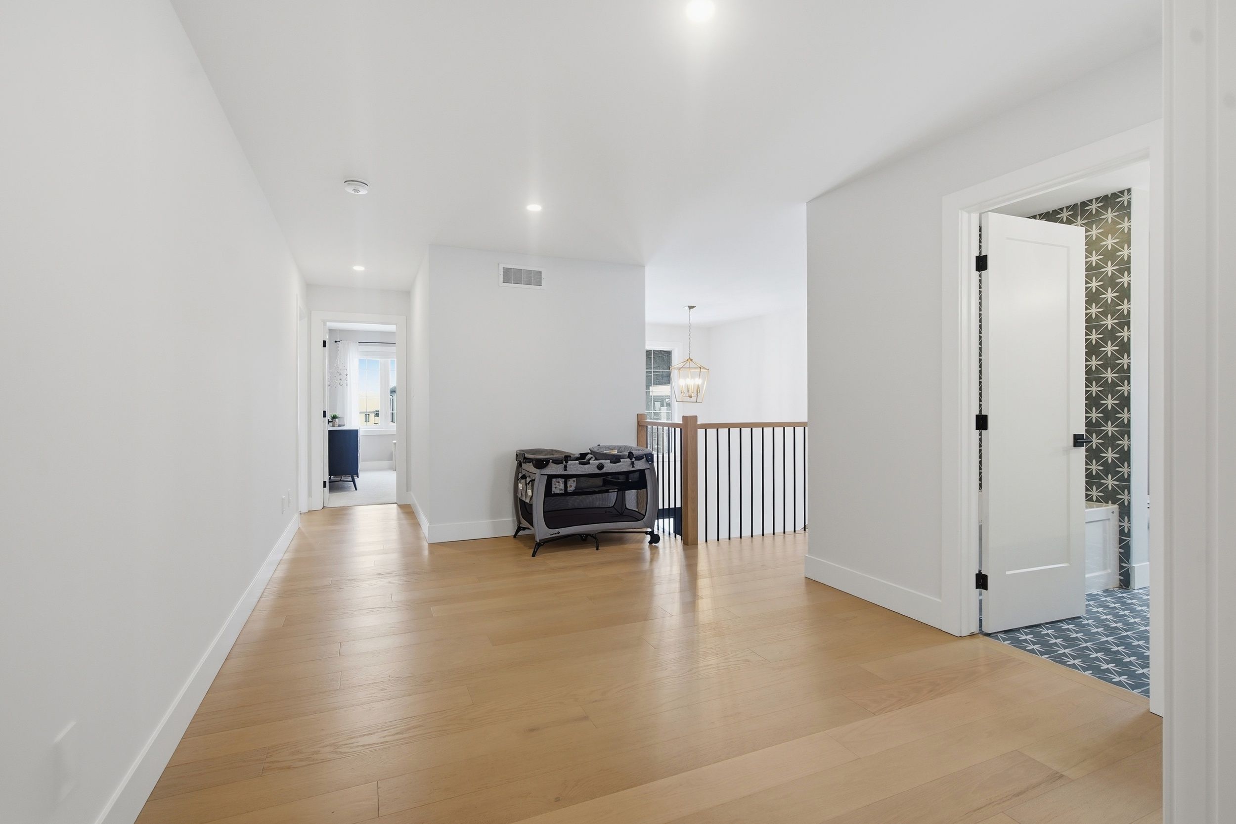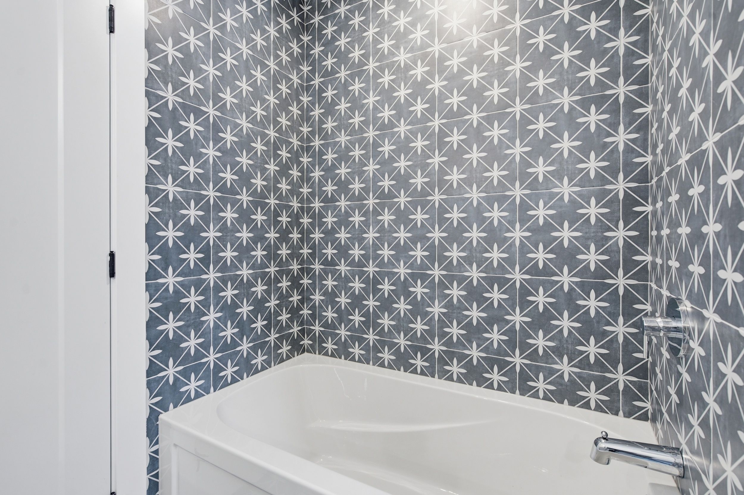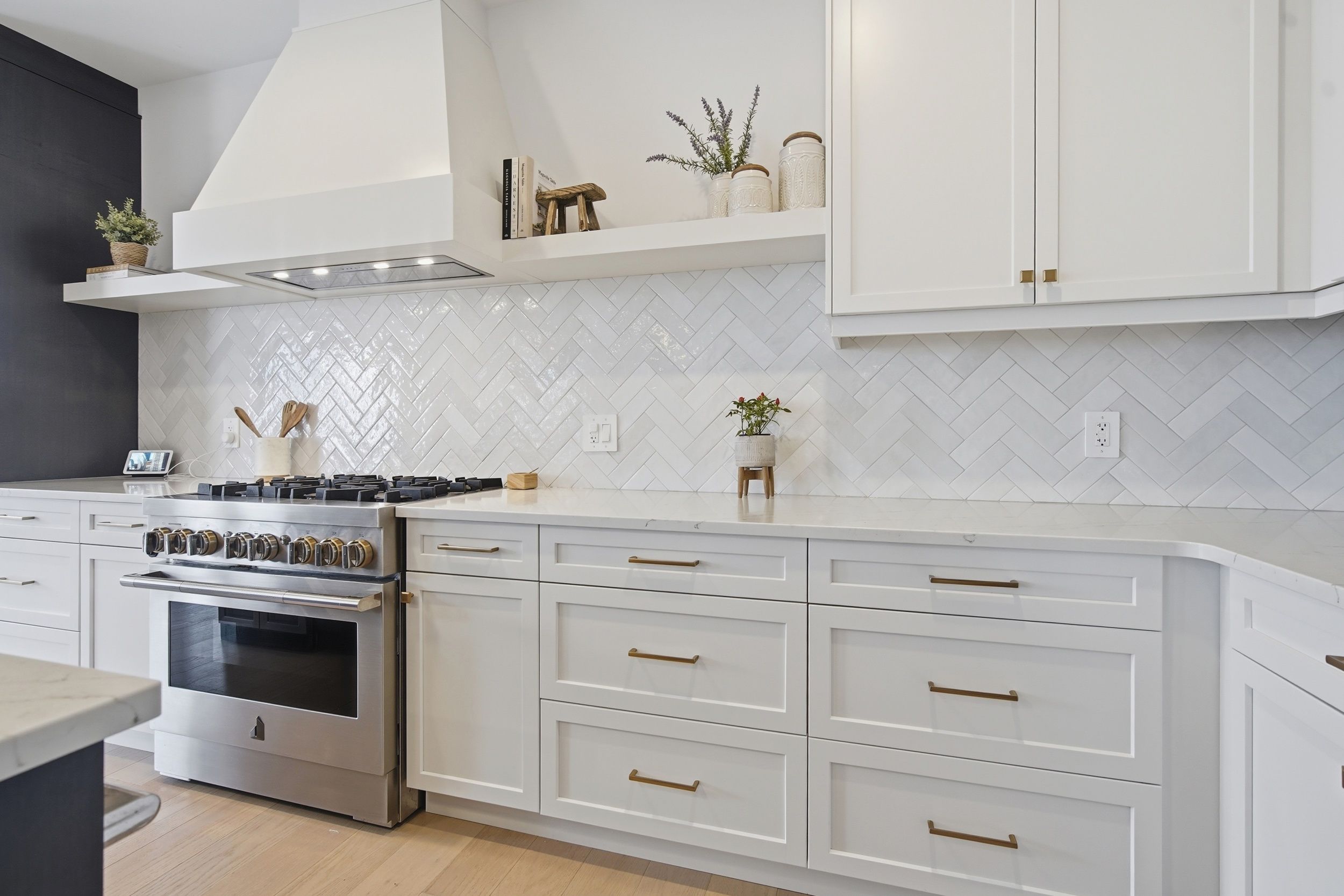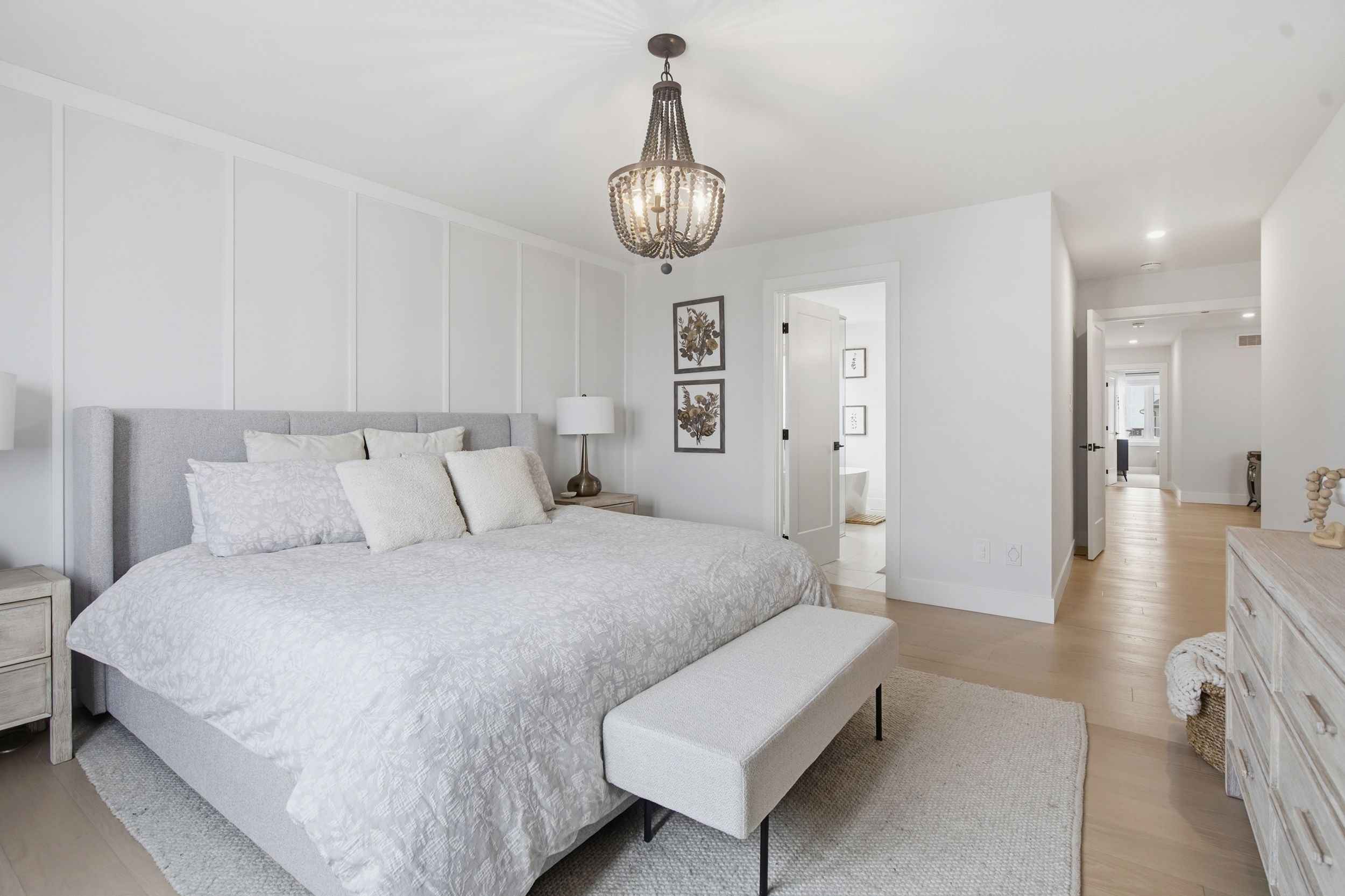 • Functional kitchen features quartz countertops, custom cabinetry, and a walk-in pantry.