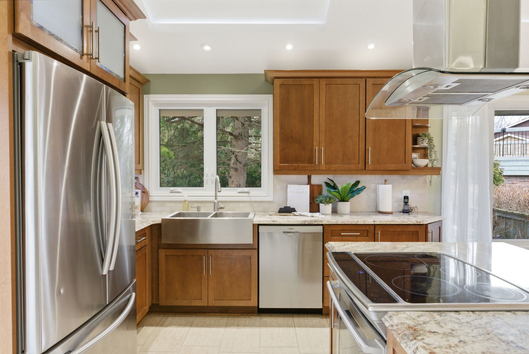 • Modern kitchen featuring granite counters and stainless steel appliances.