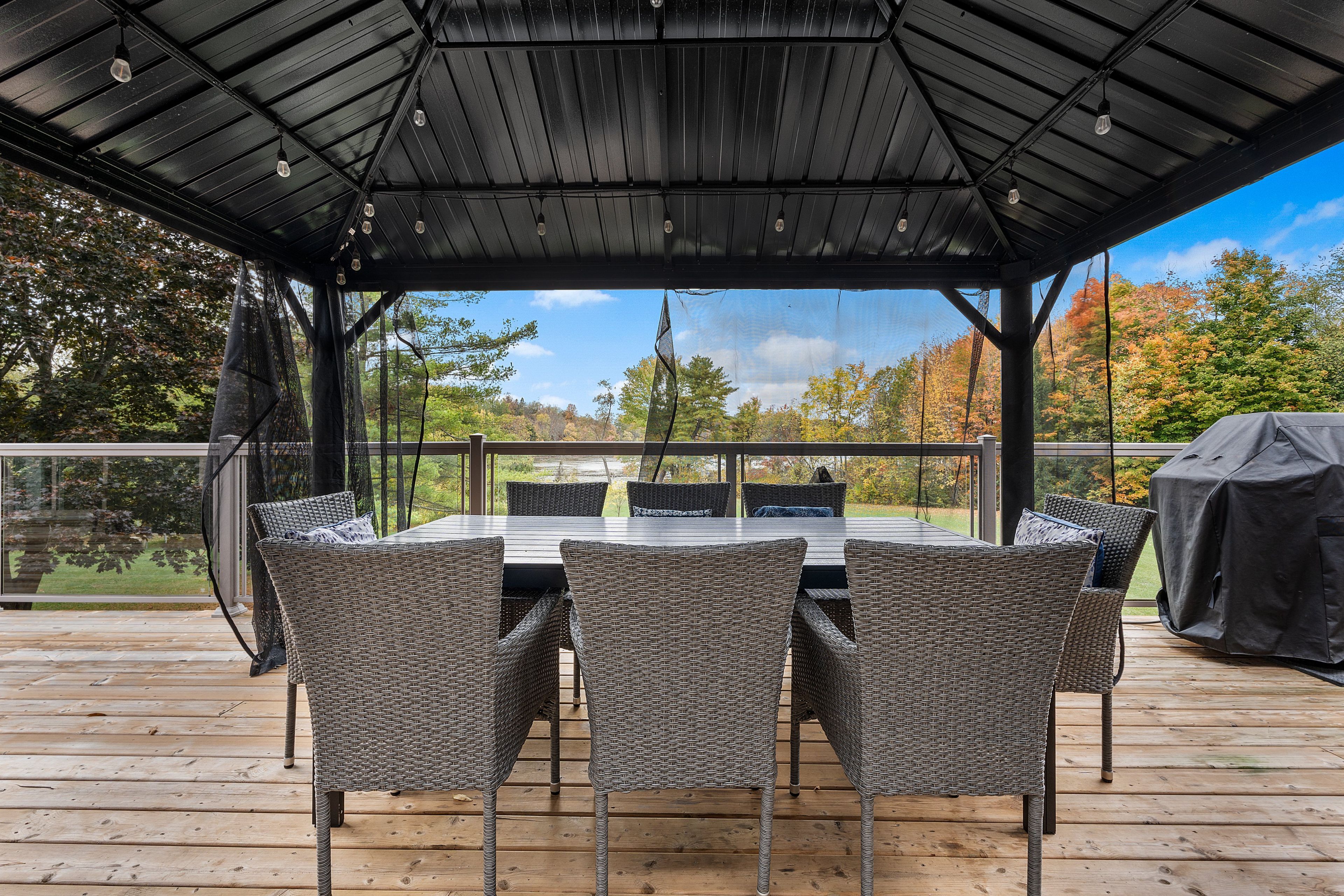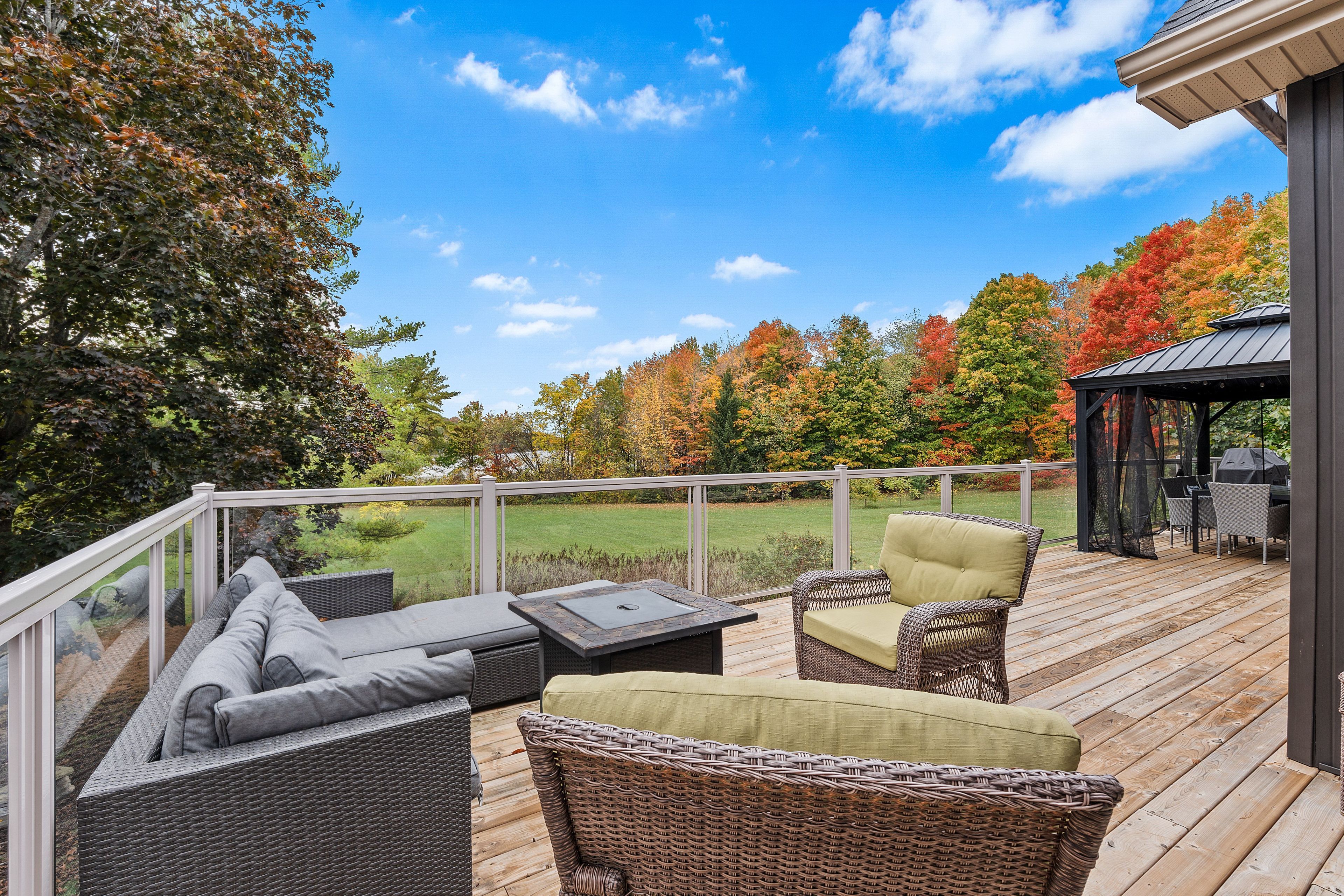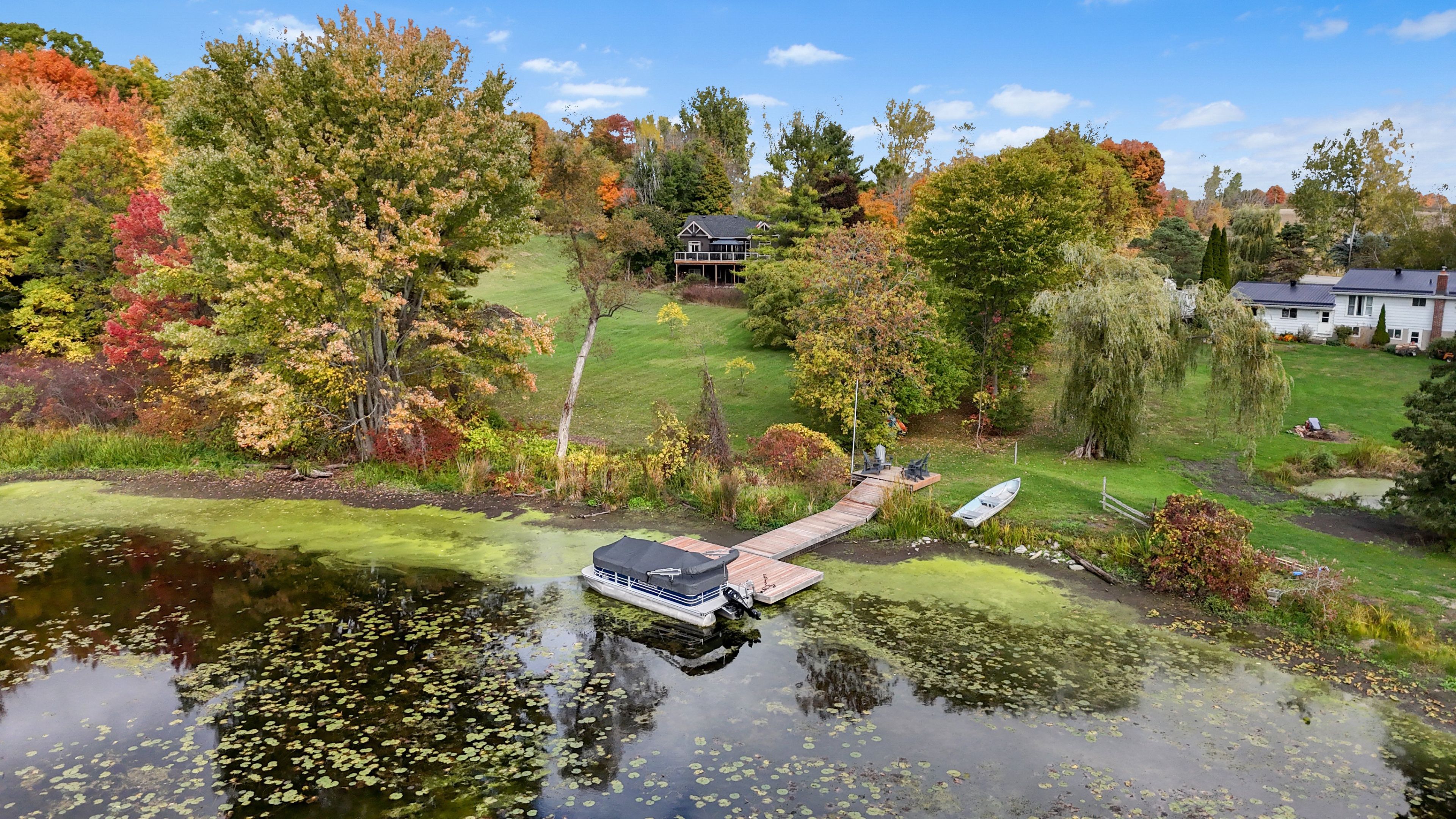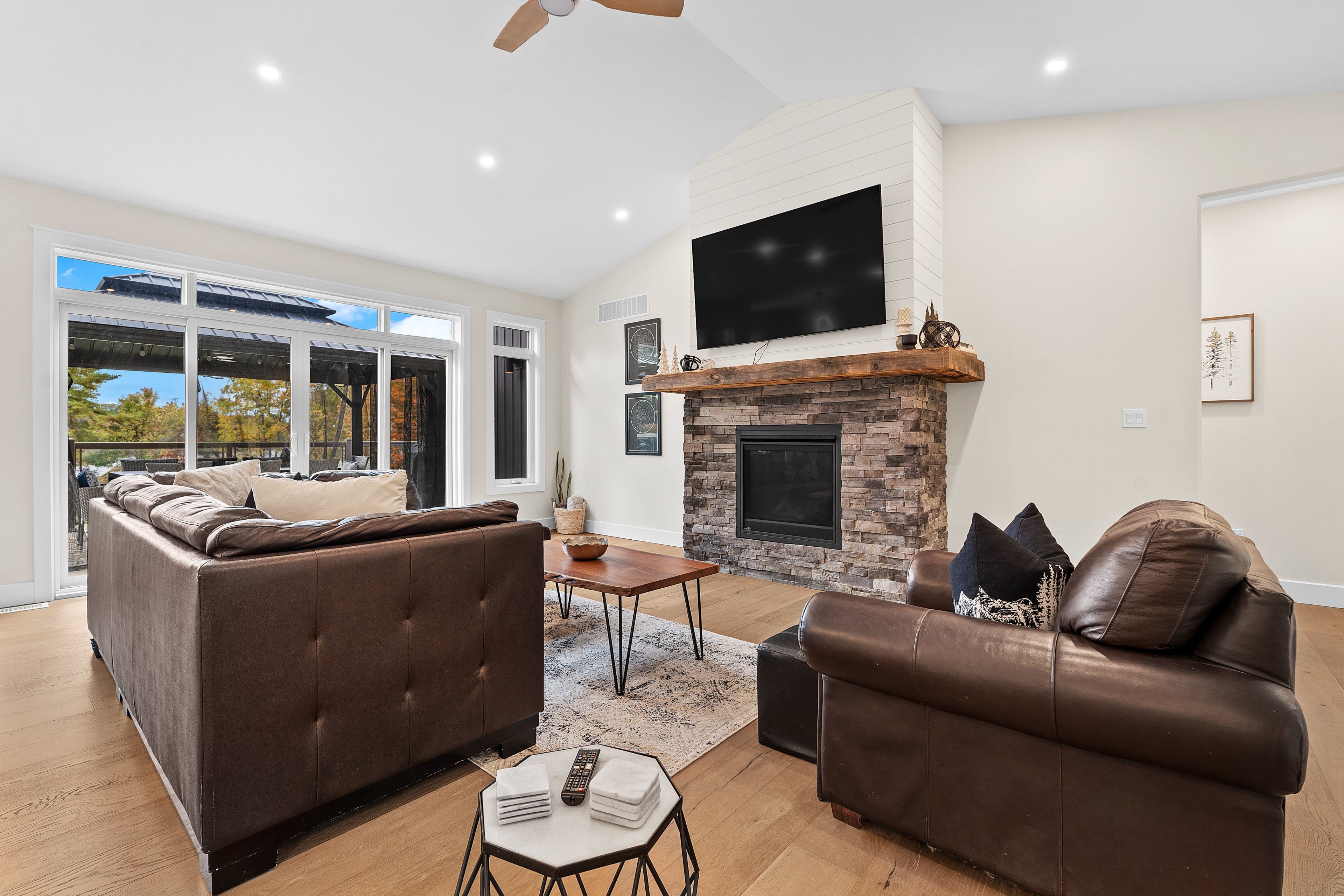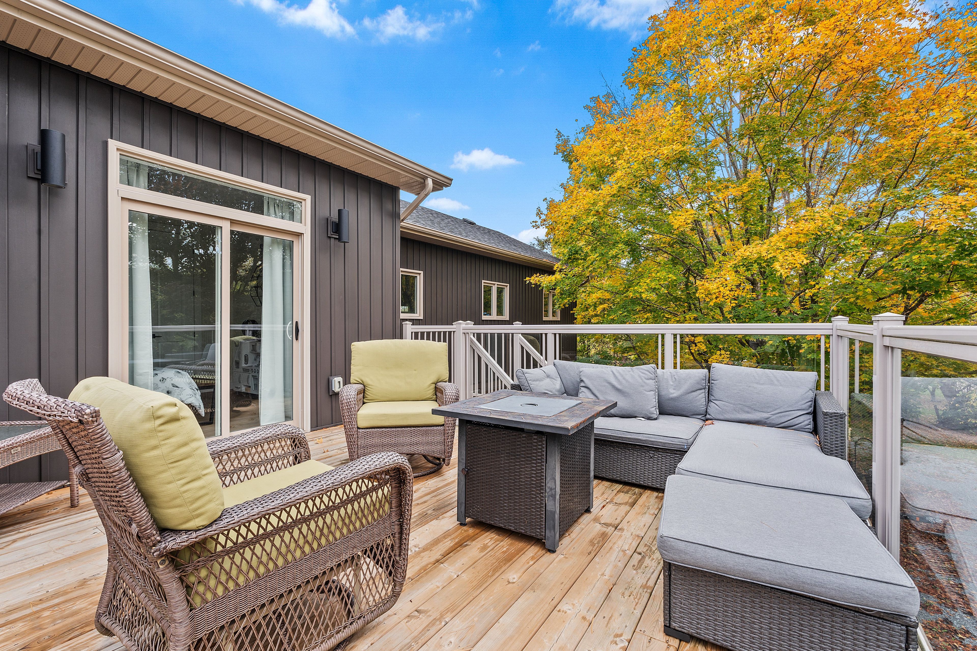 Discover lakeside living at its best with this stunning custom-built bungalow, offering over 2,000 sq. Ft. Of main floor living space and nearly 60' of shoreline on dog lake. Crafted with both quality and comfort in mind, this home features an icf foundation, soaring 10' ceilings, a vast partially finished walk-out lower level, and engineered hardwood & tile flooring throughout. The open concept impresses, with the bright kitchen featuring quartz countertops, premium cabinetry and large separate dining area open to the spacious living room - highlighted by a gas fireplace and 12-foot patio doors leading to a 650 sq. Ft. Deck with glass and aluminum railings providing breathtaking panoramic views of the area. The primary suite is tucked away at one end of the home offering privacy, and finished with cove ceilings and a spa inspired 5-piece ensuite with glass-enclosed shower and soaker tub. Two other bedrooms and a full bath are also here on the main level. The walk-out lower level provides extra flex space and finds in-floor heating roughed-in, and the attached six-car garage with epoxy flooring is incredible. This one is a beauty - with wonderful curb appeal from the stamped concrete front porch all the way around the yard space right to the waterfront with a new floating dock. Packed with upgrades and with high end finishes throughout, this one should not be missed. Survey, floor plans and supporting documents are available upon request.