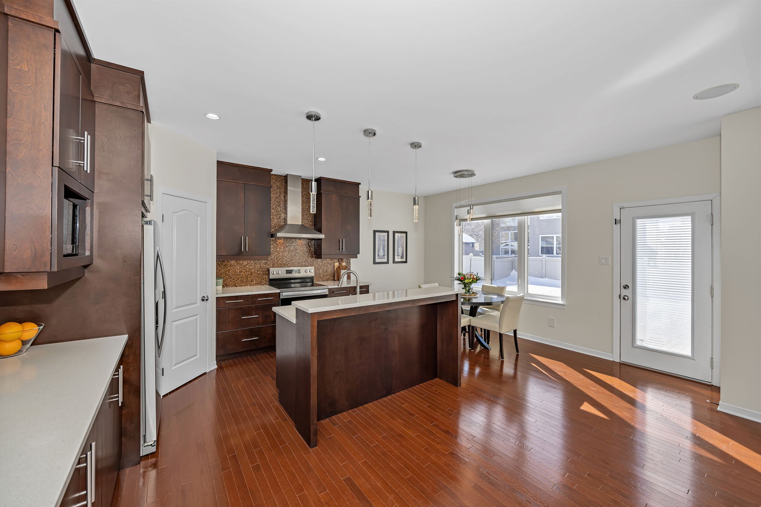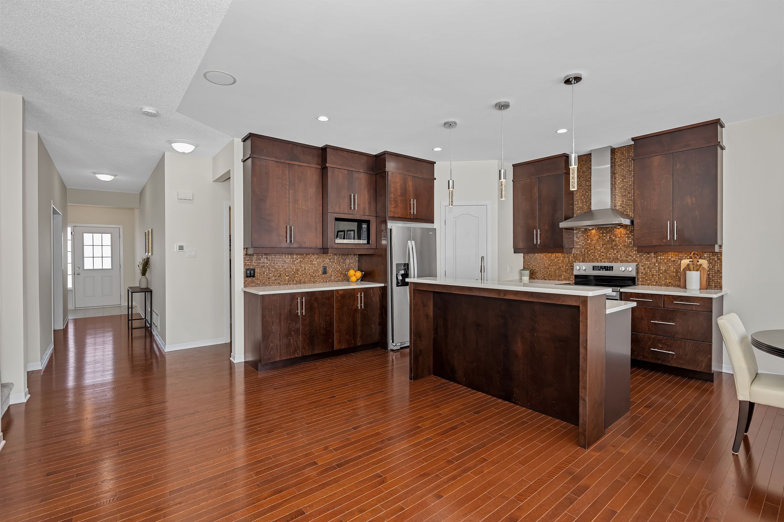• Open-concept main level with hardwood floors and a custom kitchen.