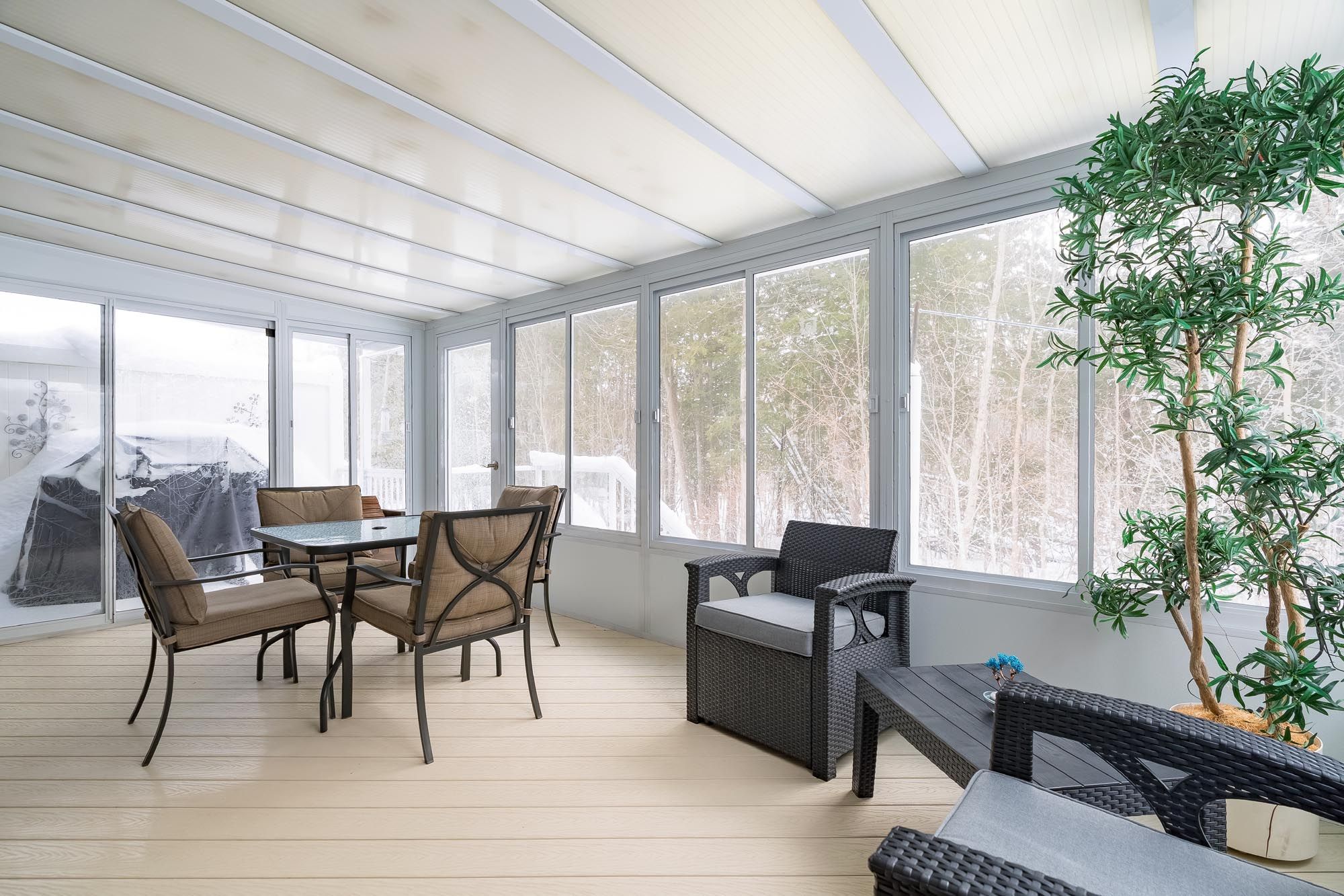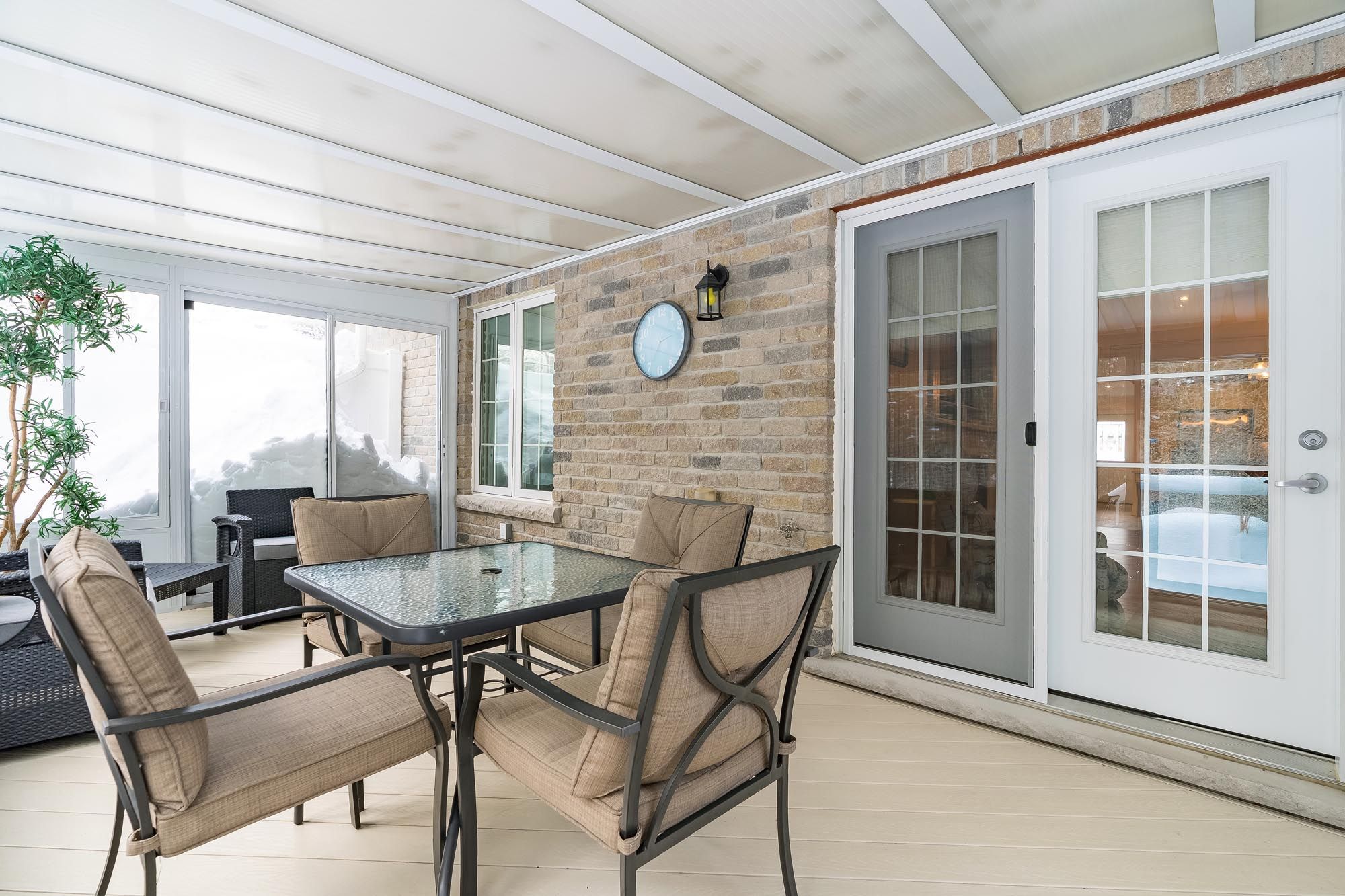 • Three-season sunroom extending living space with peaceful forest views.