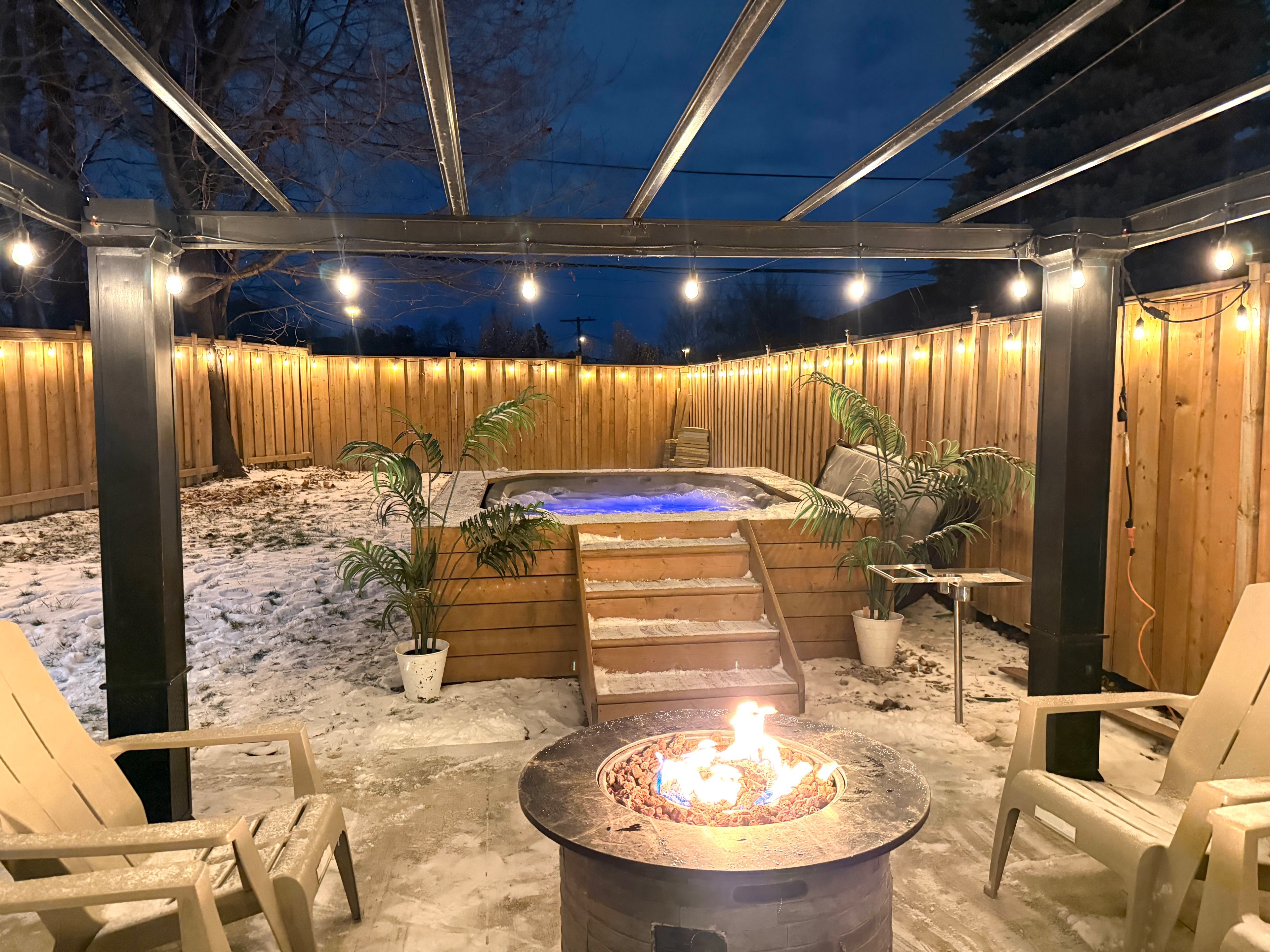 • Private backyard retreat with patio, fire table, and relaxing hot tub.