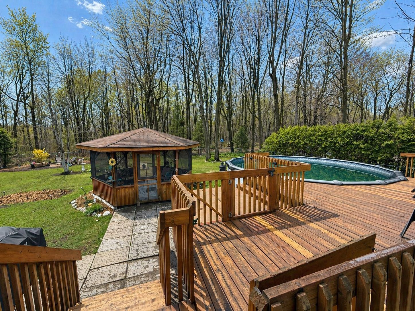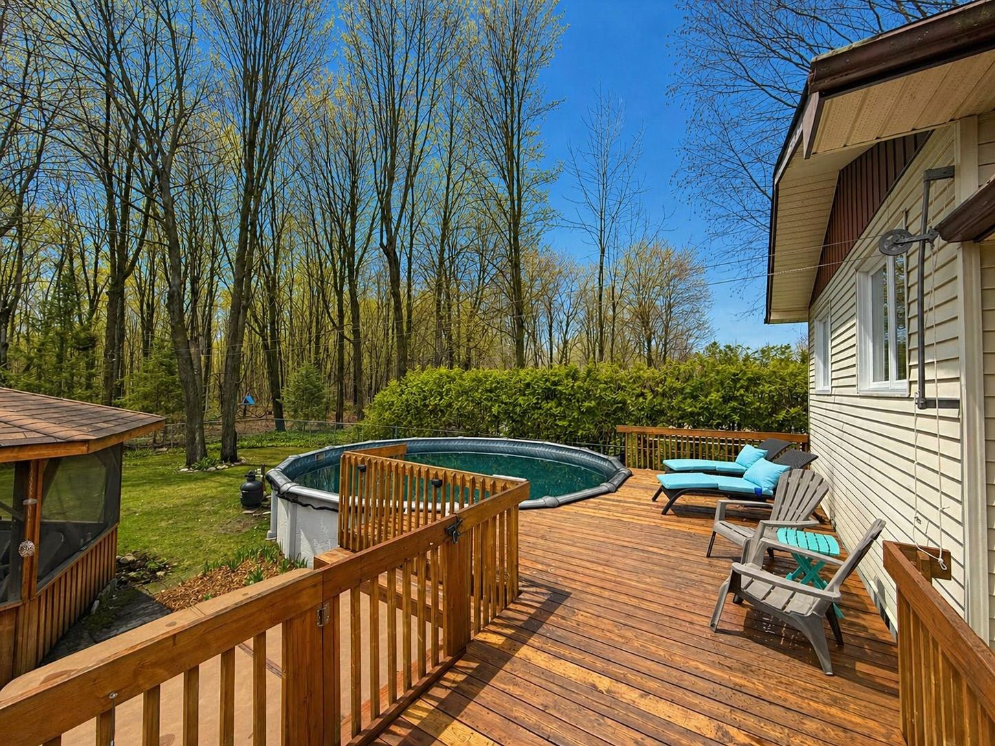 • Private backyard featuring a large deck, pool, gazebo, and porch.