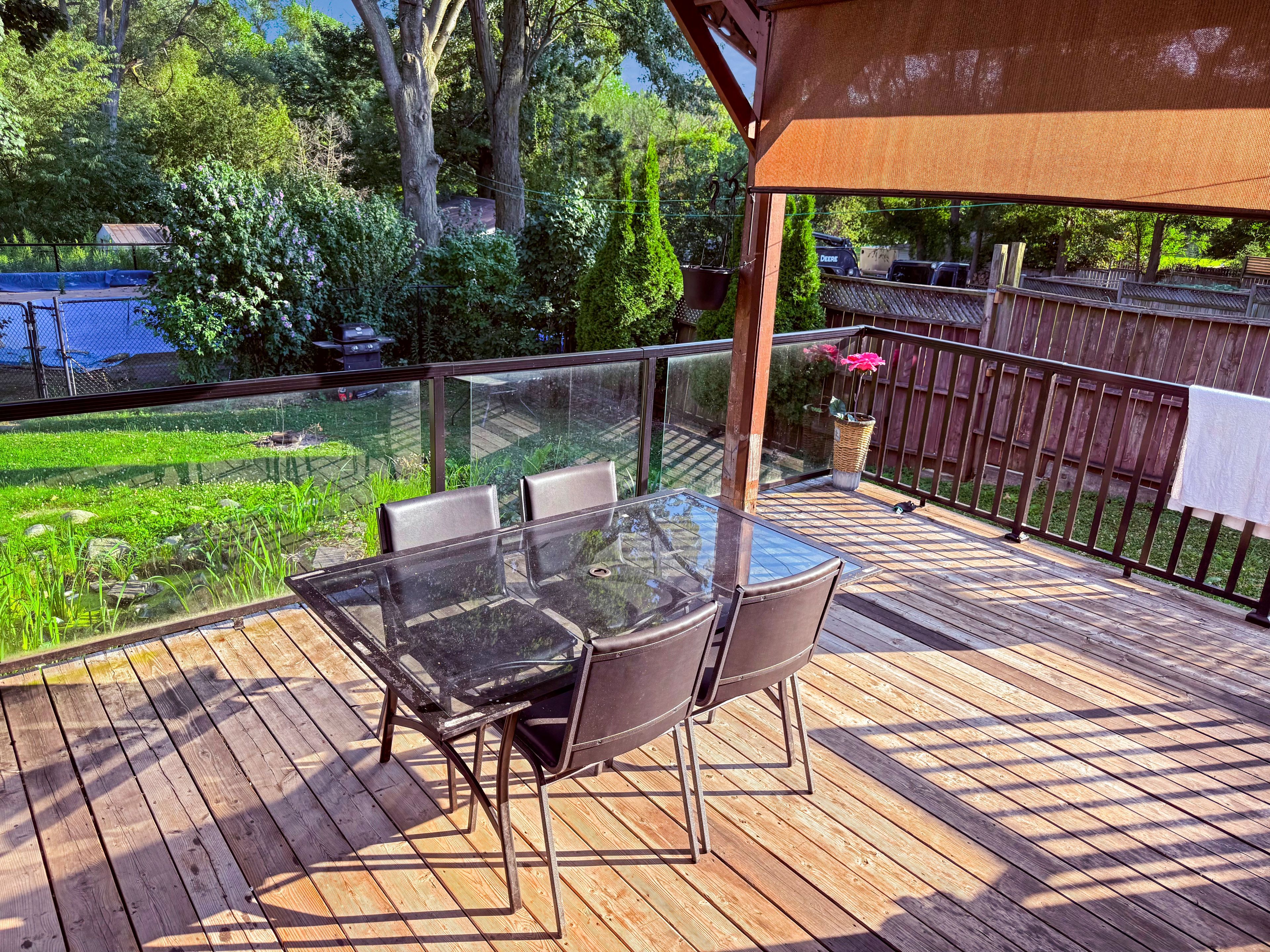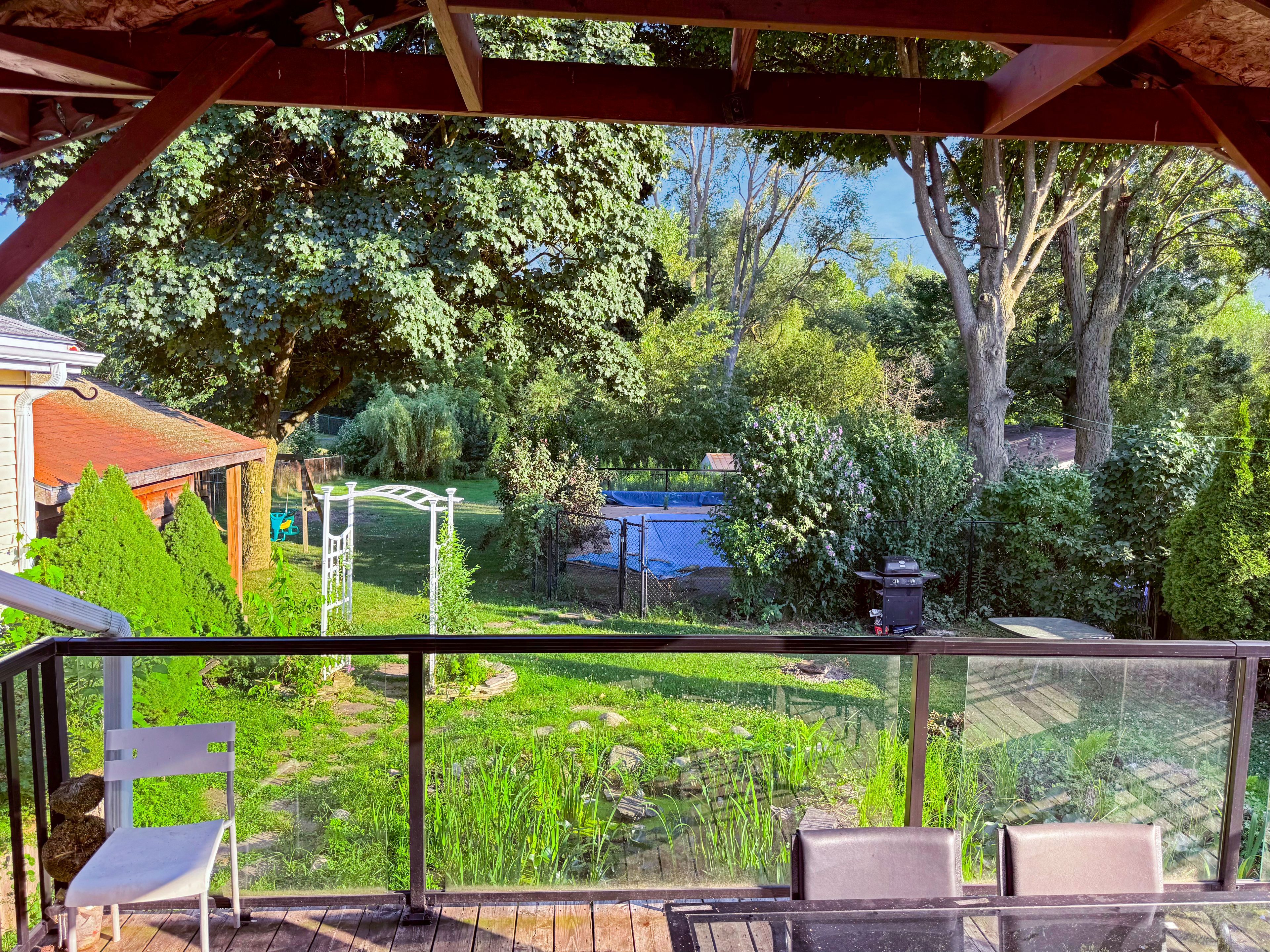 • Covered deck with views of a landscaped backyard and two fish ponds.