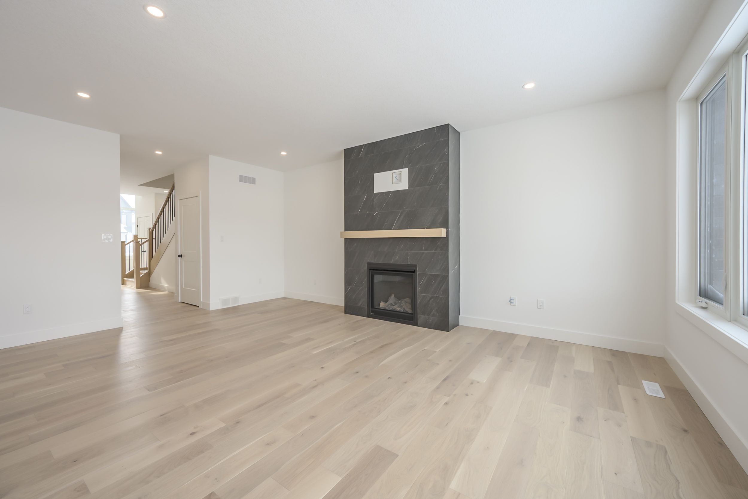 • Inviting great room features a floor-to-ceiling tiled fireplace.
