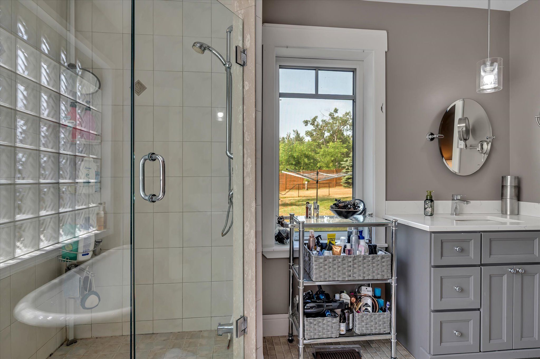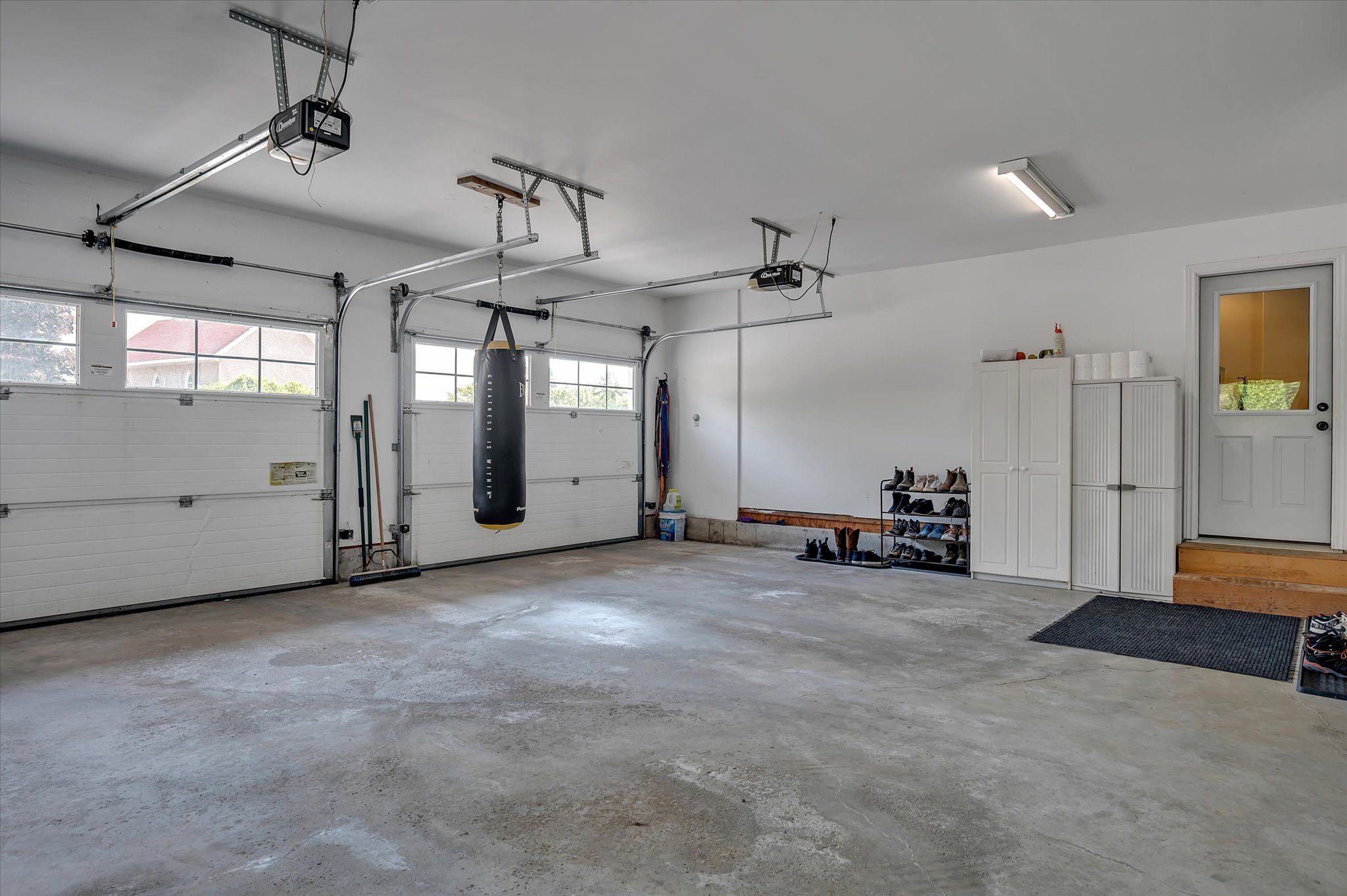 • Oversized double-car garage with workshop area for projects and storage.