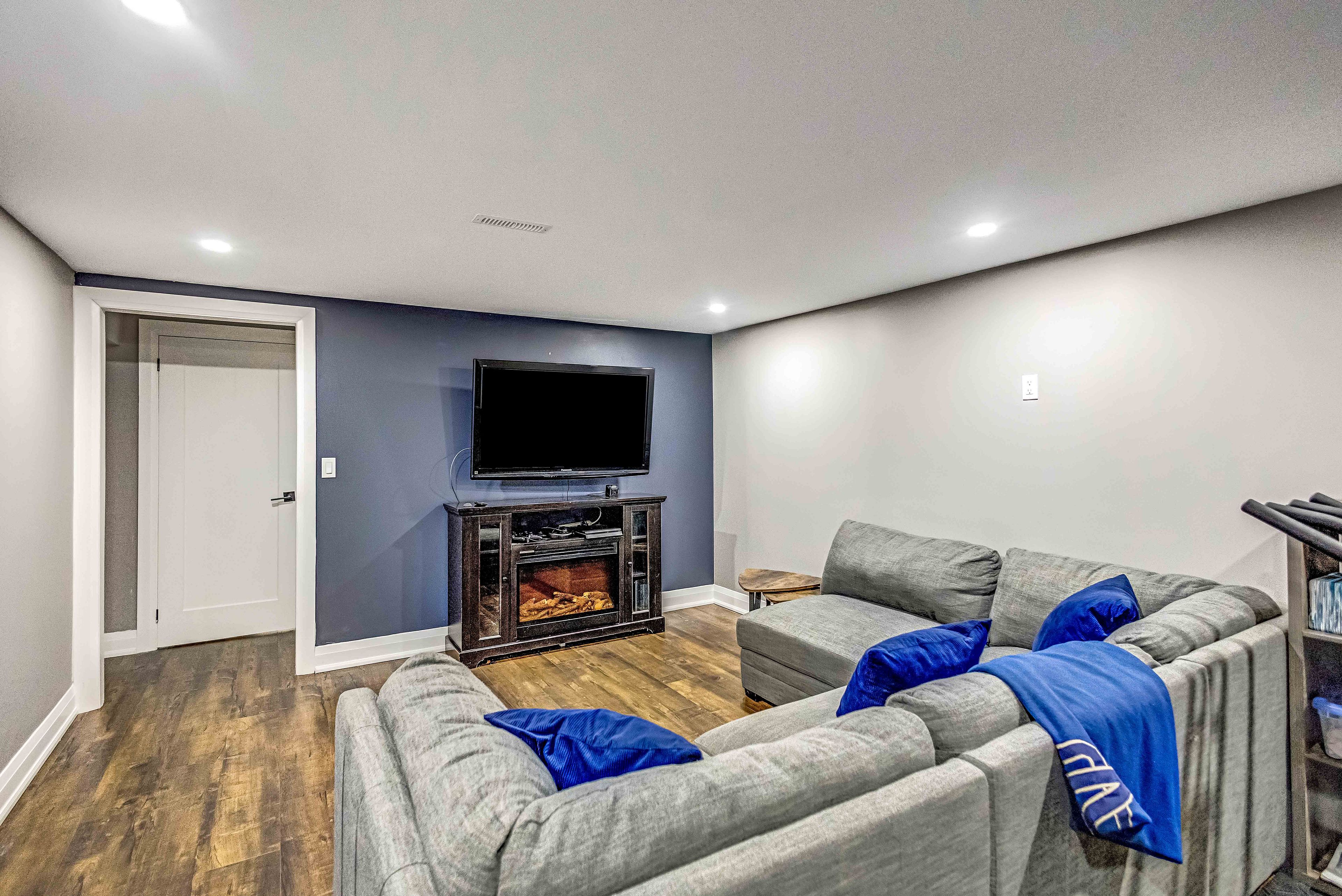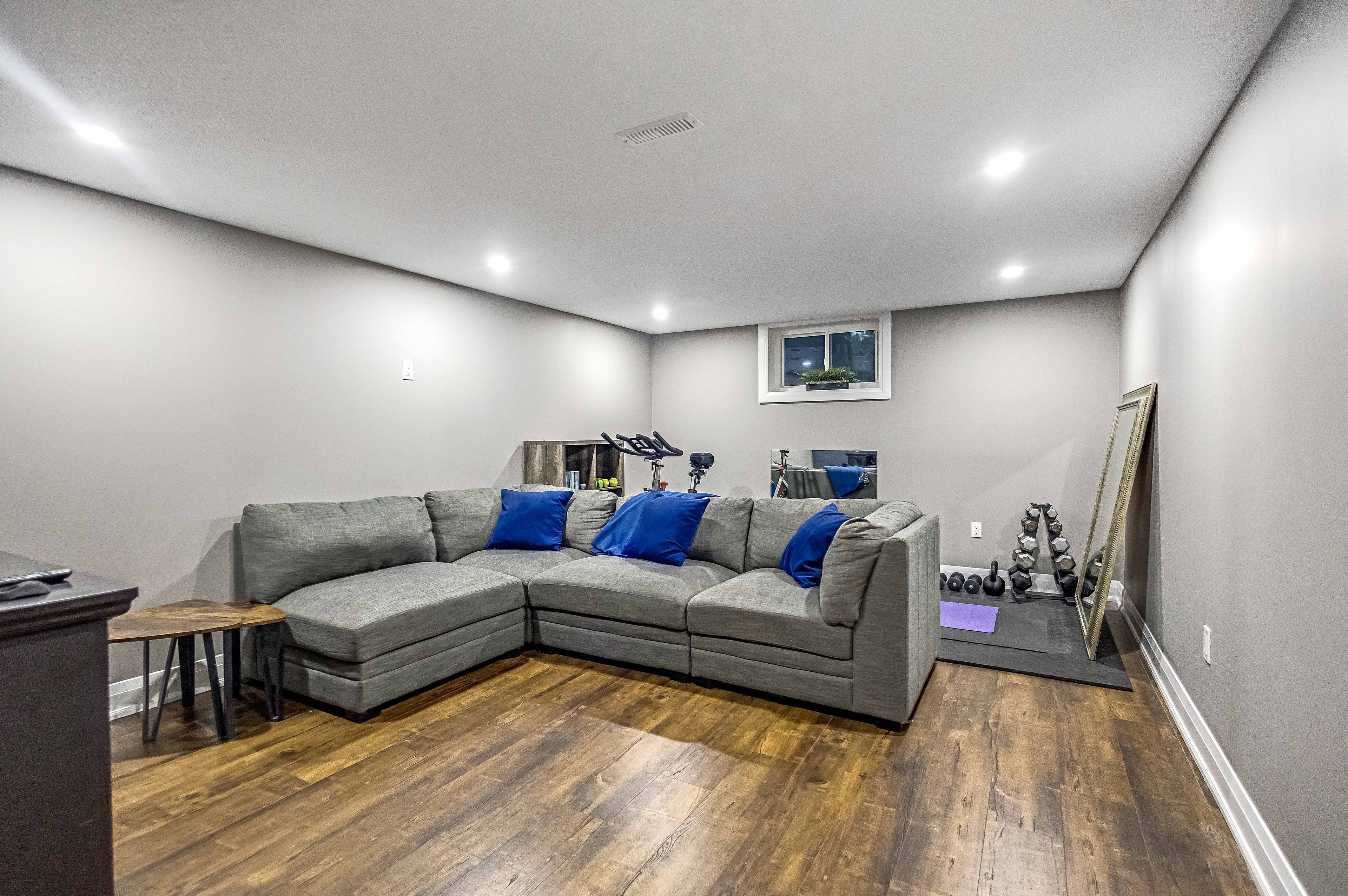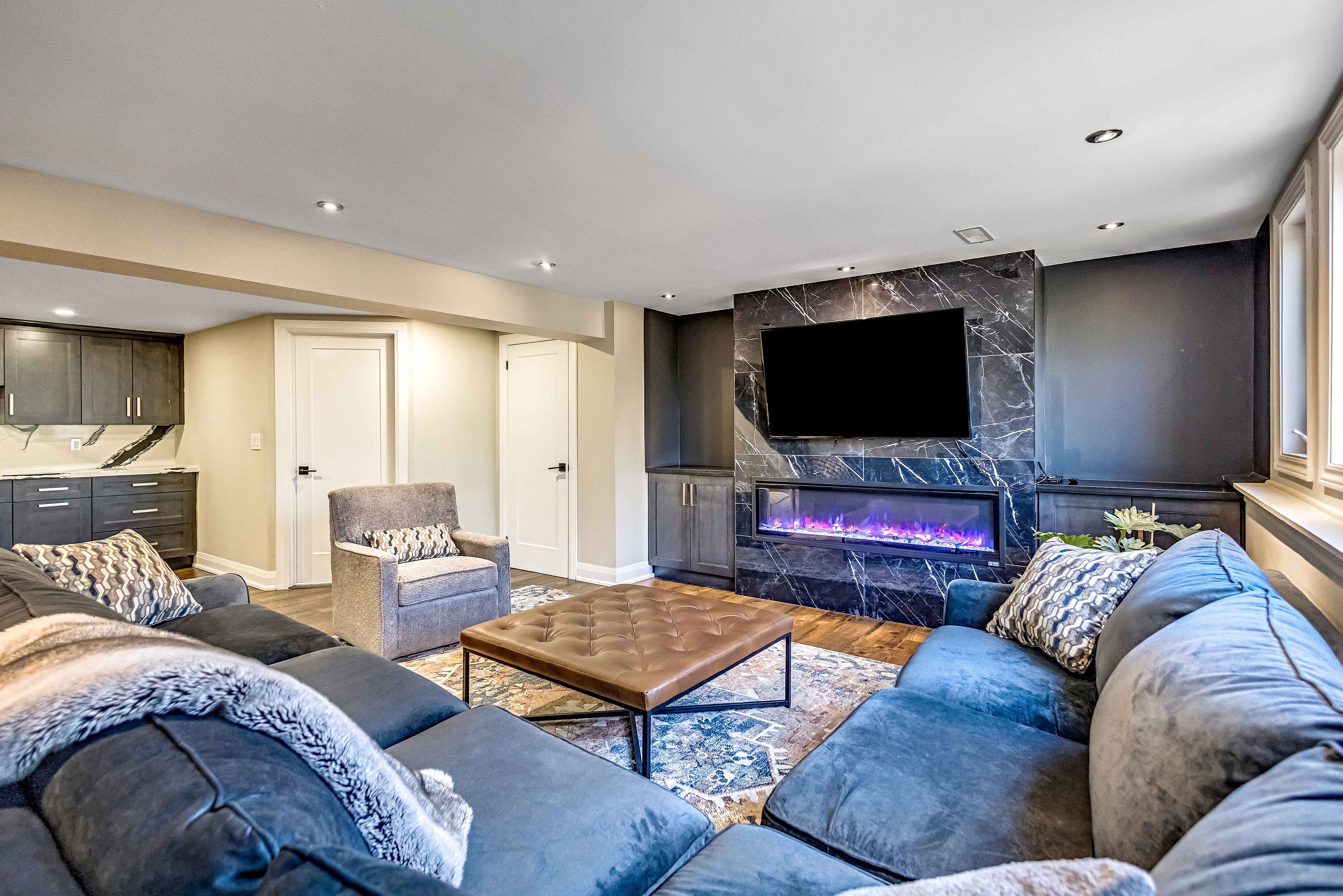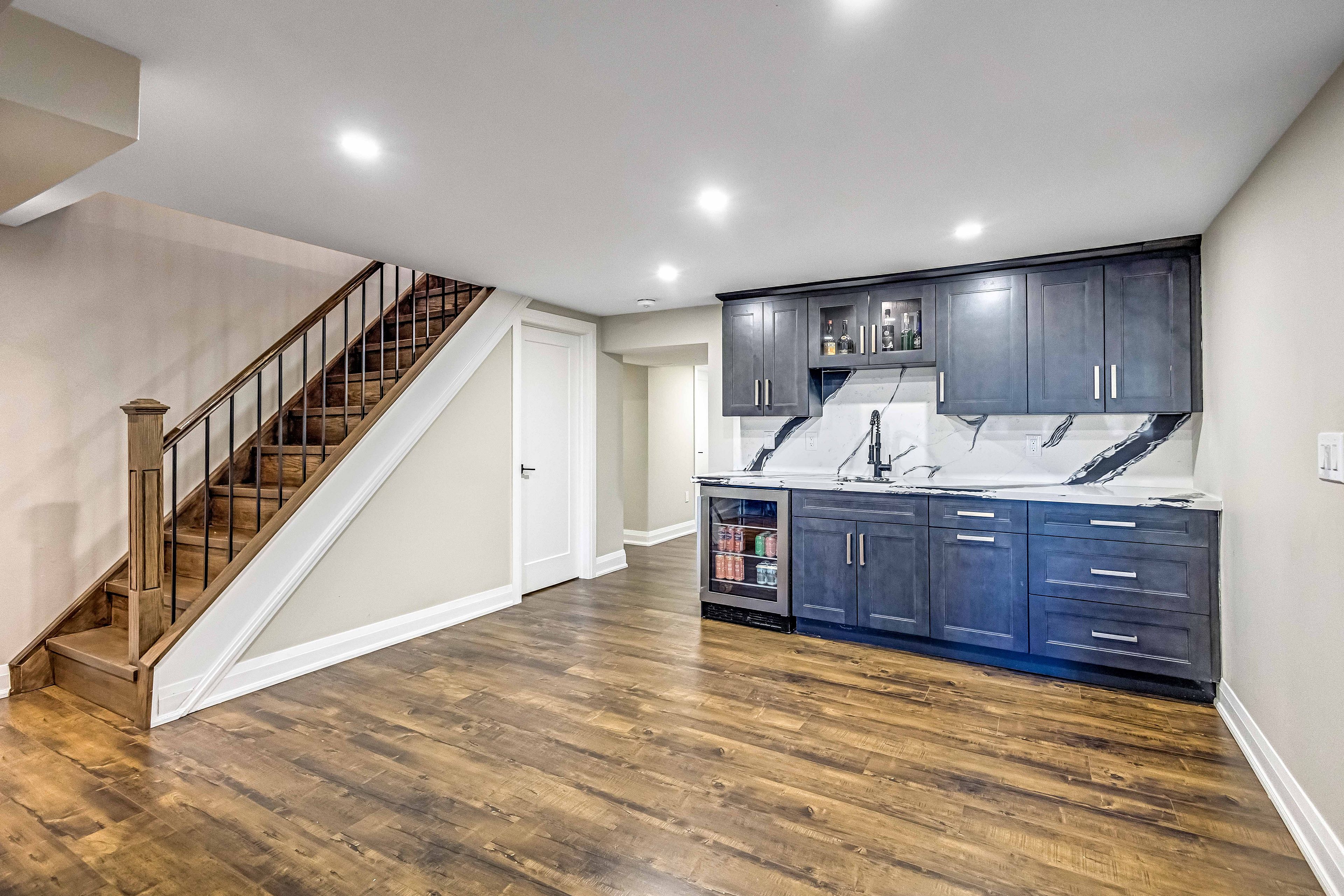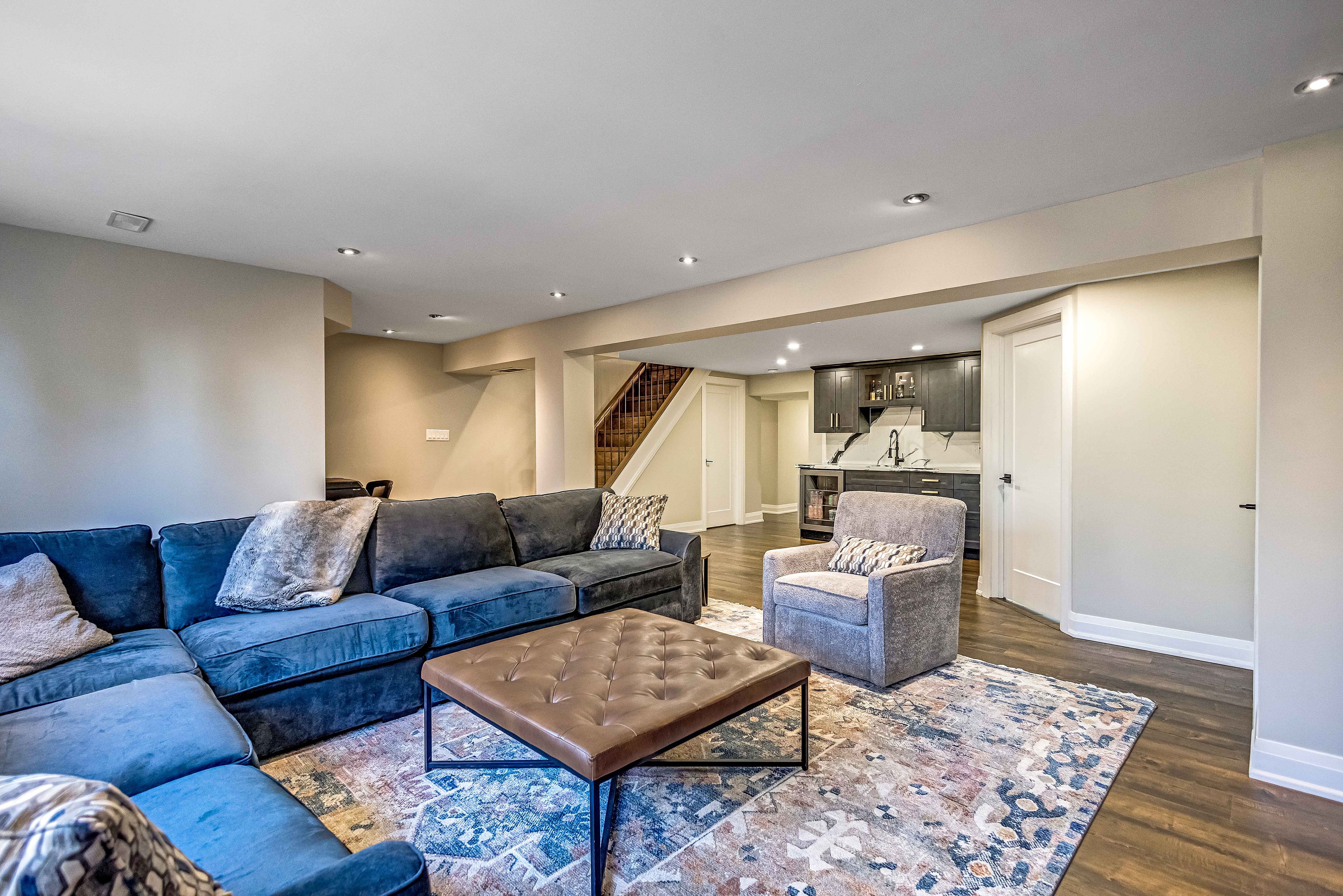 • Finished lower level with rec room, wet bar, and extra bathroom for guests.