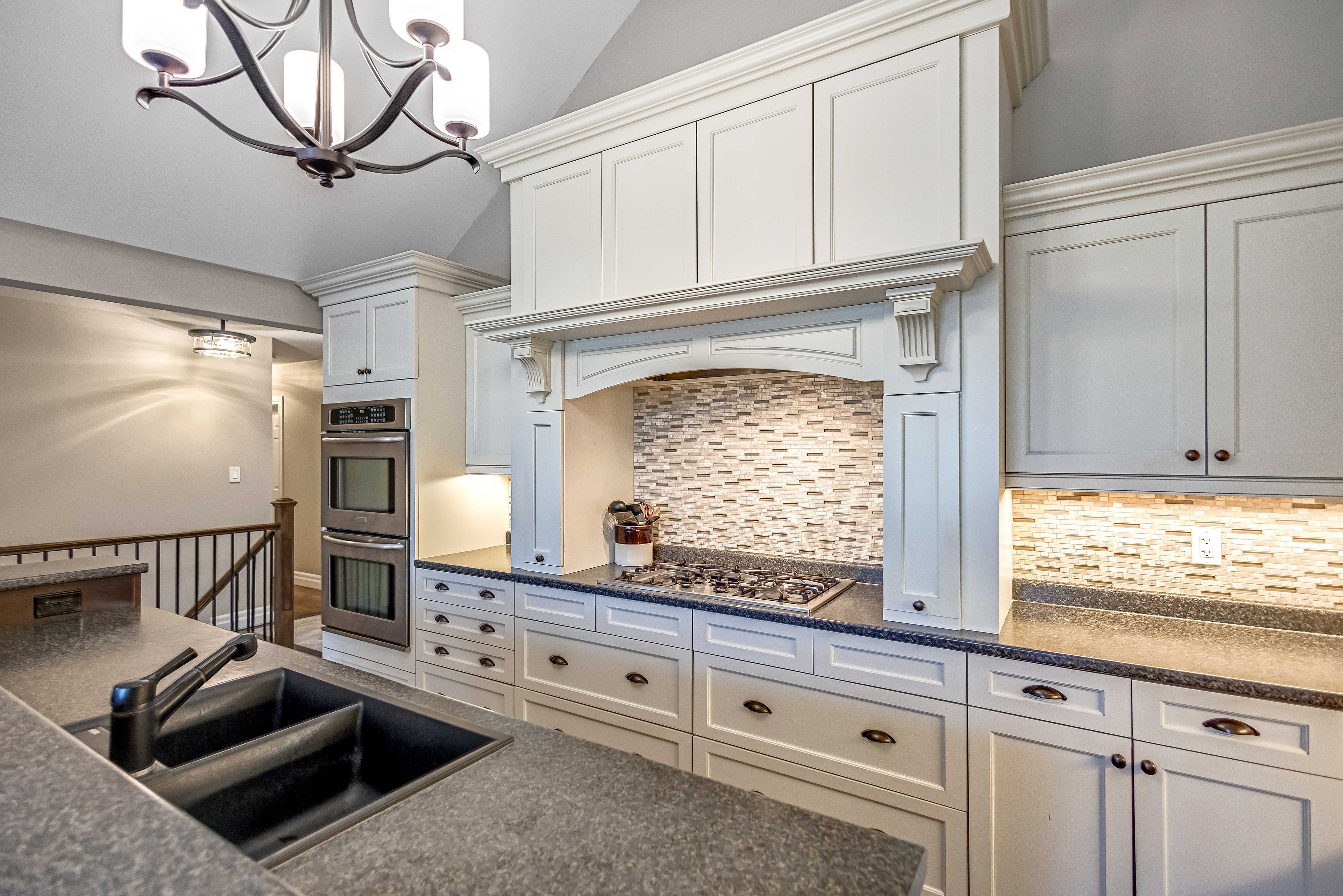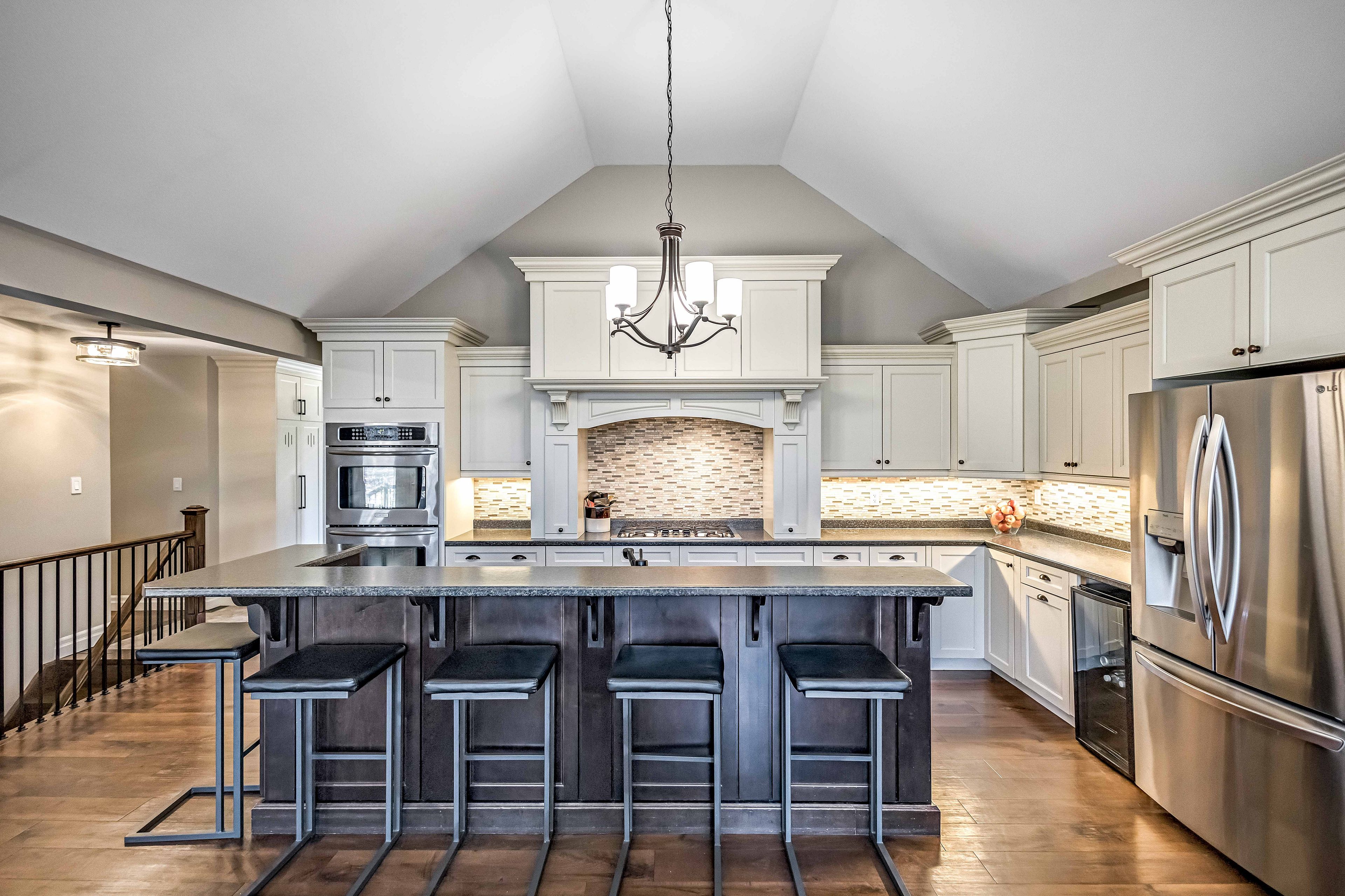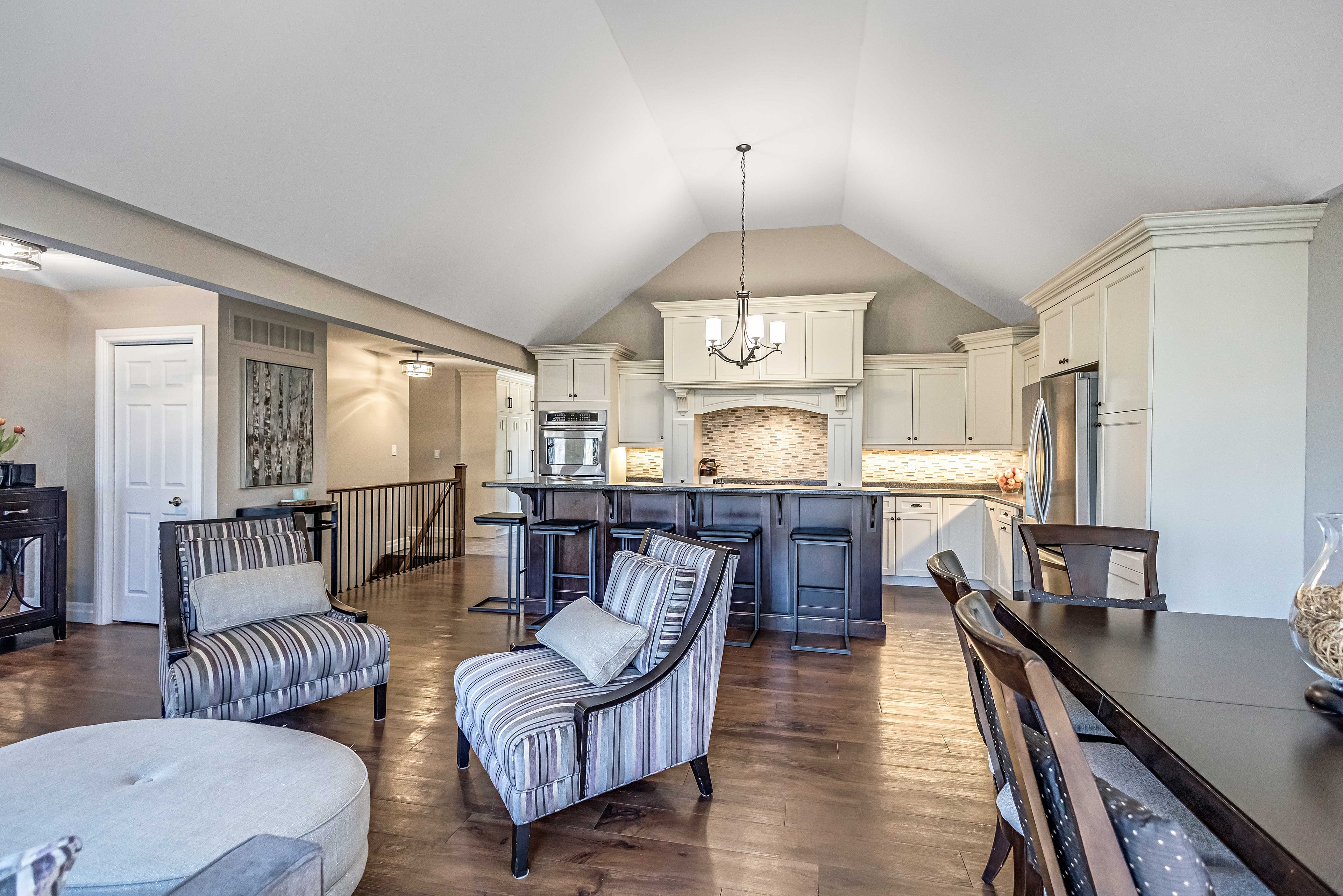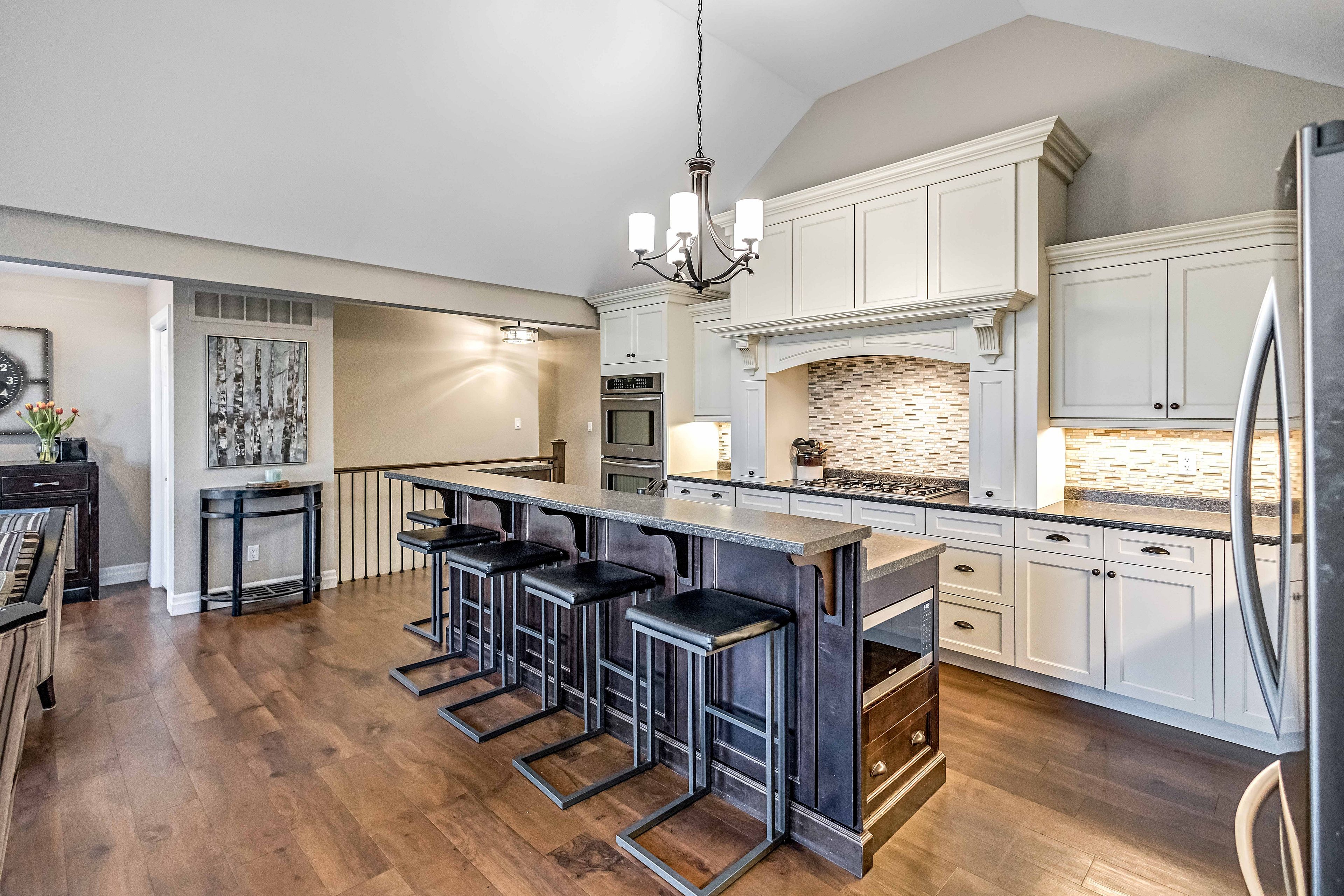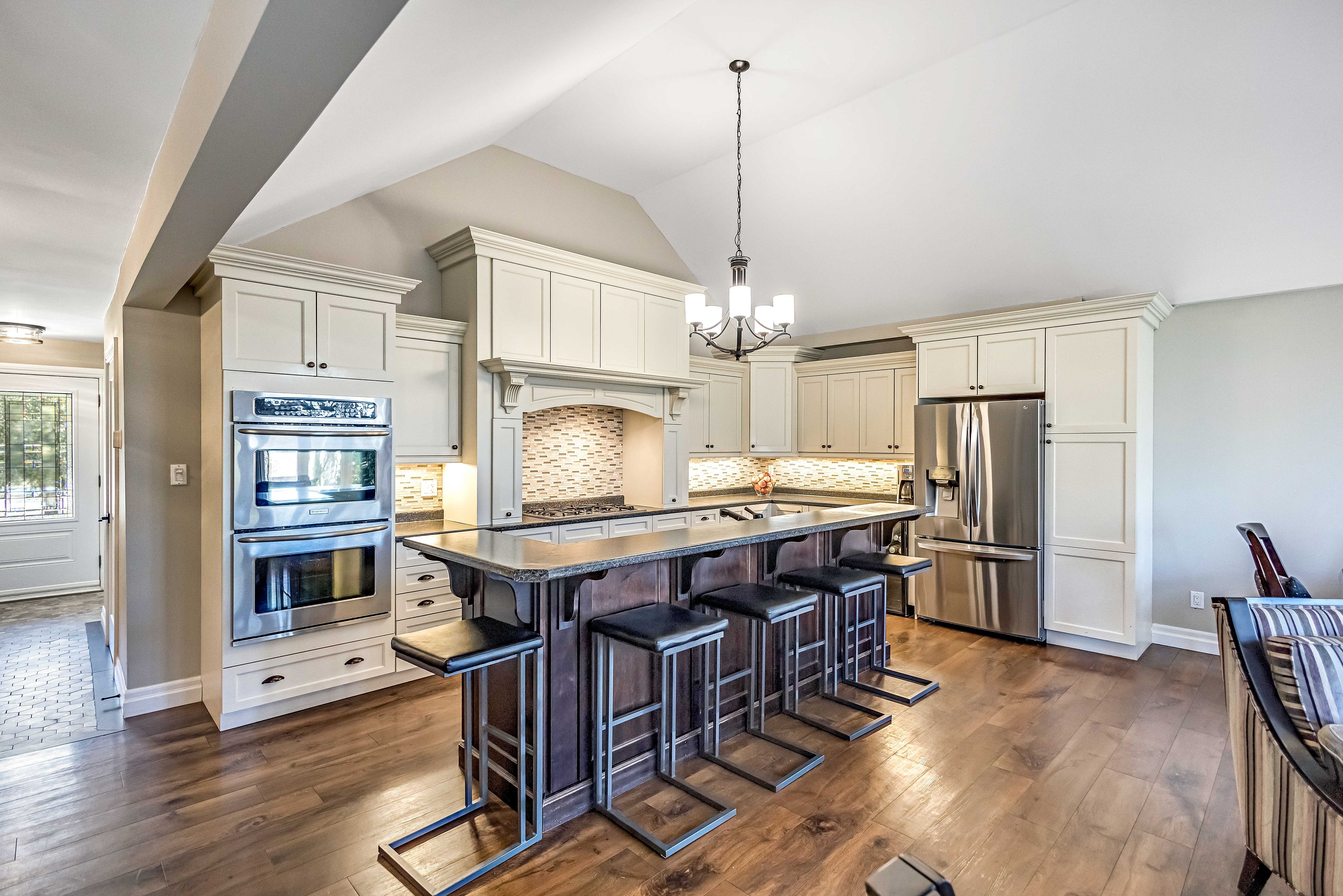 • Custom kitchen with modern appliances and breakfast bar for family gatherings.