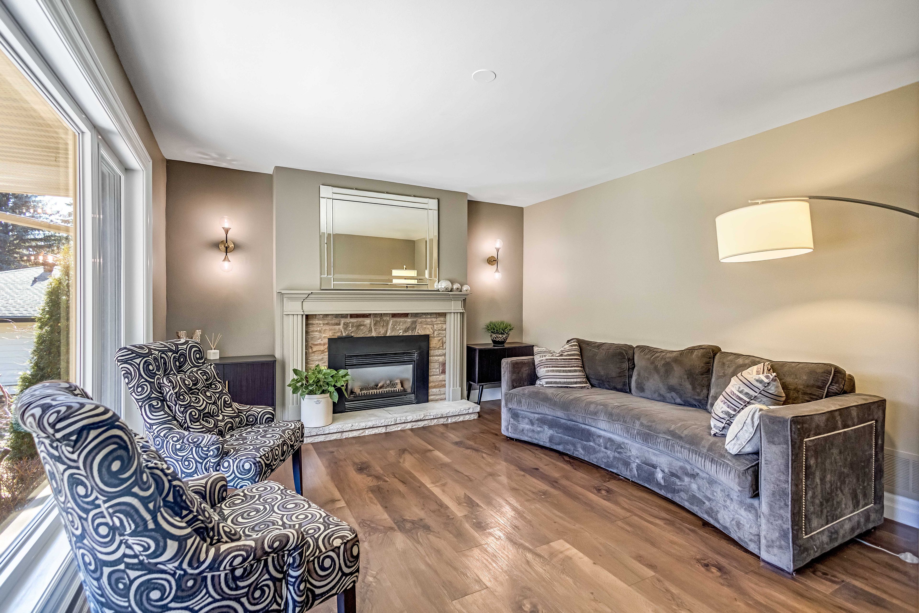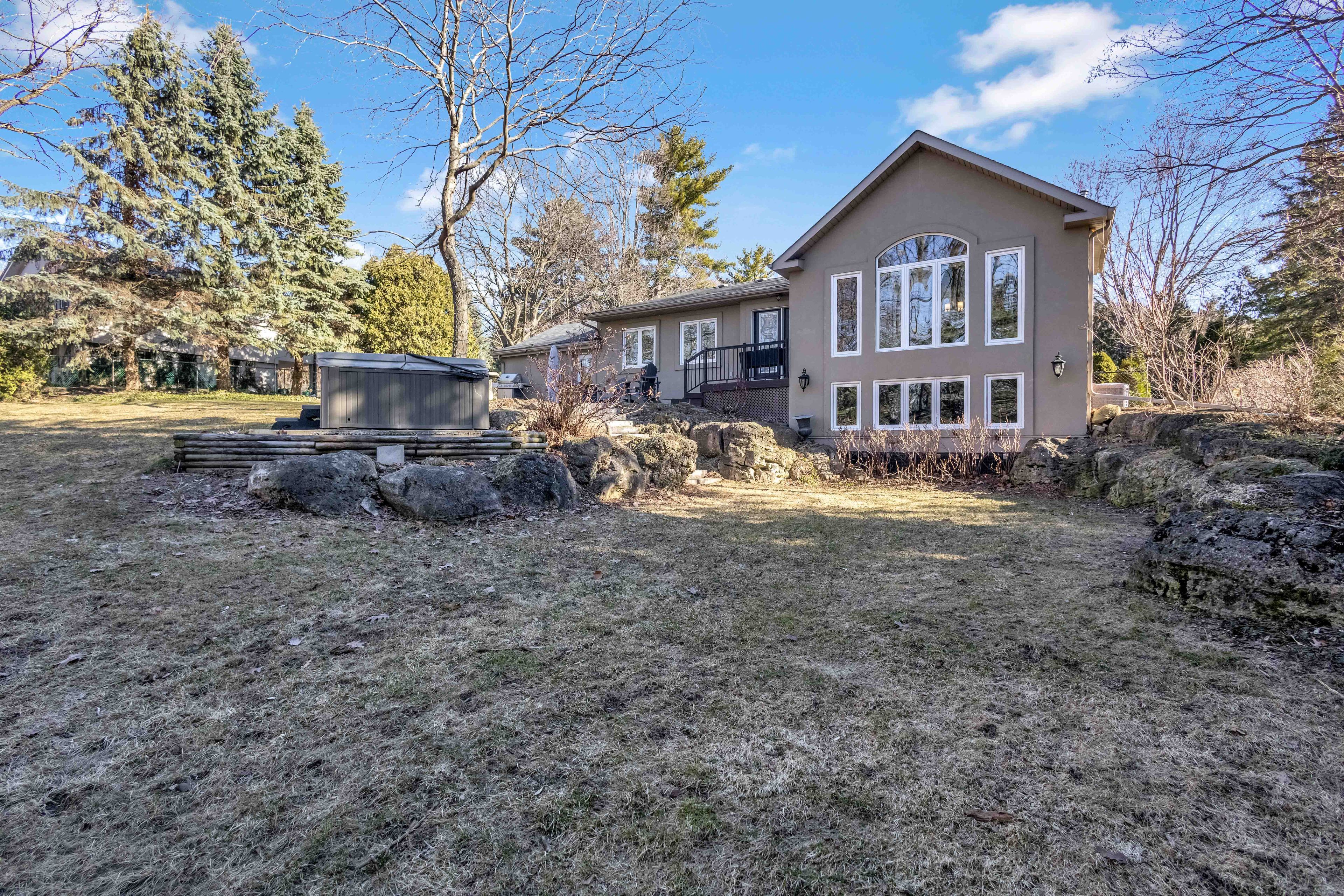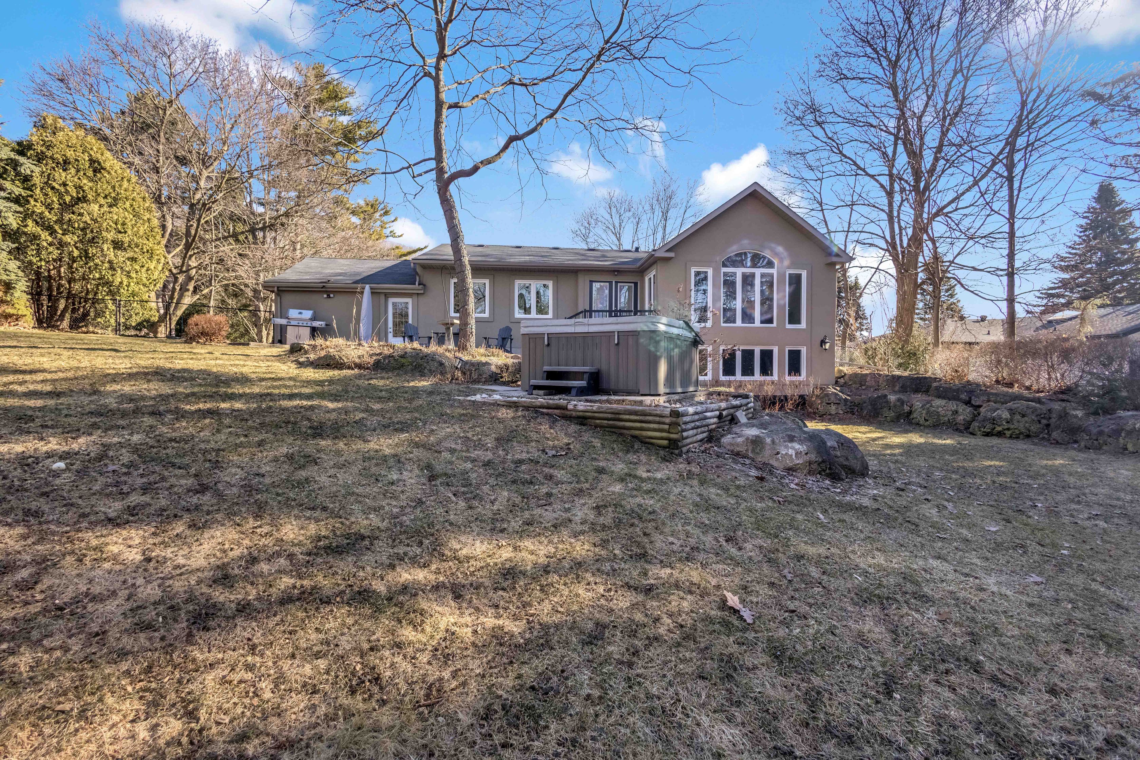 Enjoy this beautifully renovated burlington bungalow, offering the perfect blend of nature and urban convenience. Set on an incredible 190-ft deep lot with no rear neighbours, this home delivers a rare, private setting surrounded by mature trees-bringing a true cottage feel to the city. With nearly 3,000 sq ft of finished living space, the home has been thoughtfully updated from top to bottom. The main level is filled with natural light from oversized windows that showcase the stunning backyard views. The custom-designed kitchen is ideal for family living, a tile backsplash, custom cabinetry, breakfast bar, beverage fridge, and stainless steel appliances. The main floor also offers a recently renovated foyer with ample storage and modern tiled flooring, a spacious family room with gas fireplace, beautifully updated 4-piece ensuite in the primary bedroom, two additional bedrooms, and a convenient powder room. The fully finished lower level is designed for entertaining, featuring a large rec room with modern electric fireplace, wet bar, and a full bathroom-perfect for guests, teens, or multi-generational living. Step outside to your private backyard retreat with a stone patio, hot tub, and breathtaking forest views. With no rear neighbours and a peaceful natural backdrop, this outdoor space is truly one-of-a-kind. Ideally located just steps to the bruce trail, and minutes from smokey hollow waterfall, this home is perfect for nature lovers. Close to the aldershot go station, major highways, and all amenities. Parking for up to 6 vehicles completes this exceptional offering. A rare opportunity to enjoy privacy, space, and nature-without leaving the city.