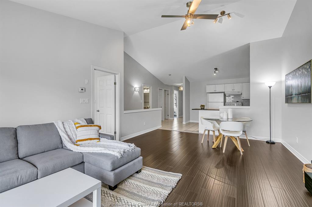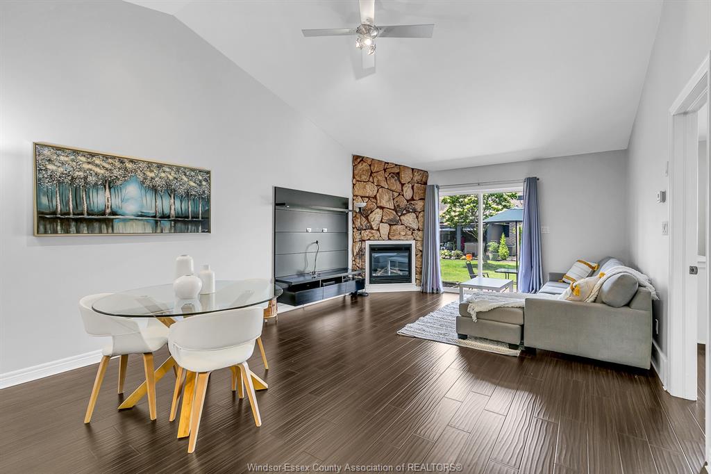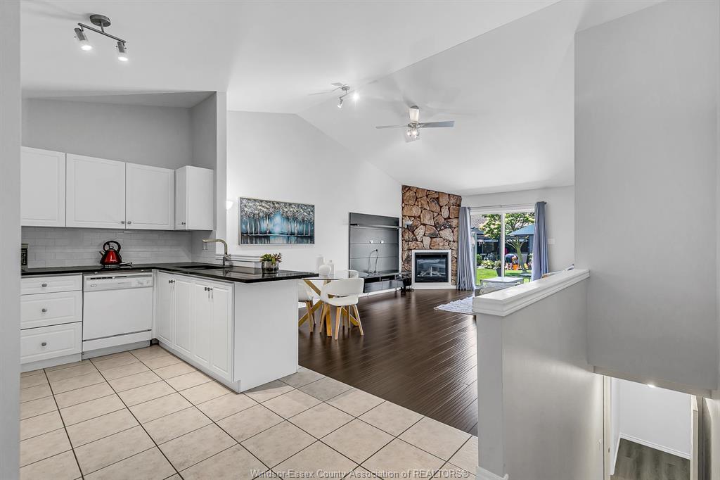 • Open concept living and dining with high vaulted ceilings and a gas fireplace.