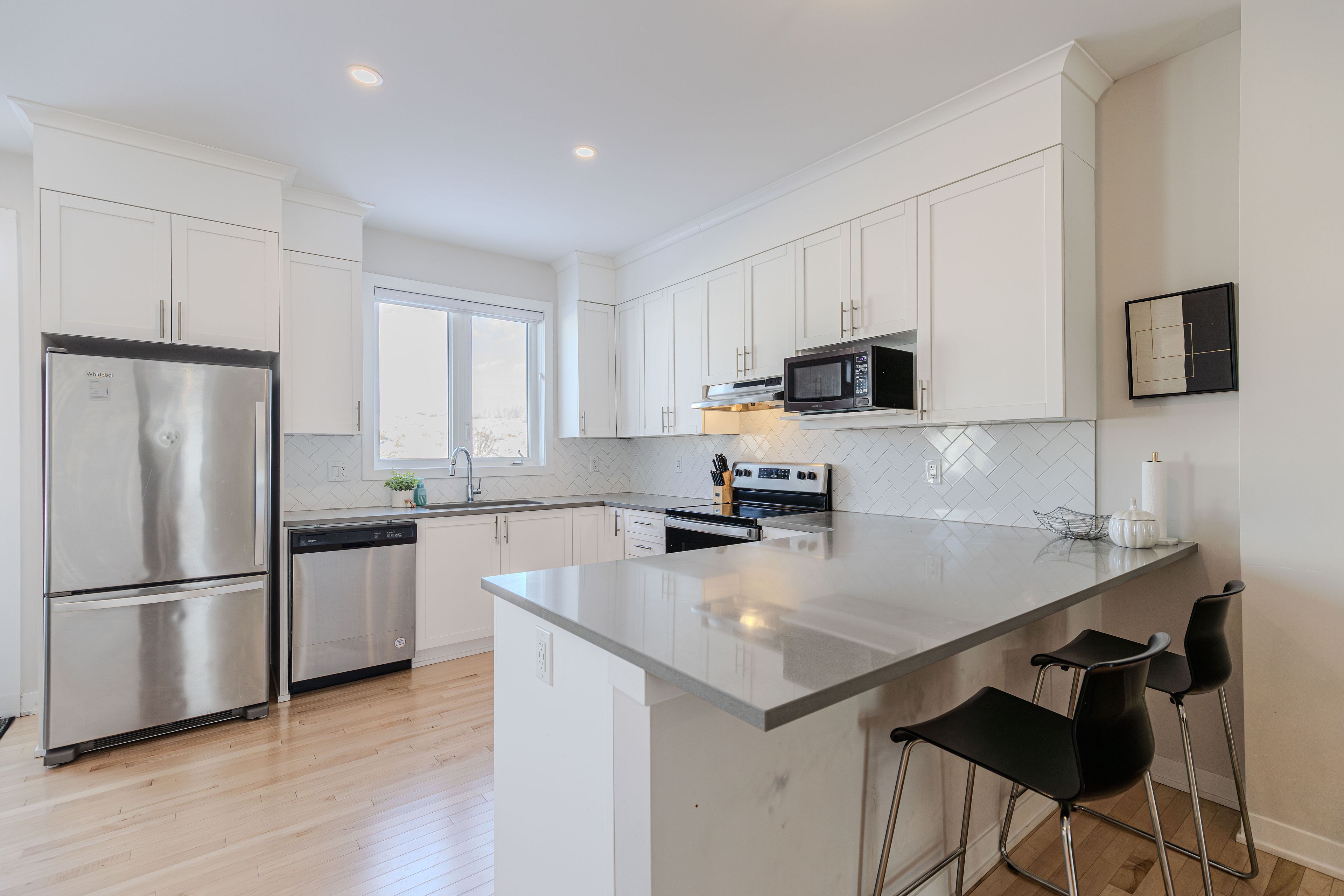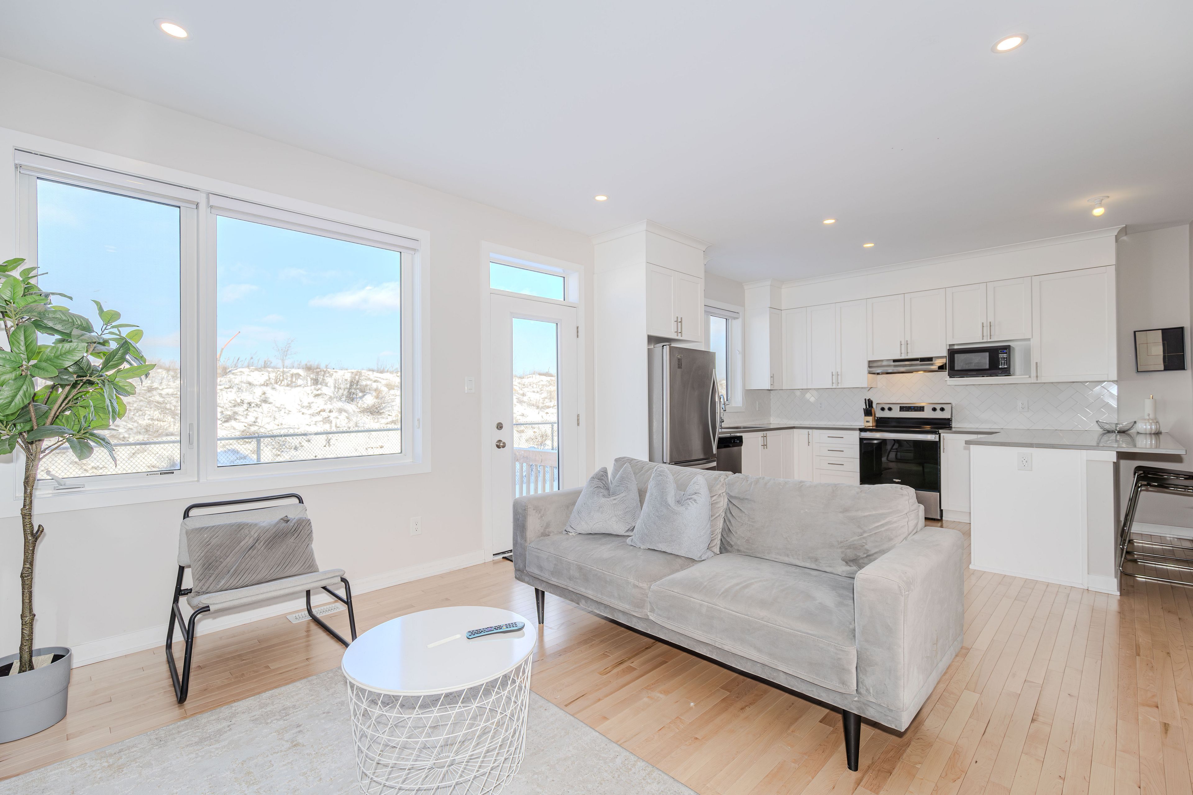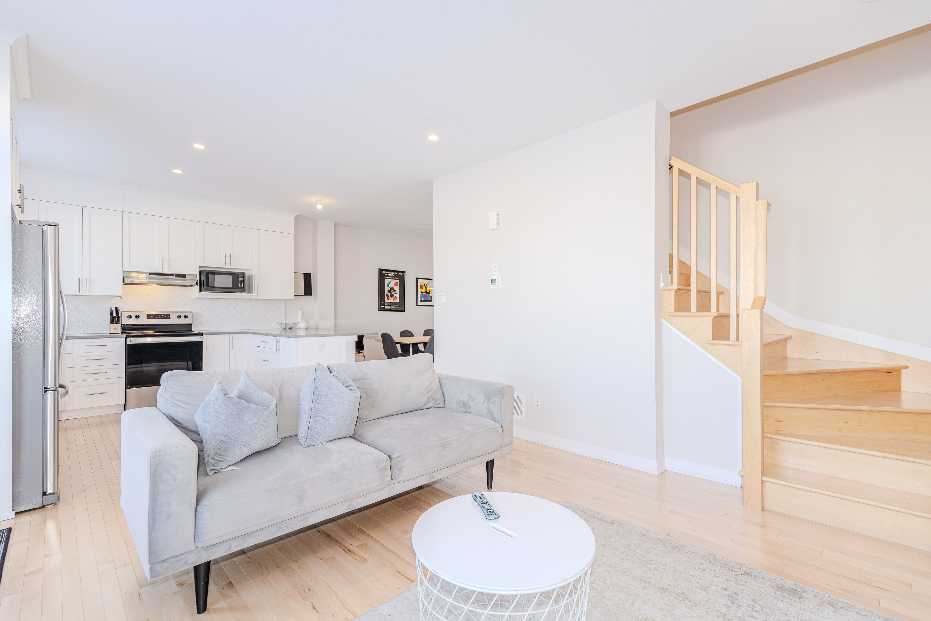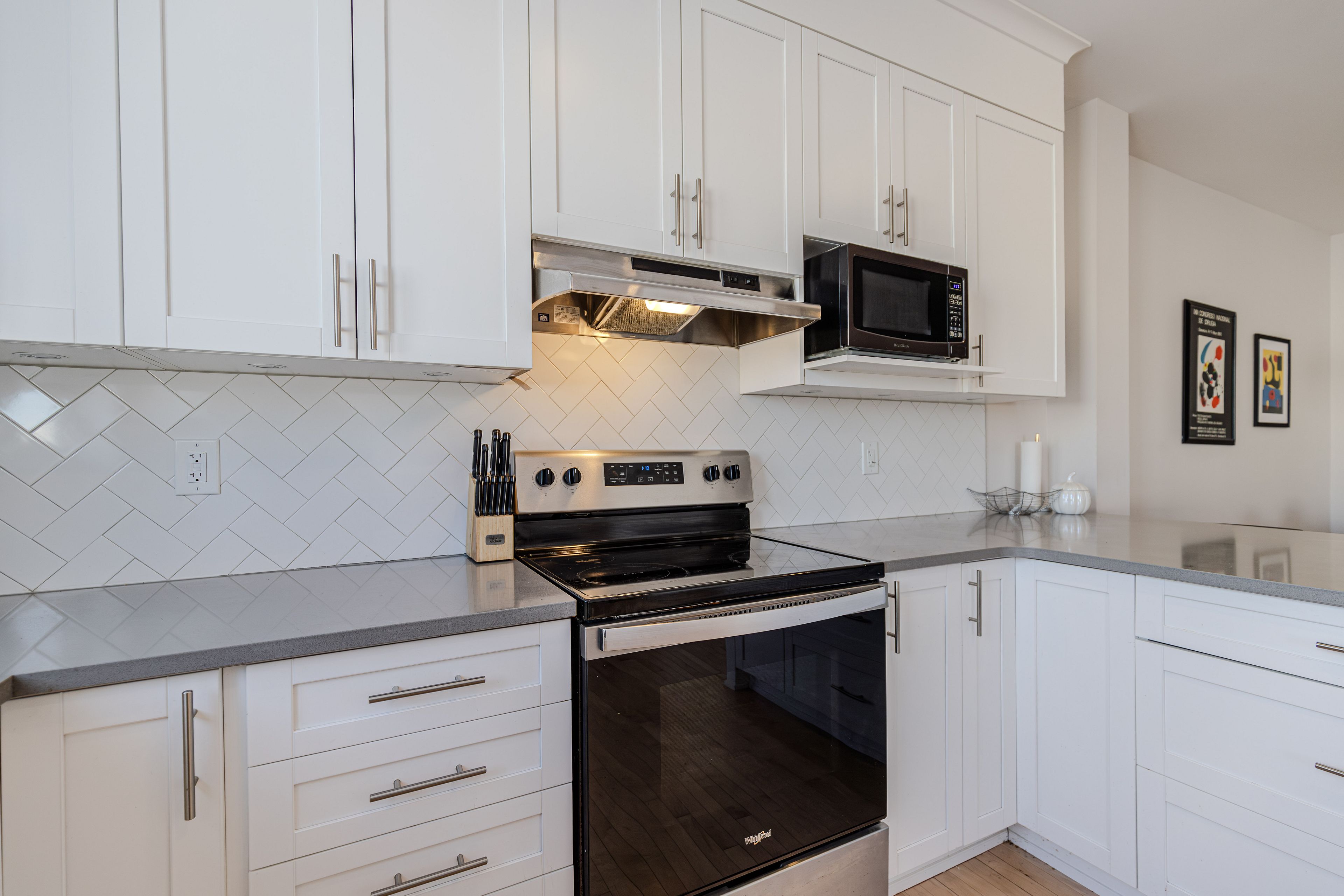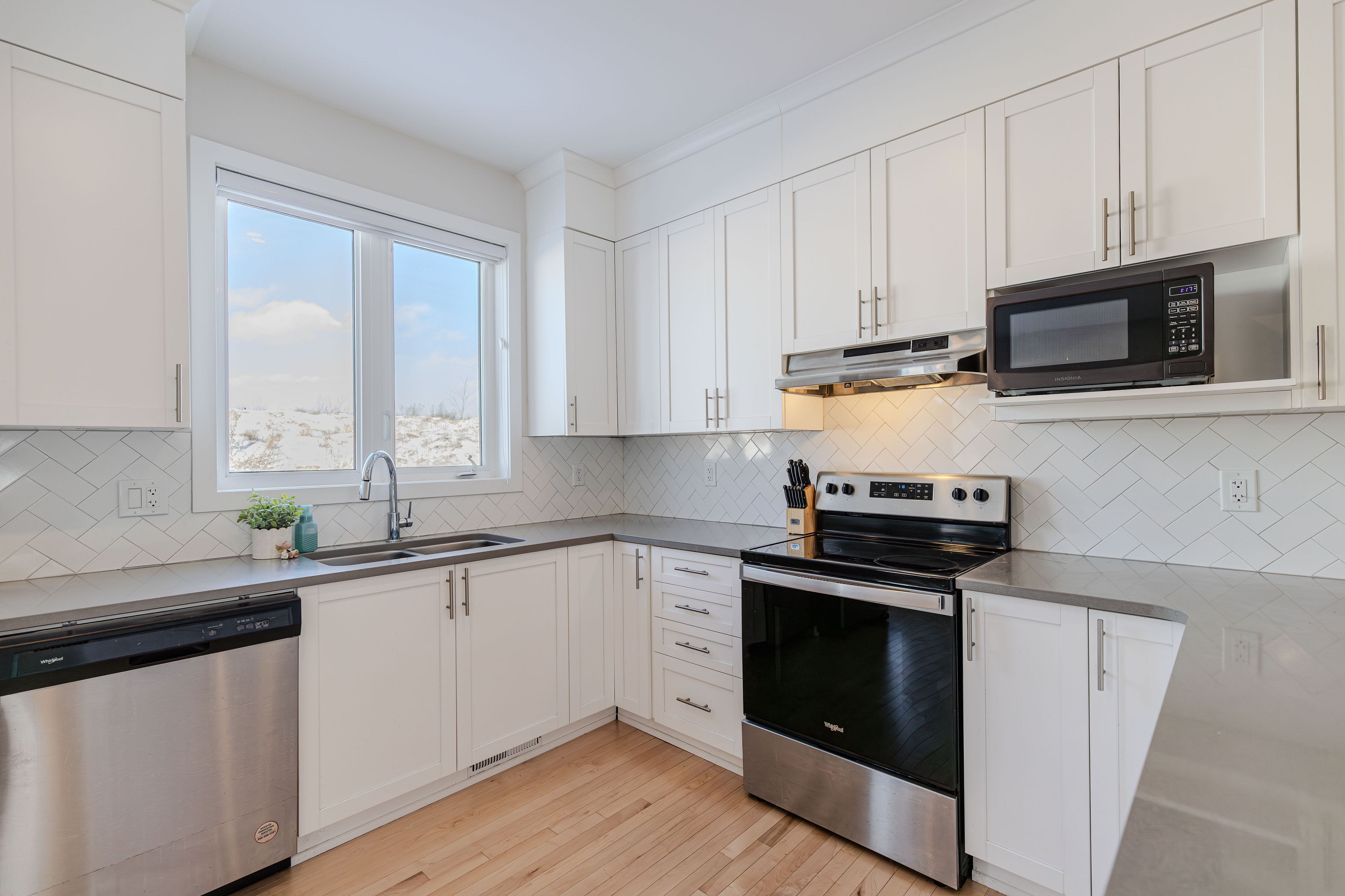 • Stylish open-concept kitchen with quartz countertops and ample storage.
