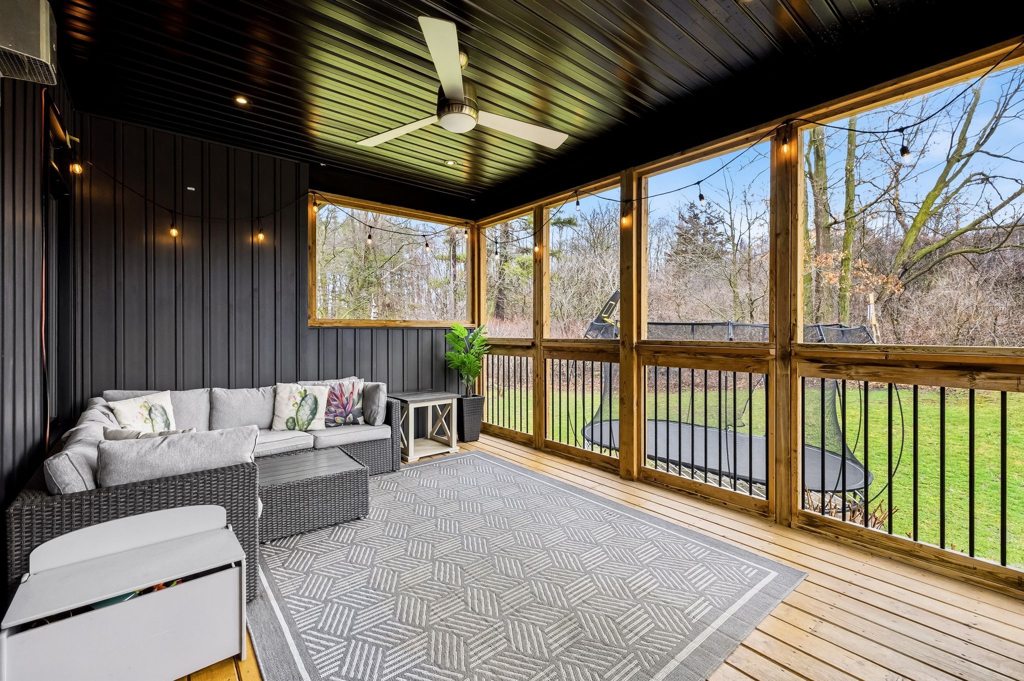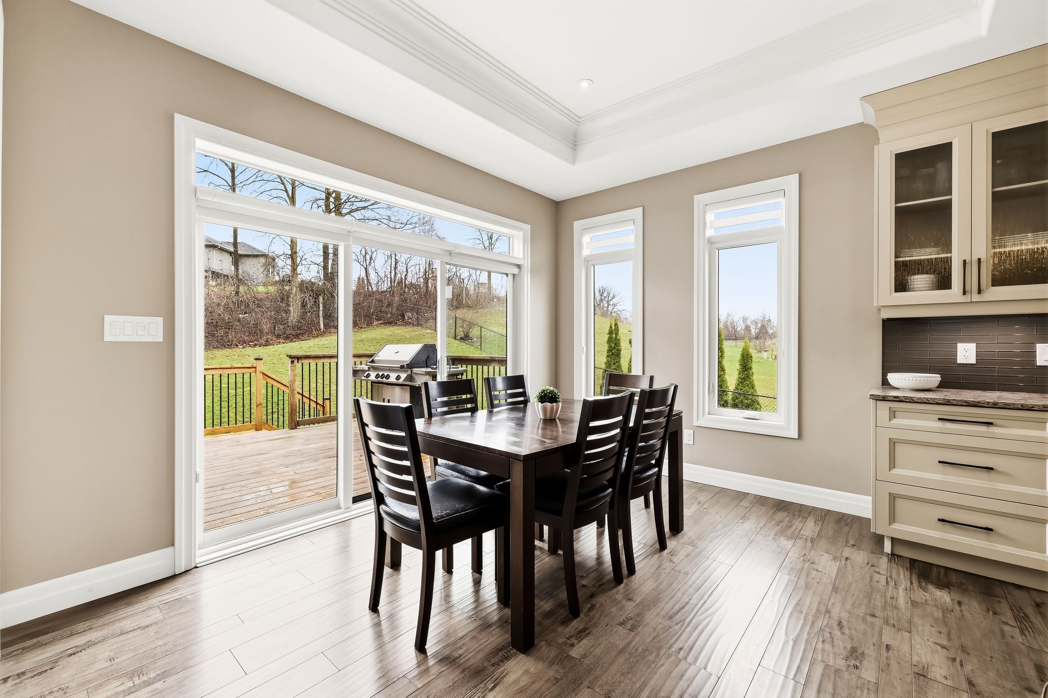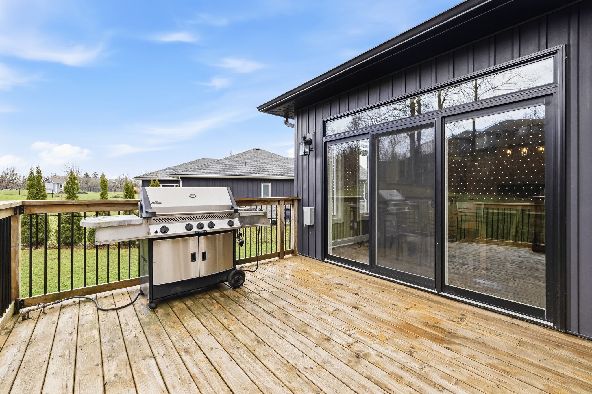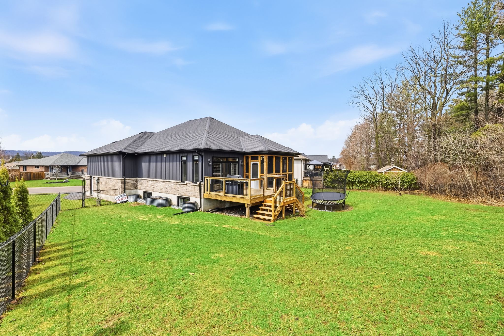 • Oversized covered deck overlooking a fenced yard with no rear neighbors.