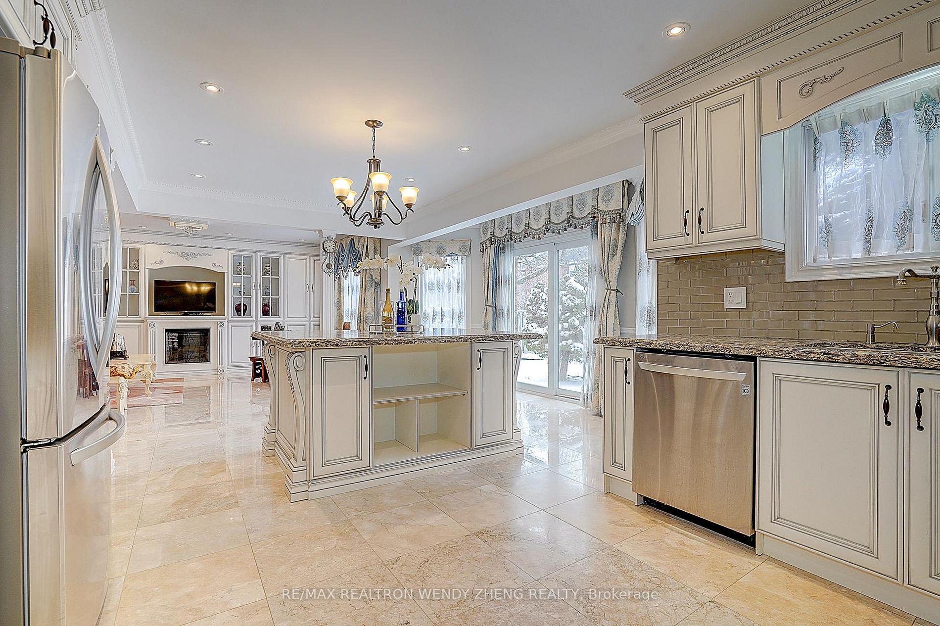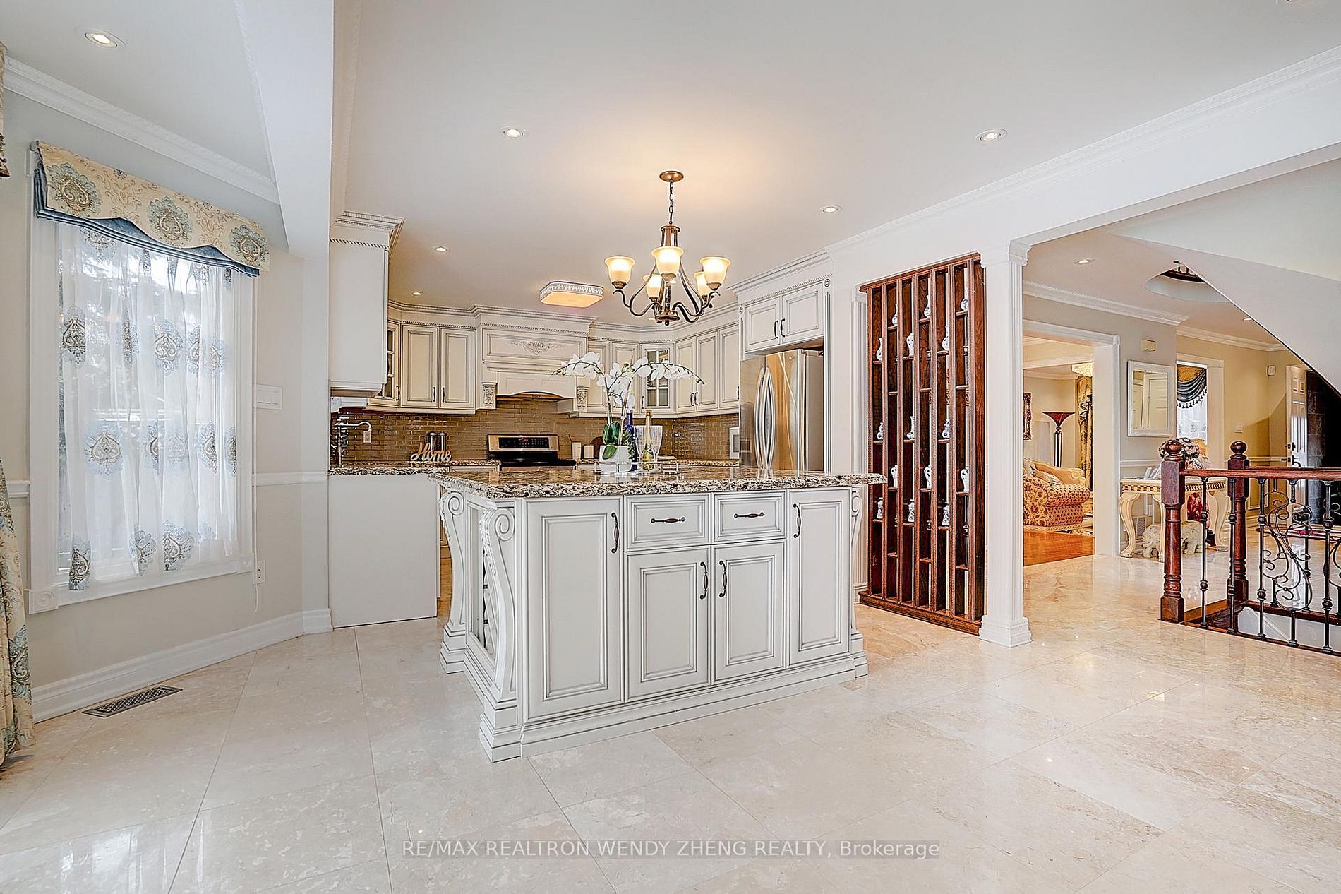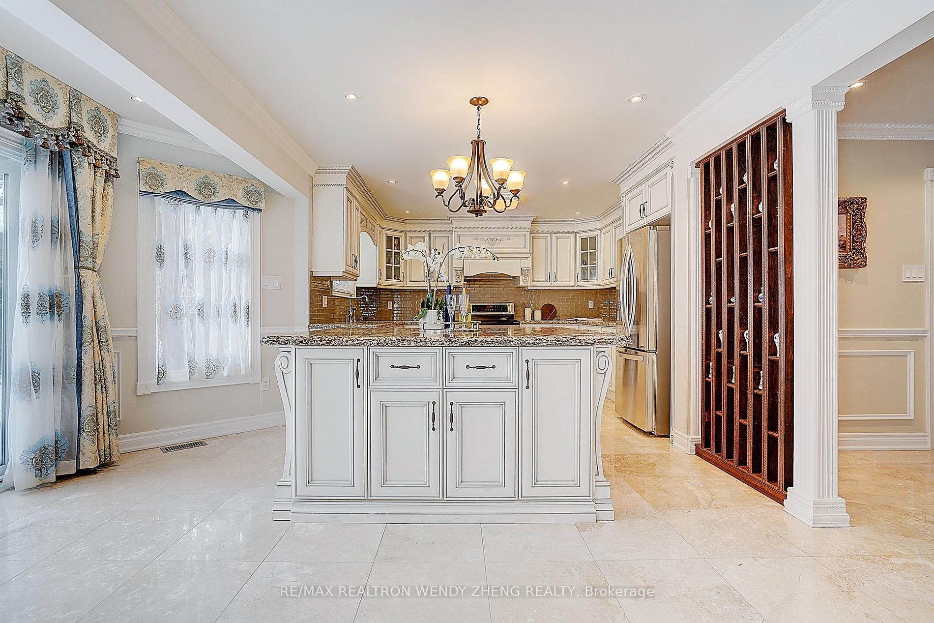 • Gourmet kitchen with large granite island and built-in wine storage.