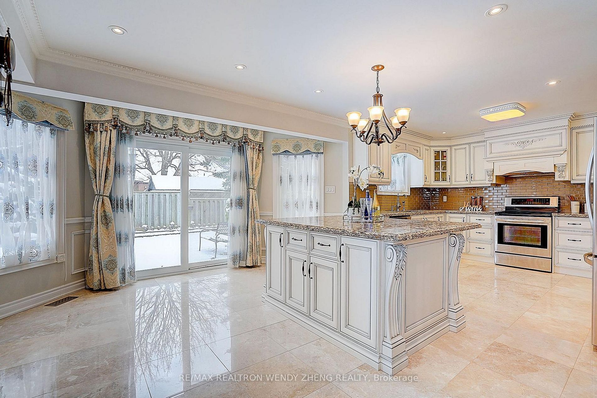 • Custom-designed fireplace and spacious kitchen with large granite island.