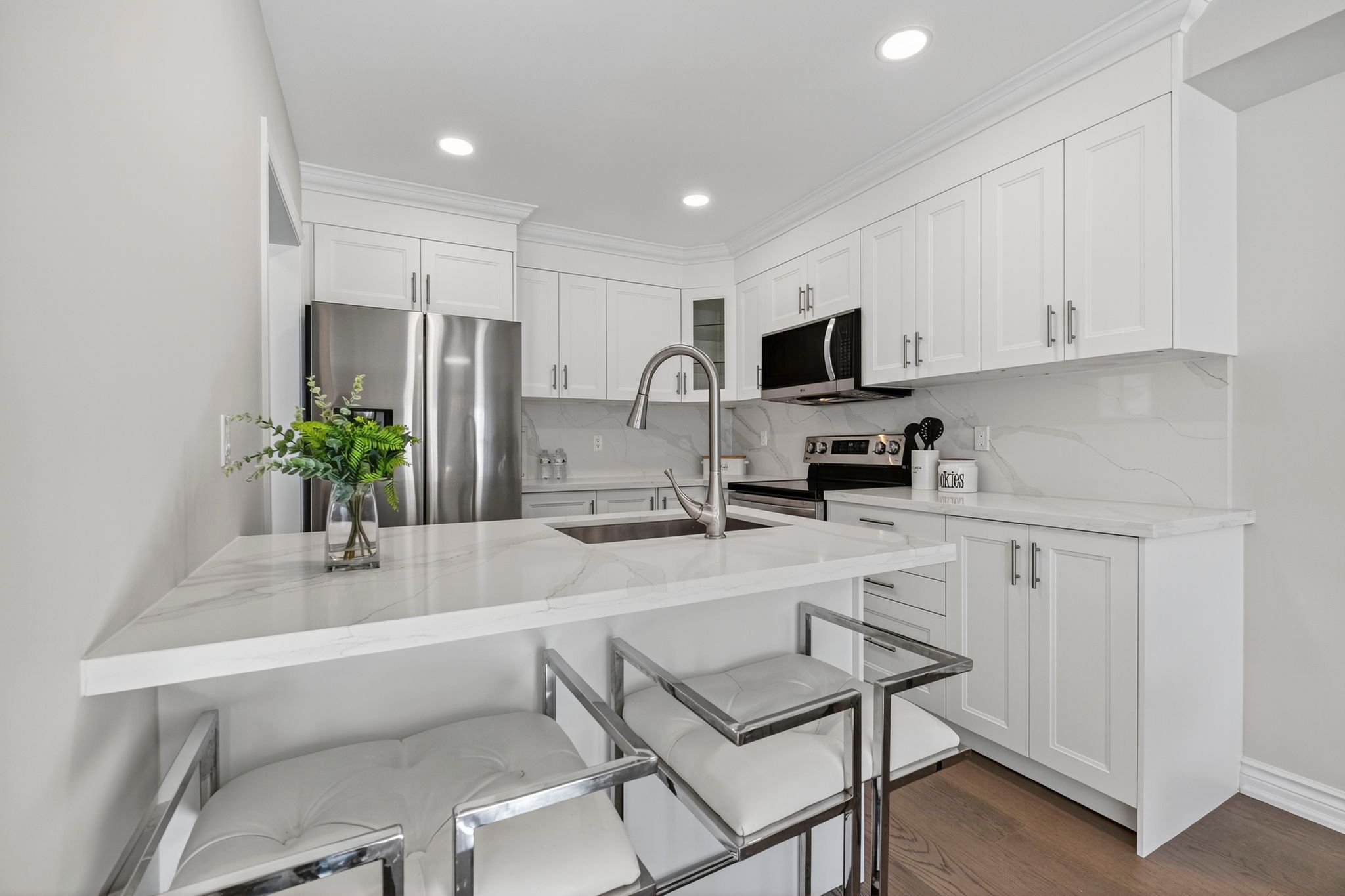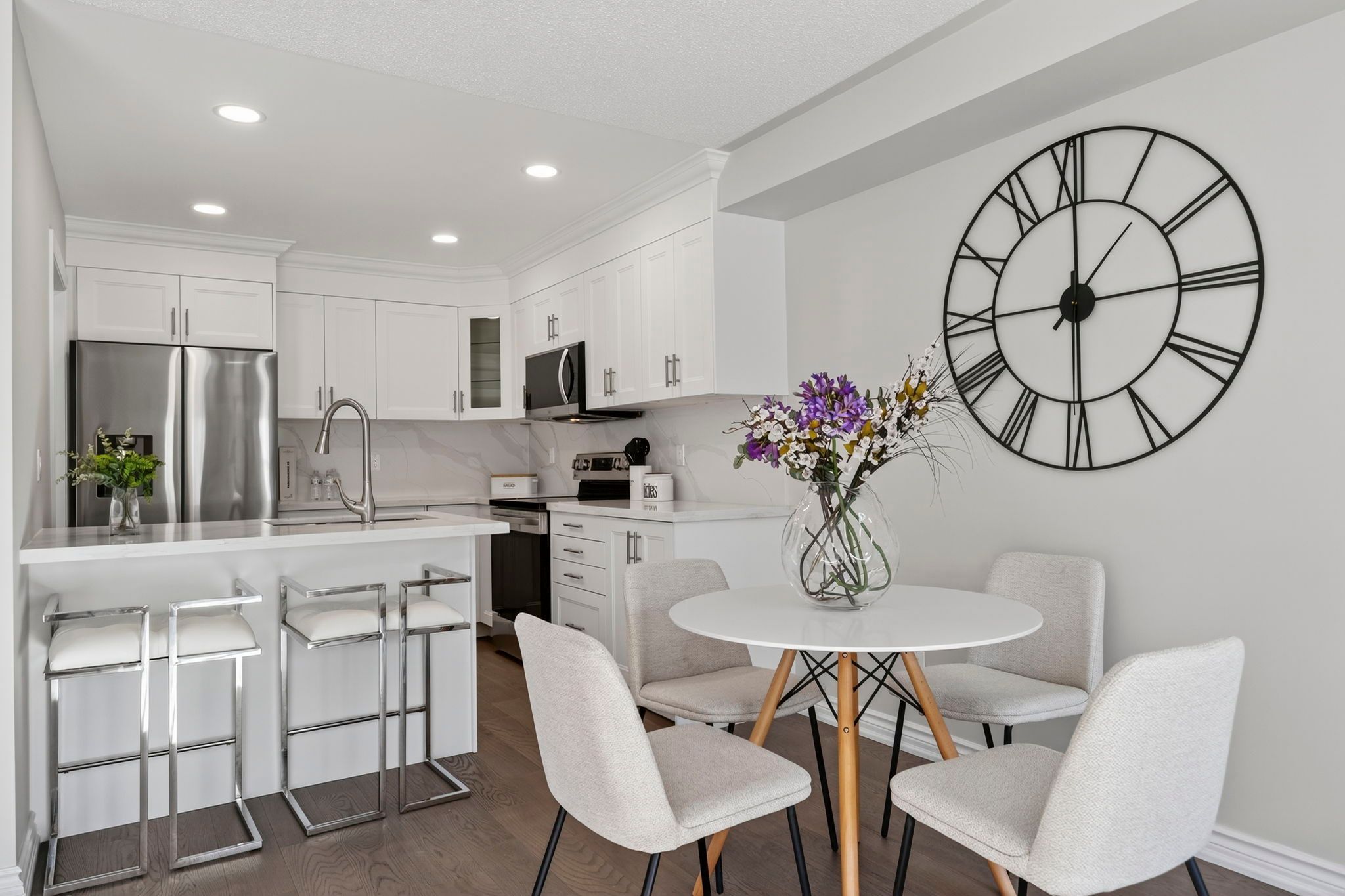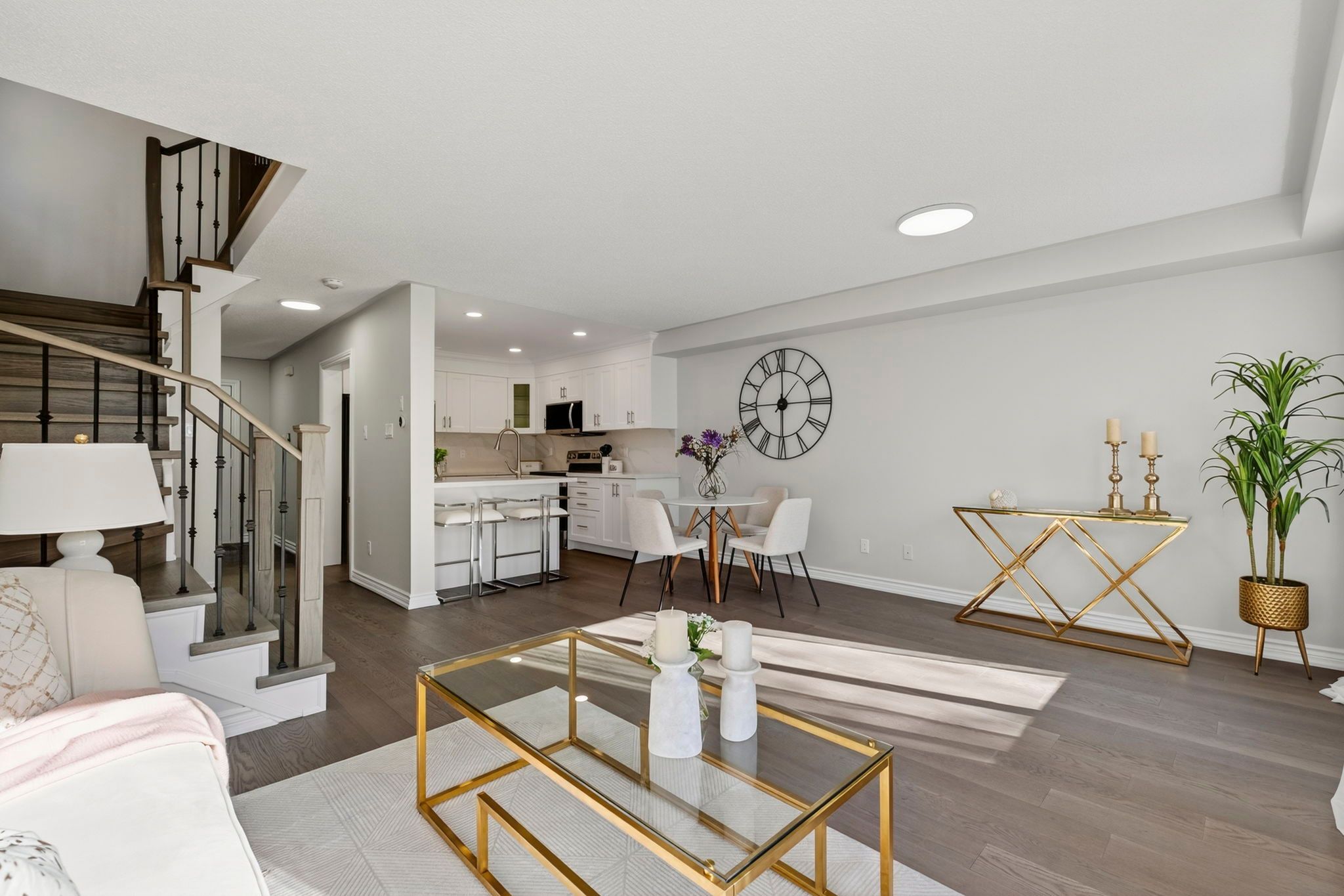 Fully renovated top to bottom in 2025! This stunning move-in-ready end-unit townhome has been completely transformed with modern finishes and timeless style. Featuring a brand-new kitchen with quartz countertops and matching quartz backsplash, undermount sink, a built-in microwave hood range, stylish hardware, and all-new stainless steel appliances. Thoughtfully designed cabinetry includes elegant glass accent cabinets for added charm and display. Every washroom has been tastefully updated with new vanities, toilets, fixtures, and hardware. Freshly and professionally painted throughout, including walls and ceilings. Enjoy new hardwood floors throughout the first and second floor - completely carpet-free - along with a custom oak staircase featuring elegant iron picket railings. New window coverings have been installed in the primary bedroom, living room, and dining room. Additional updates include a 2-year-old furnace for peace of mind and a well-maintained roof approximately 12 years old. The oversized primary bedroom is a true retreat, offering a spacious layout with a cozy seating area and featuring his-and-hers closets for exceptional storage and comfort. The fully finished basement offers even more living space with laminate flooring - perfect for entertainment, a family room, or a home office. Step outside to a brand-new walk-out deck overlooking an oversized, fully-fenced yard - ideal for entertaining or relaxing. The front of the home showcases a freshly paved driveway, professionally painted garage door, front door, and updated siding. Located in one of aurora's most family-friendly neighbourhoods, just steps to beautiful parks, grocery stores, a movie theatre, scenic trails, excellent schools, and daycares. Close to the go train, bus routes, public transit, and hwy 404. A rare opportunity to own a turn-key home in an unbeatable location!